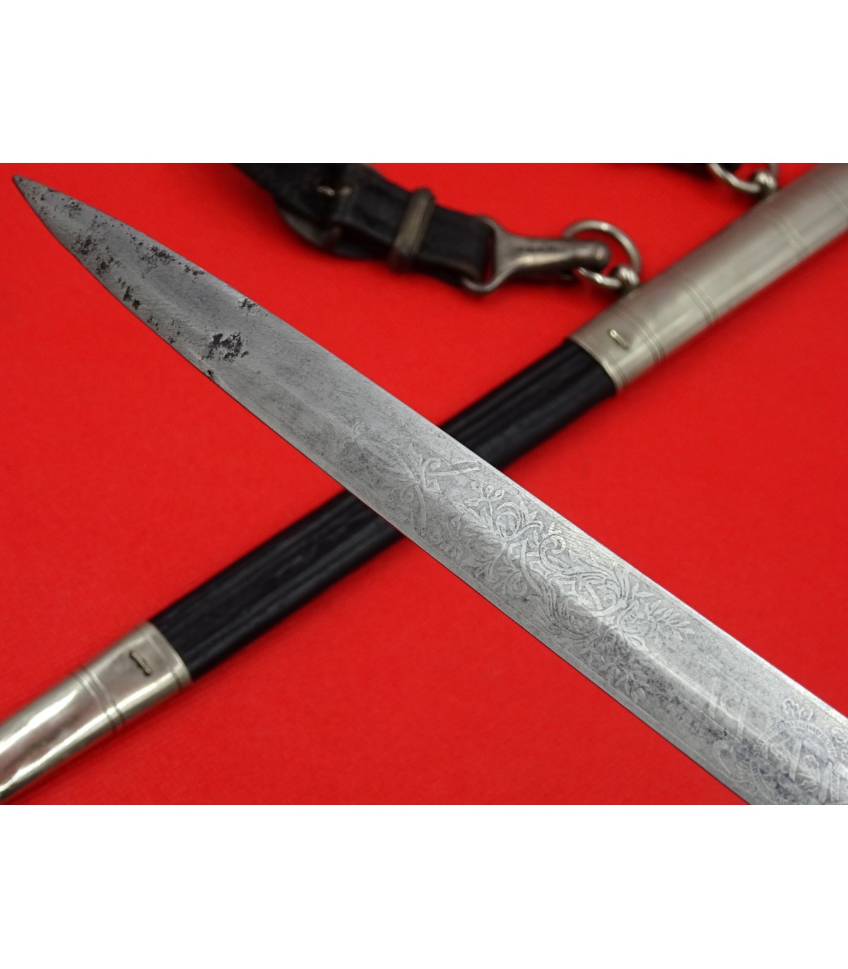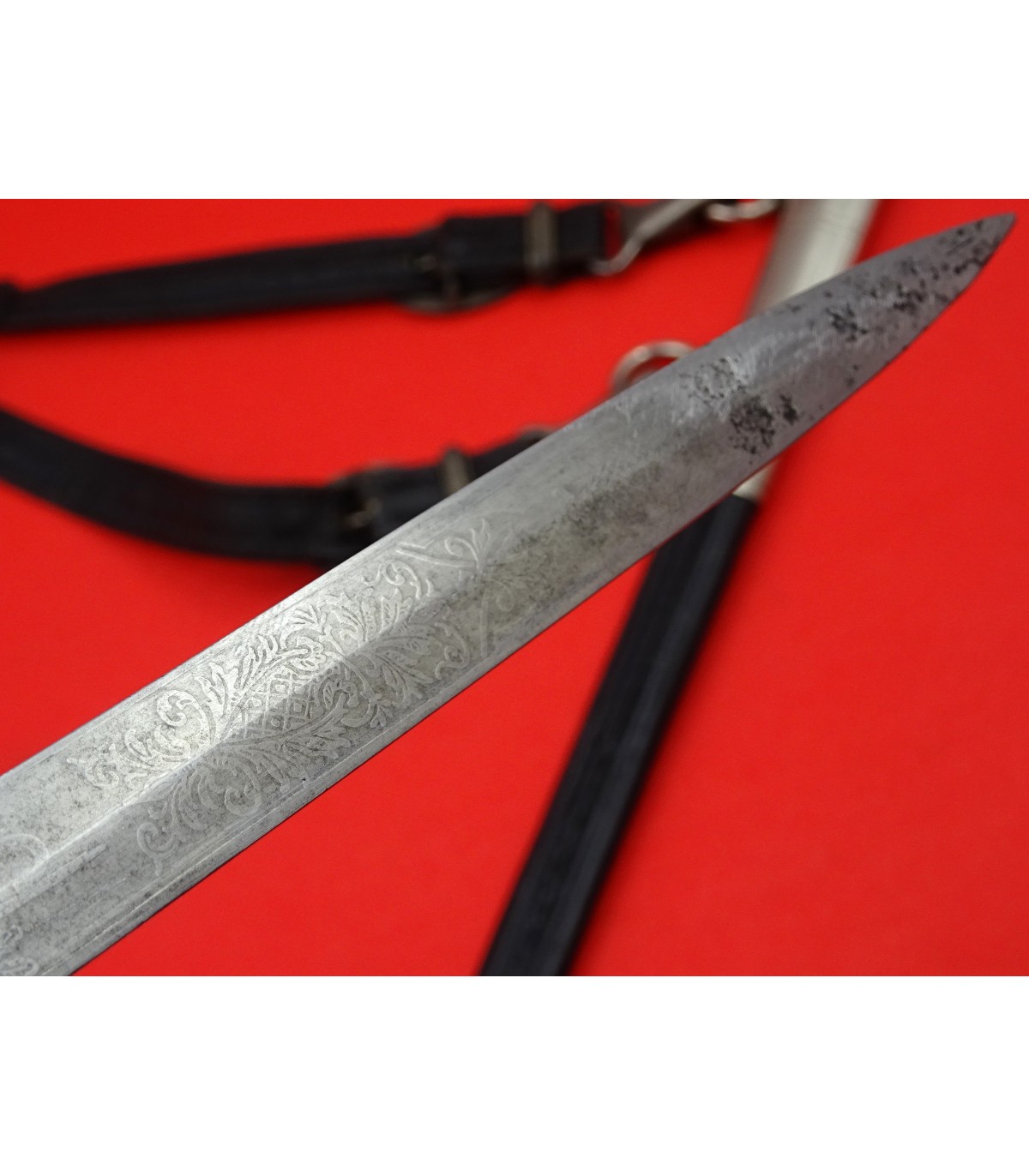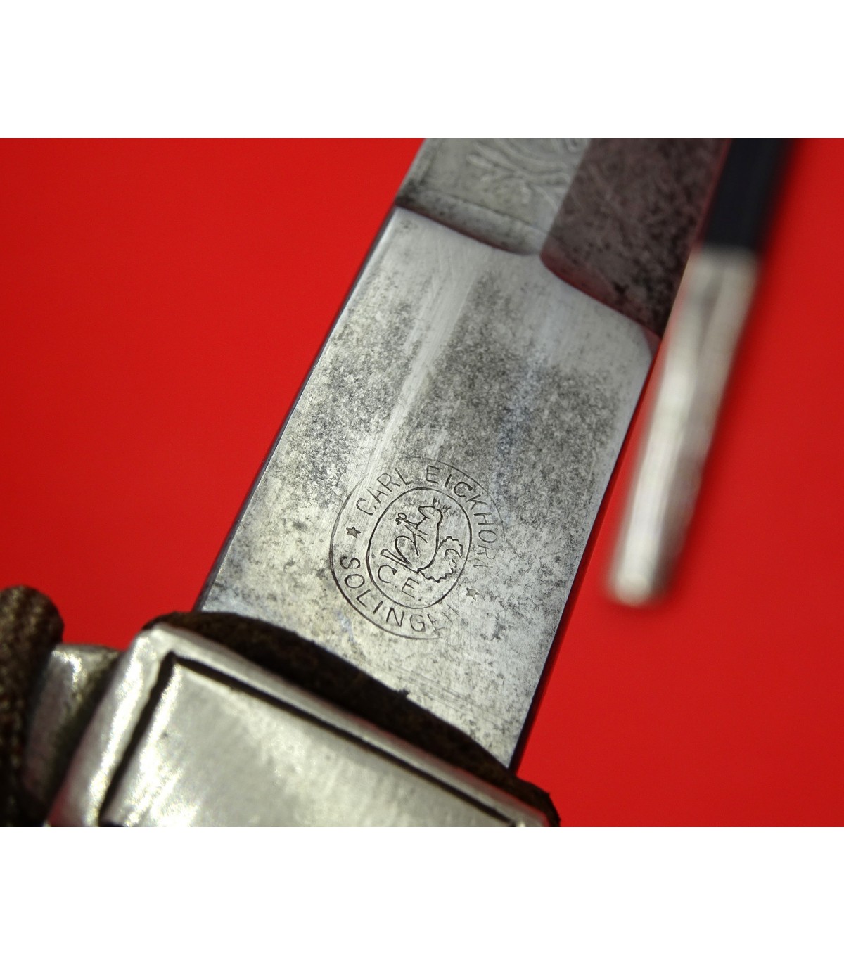 Lama con decorazioni incise su entrambi i lati. Fodero e impugnatura in pelle, finiture nichelate. Con la sua rarissima cinghia specifica e la sua bélière, compreso il passante per la cintura. Pugnale molto raro in BE-TBE.