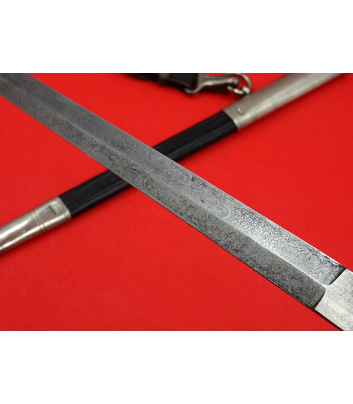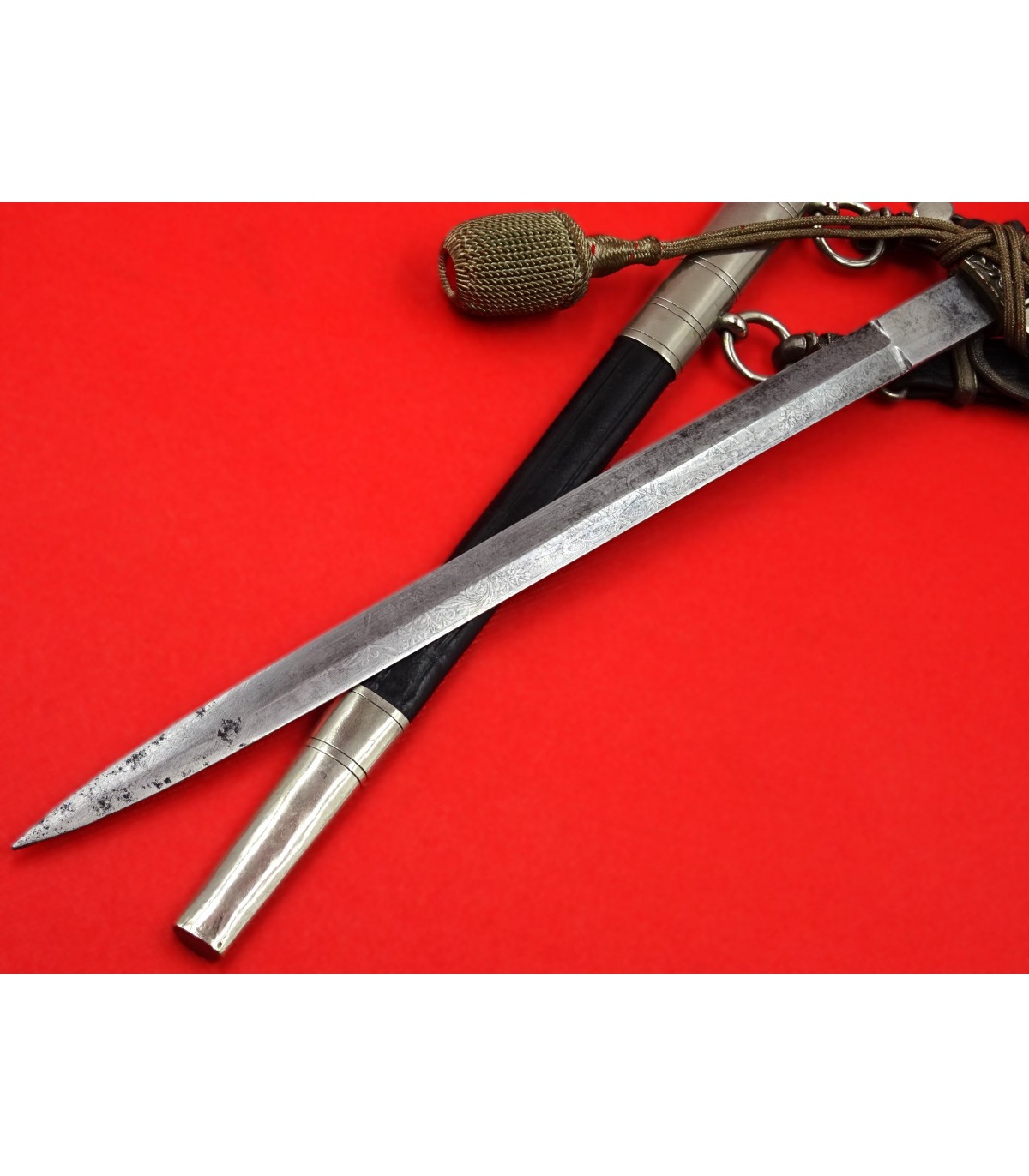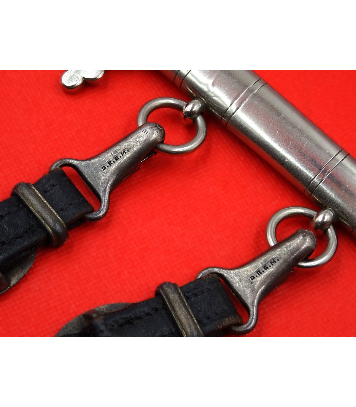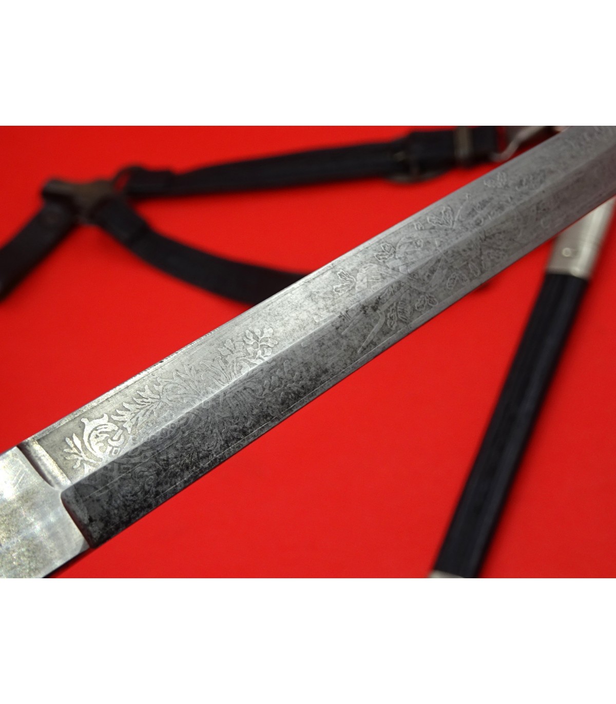 Lama con decorazioni incise su entrambi i lati. Fodero e impugnatura in pelle, finiture nichelate. Con la sua rarissima cinghia specifica e la sua bélière, compreso il passante per la cintura. Pugnale molto raro in BE-TBE.