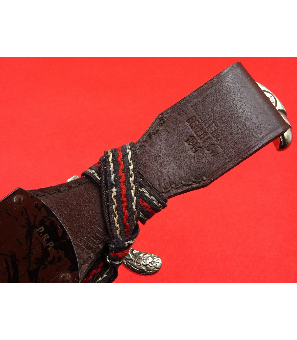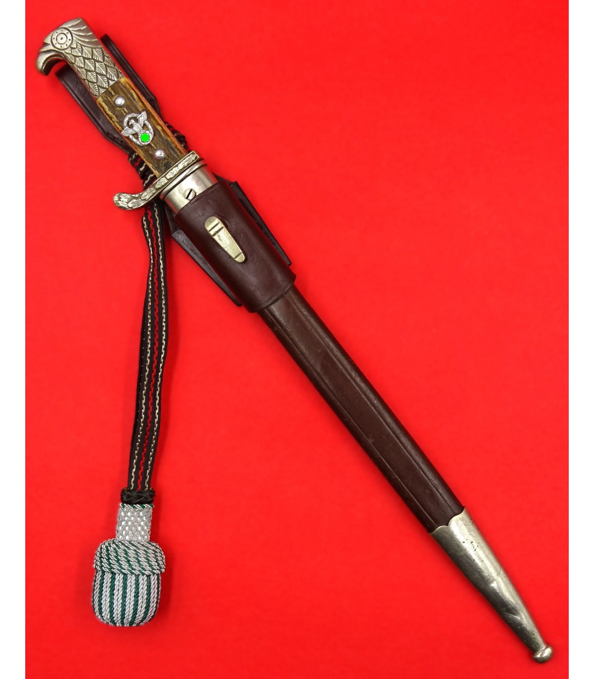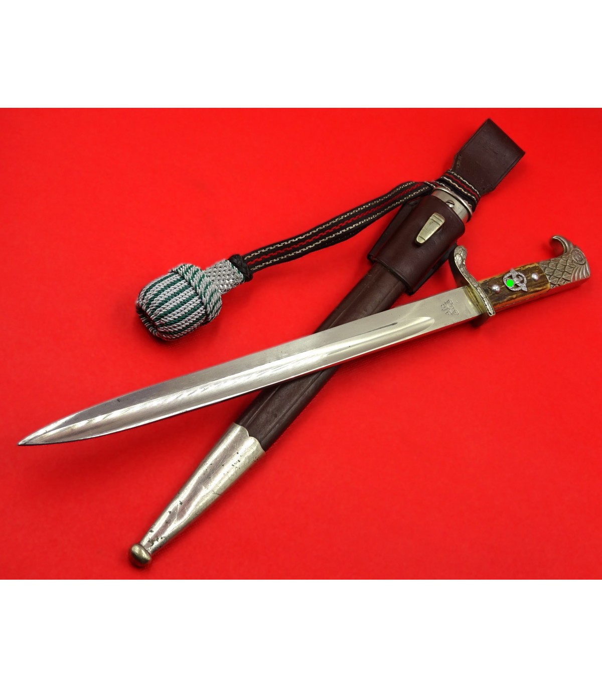 Completo di soffietto e cinghia. Tassello e fodero in pelle marrone. Accessori in argento nichelato. Placche di corno, aquila in alluminio. Numeri diversi di guardia e fodero. OTTIME CONDIZIONI.