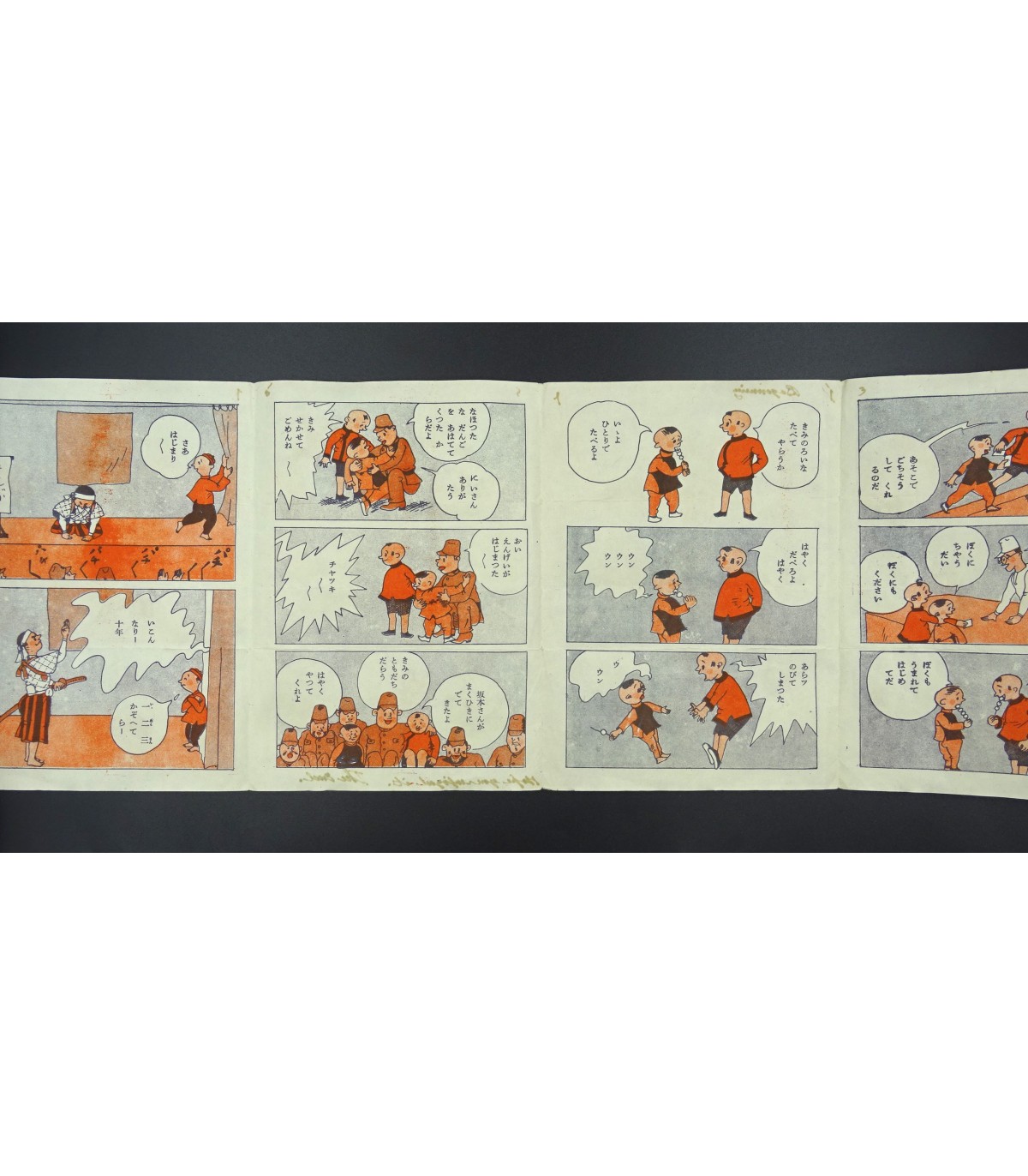 Sabre d'enfant et bande dessinée (samouraï et soldats), petit fanion japonais, 4 pochettes en soie peintes main, un mouchoir décoratif en soie représentant un samouraï. Intéressant. BE.