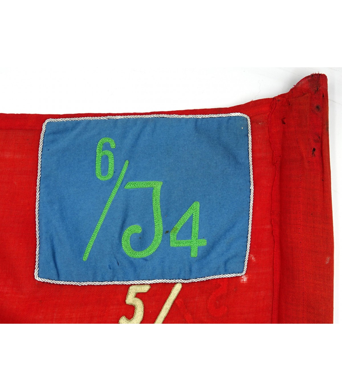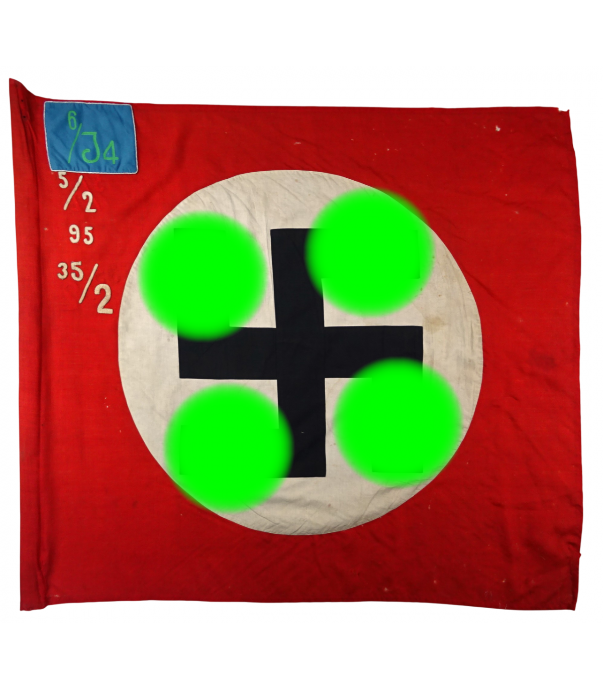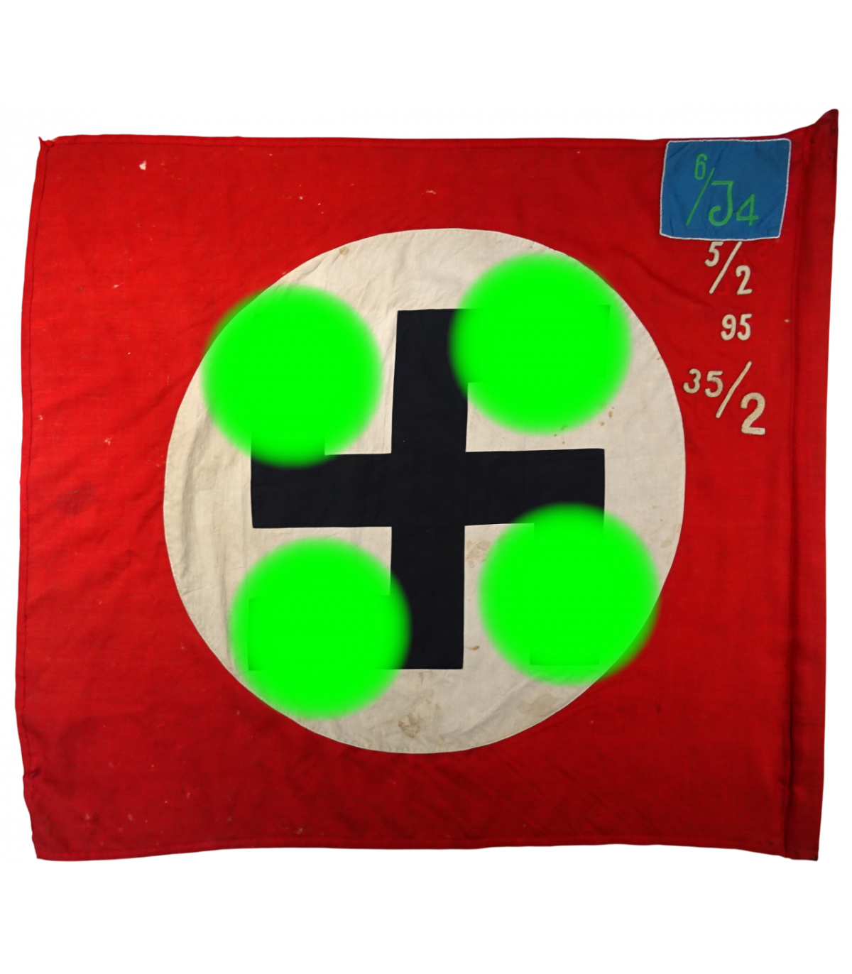 Rara Sturmfahne 6/J4 con numeri aggiuntivi delle unità che portano questa bandiera tradizionale. Cartiglio blu cielo con ricamato il numero 6/J4, numeri aggiuntivi 5/2, 95 e 35/2 ricamati. Stame di lana. Svastica a destra delle prime bandiere. Alcuni fori di tarme. Dimensioni 125x135. Molto raro. BE-.