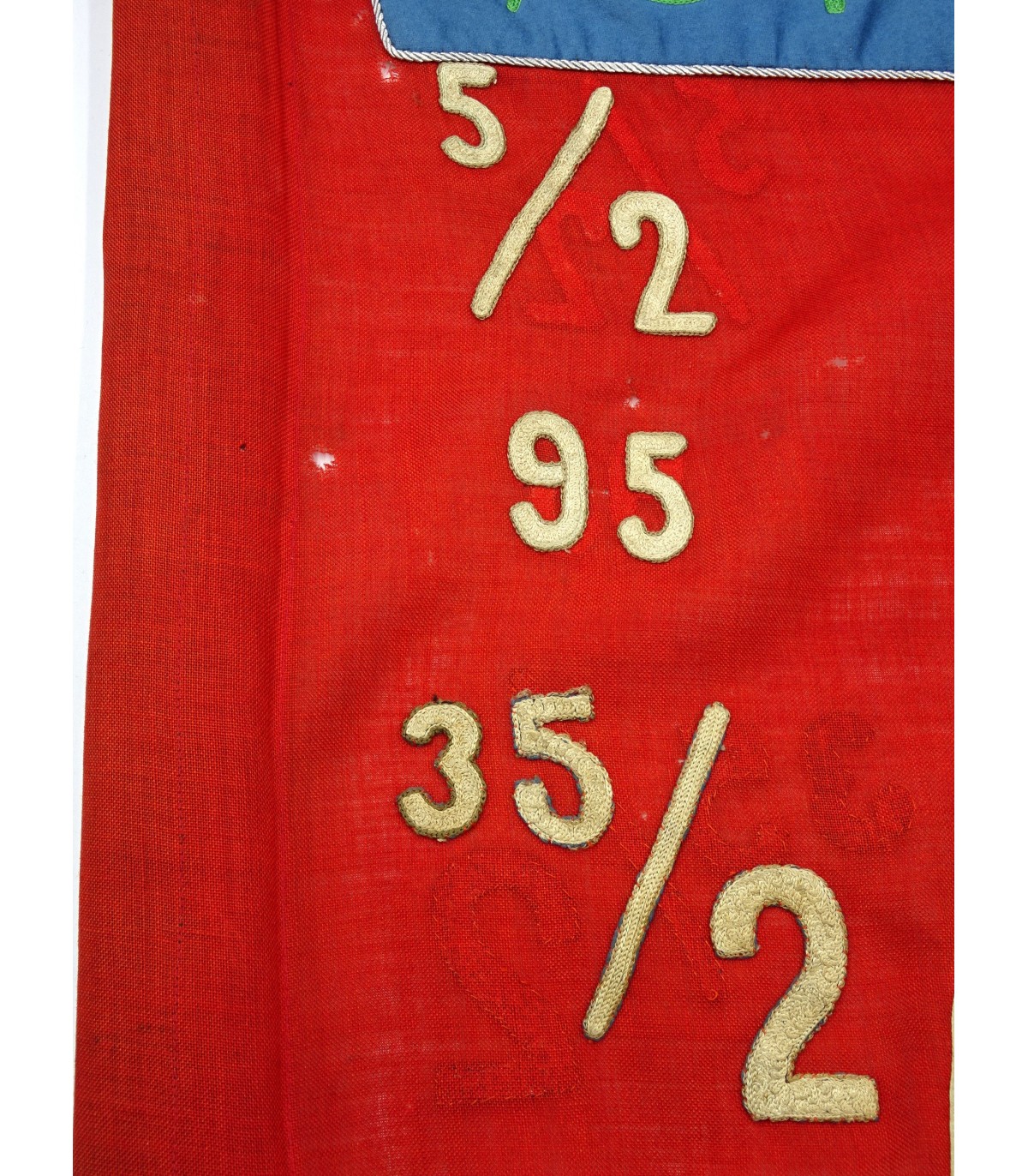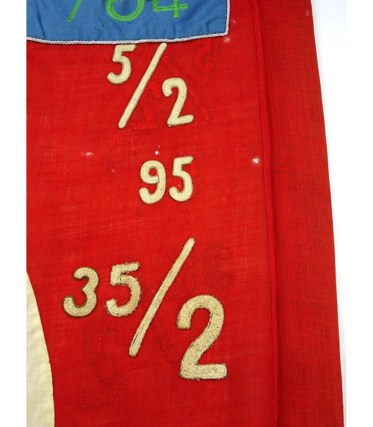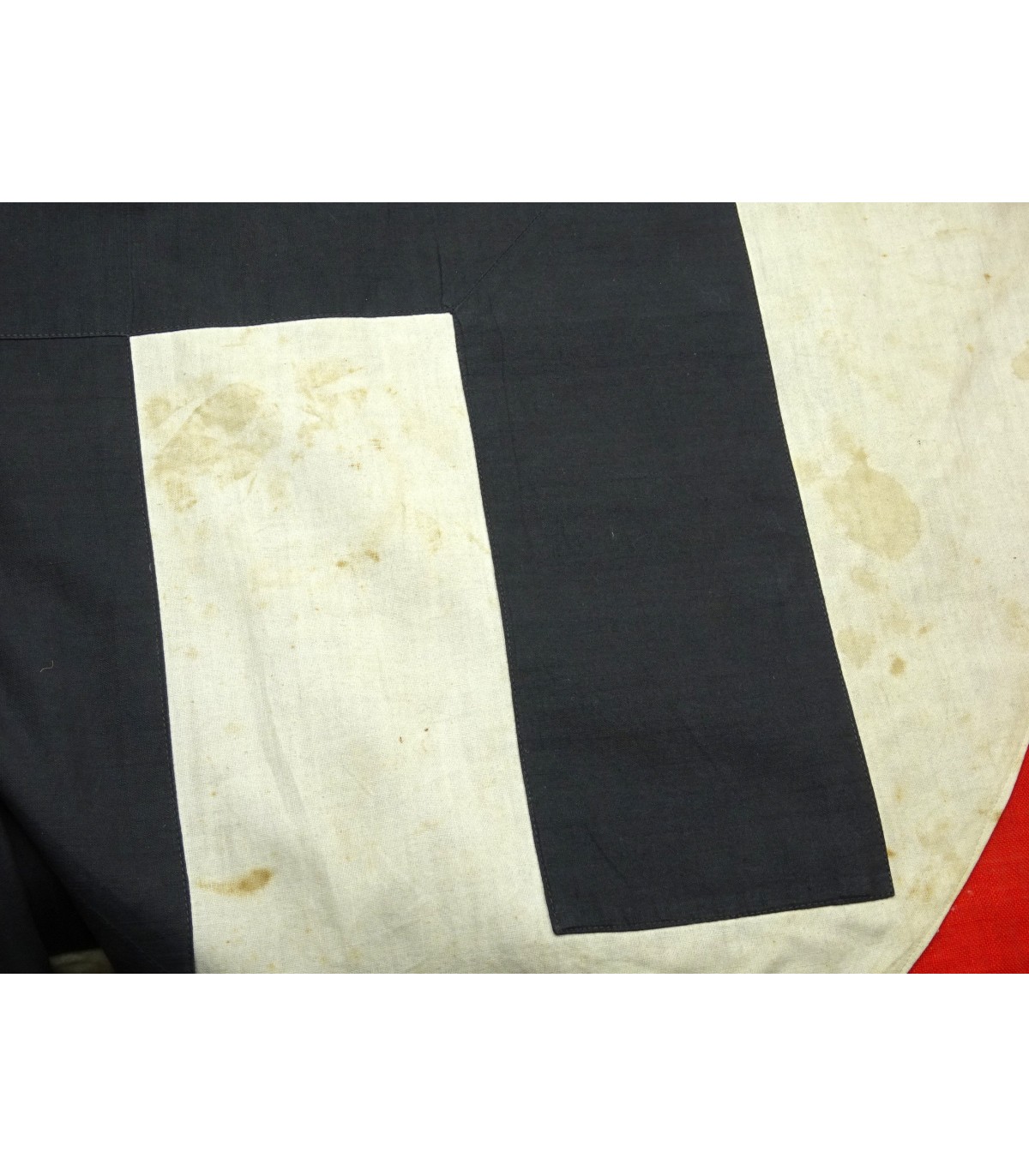 Rara Sturmfahne 6/J4 con numeri aggiuntivi delle unità che portano questa bandiera tradizionale. Cartiglio blu cielo con ricamato il numero 6/J4, numeri aggiuntivi 5/2, 95 e 35/2 ricamati. Stame di lana. Svastica a destra delle prime bandiere. Alcuni fori di tarme. Dimensioni 125x135. Molto raro. BE-.