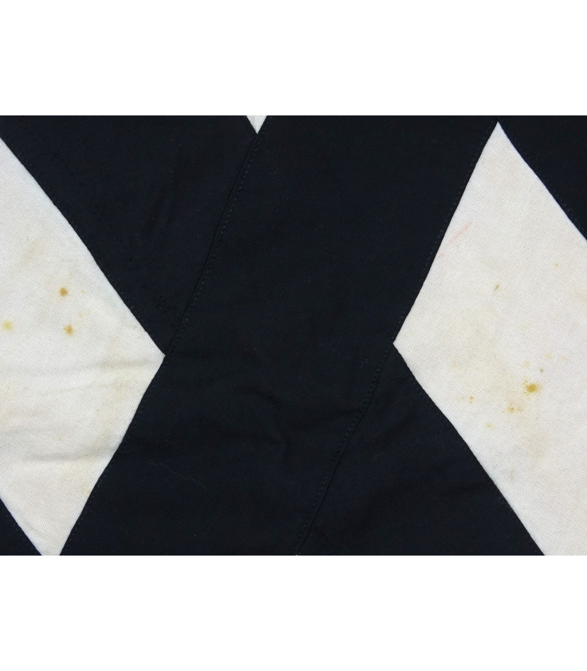 Motivo centrale cucito. 7 anelli in alluminio. Cartiglio nero con ricamo "Wien" in argento. Frange argentate. Etichetta tessuta Paul Löb Wien. Dimensioni 140x120 escluse le frange. TBE. Estremamente raro.