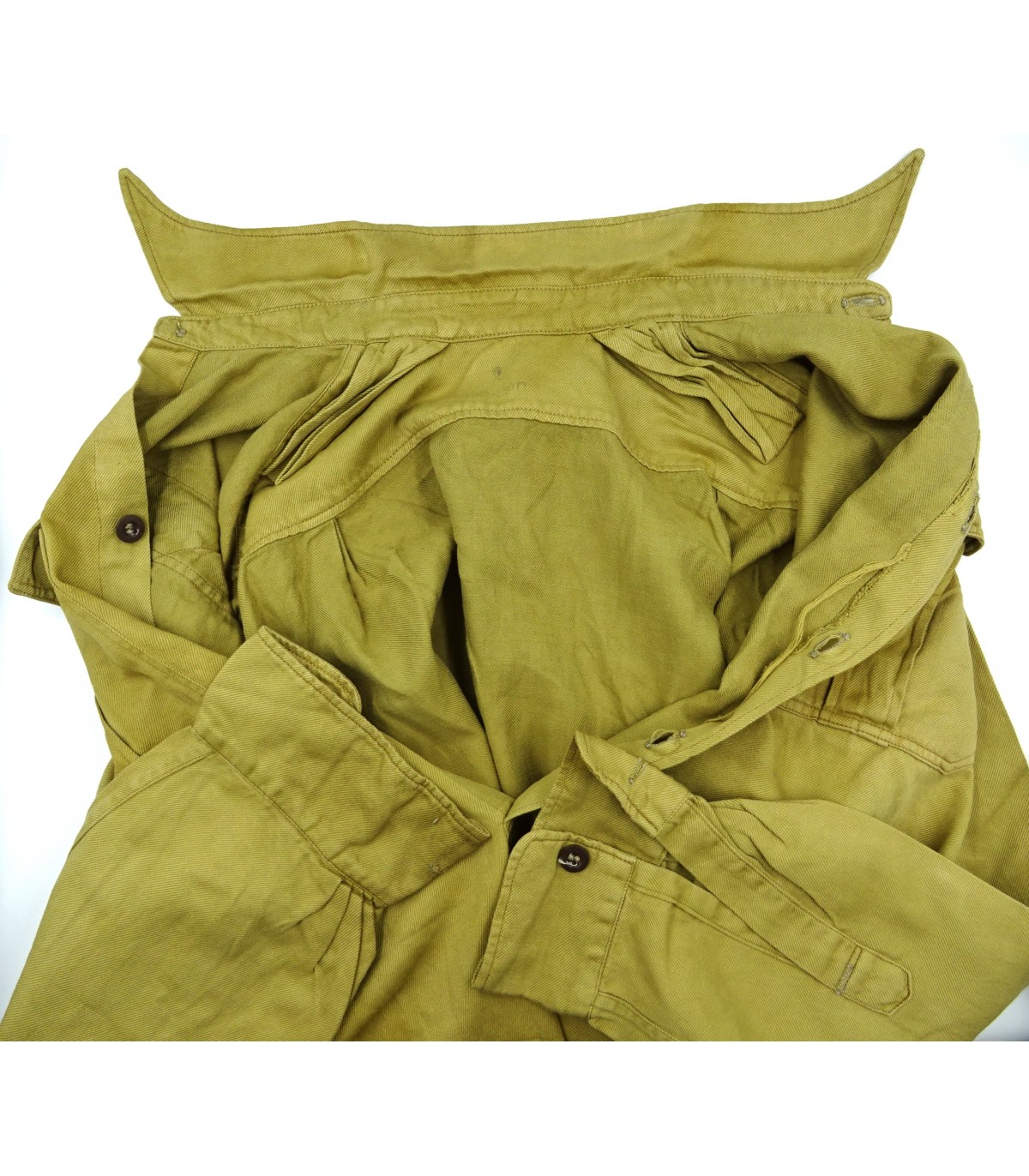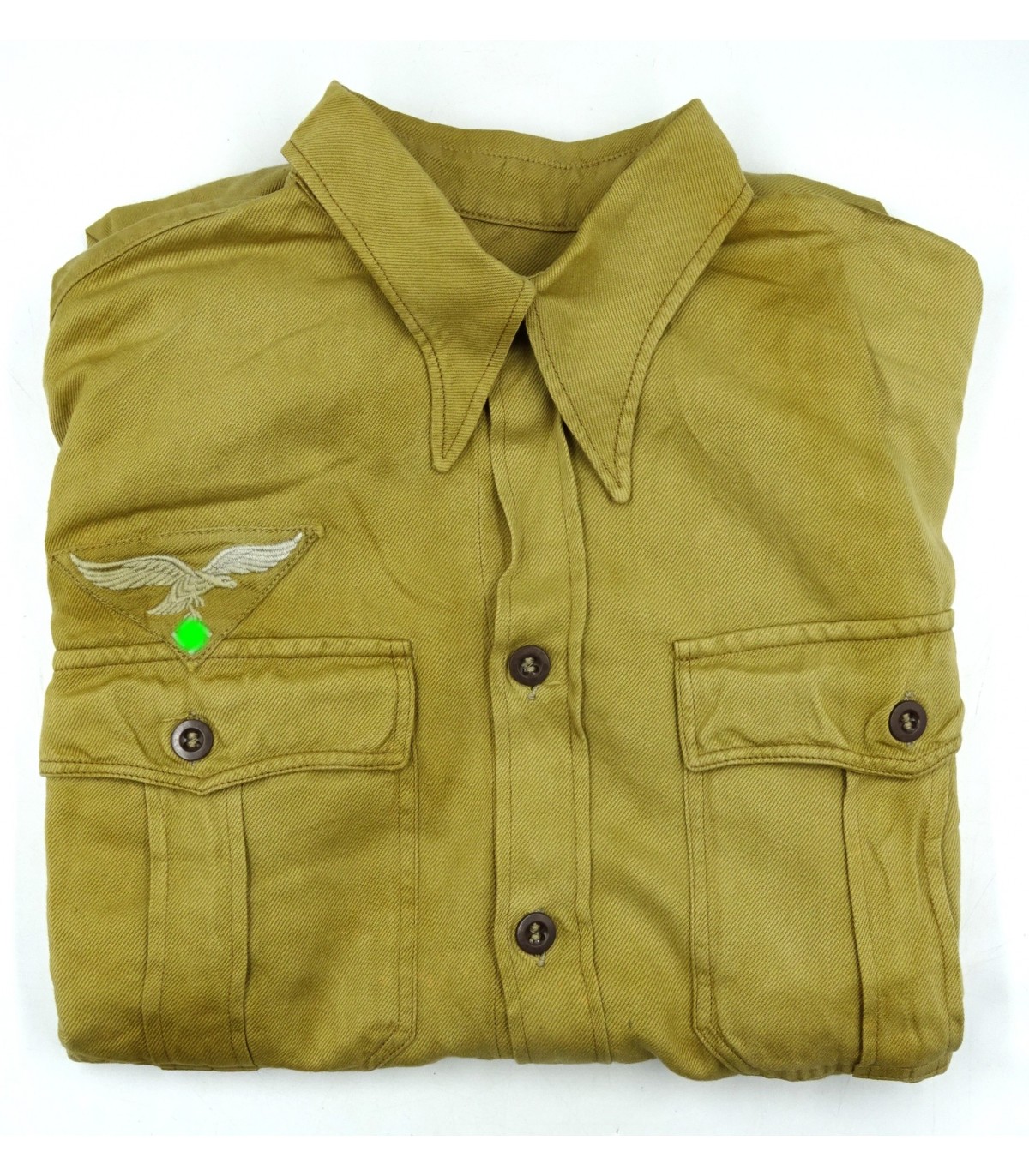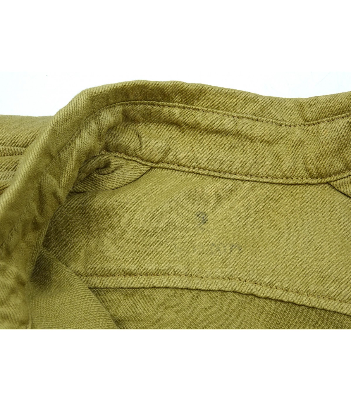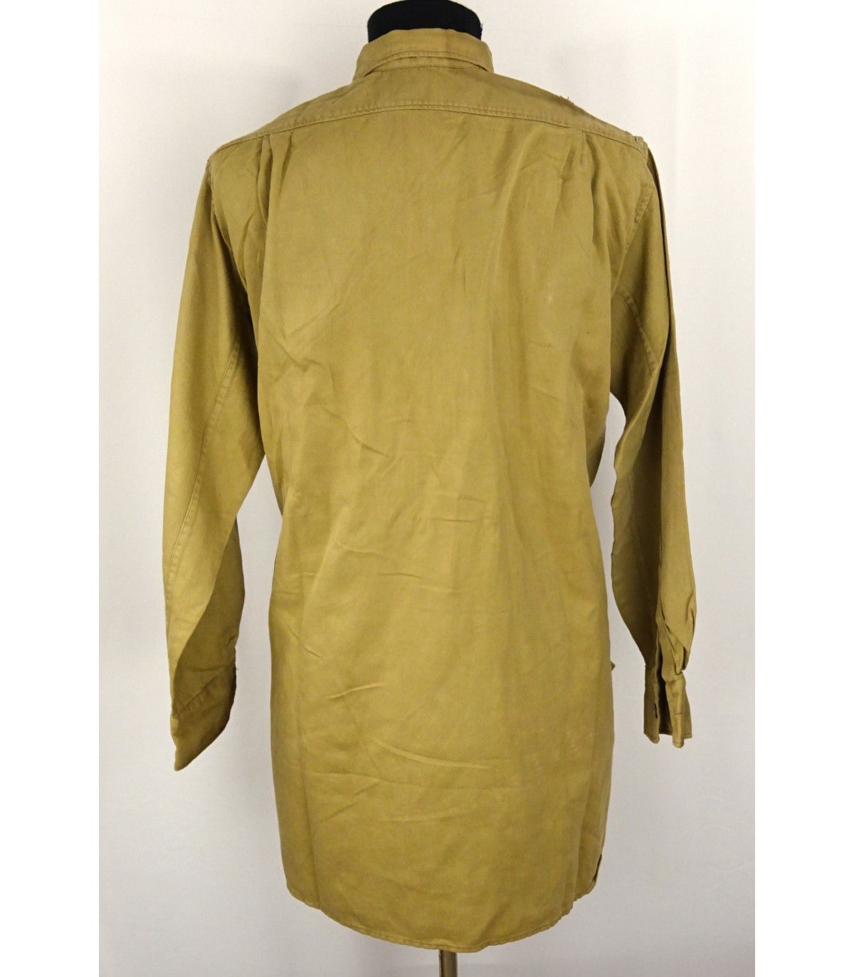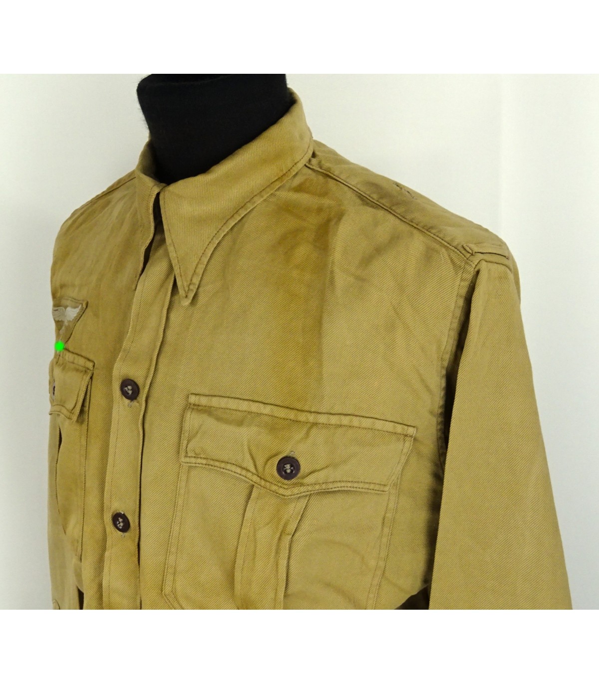 Maniche lunghe. Tasche sul petto. Abbottonatura a mezzo bottone. Aquila sul petto ricamata a macchina su sfondo triangolare sabbia. Bottoni marrone corrozo. Passanti per spalline. Marchio sul collo, poco leggibile. Condizioni di magazzino.