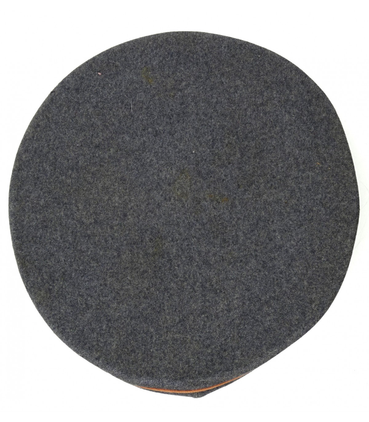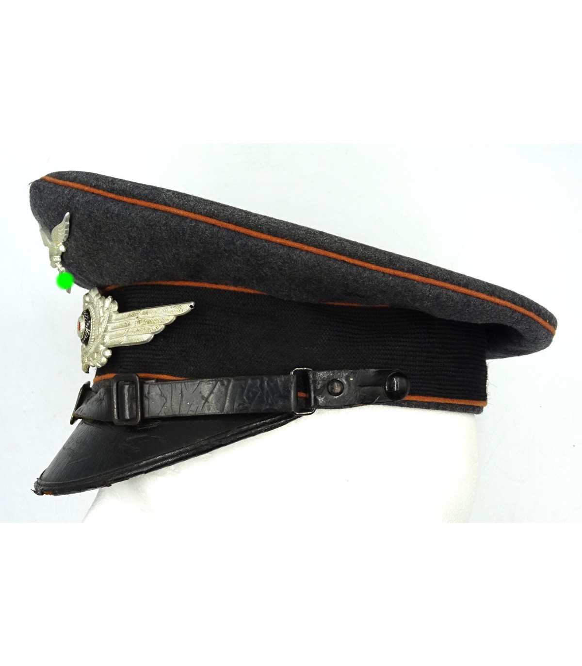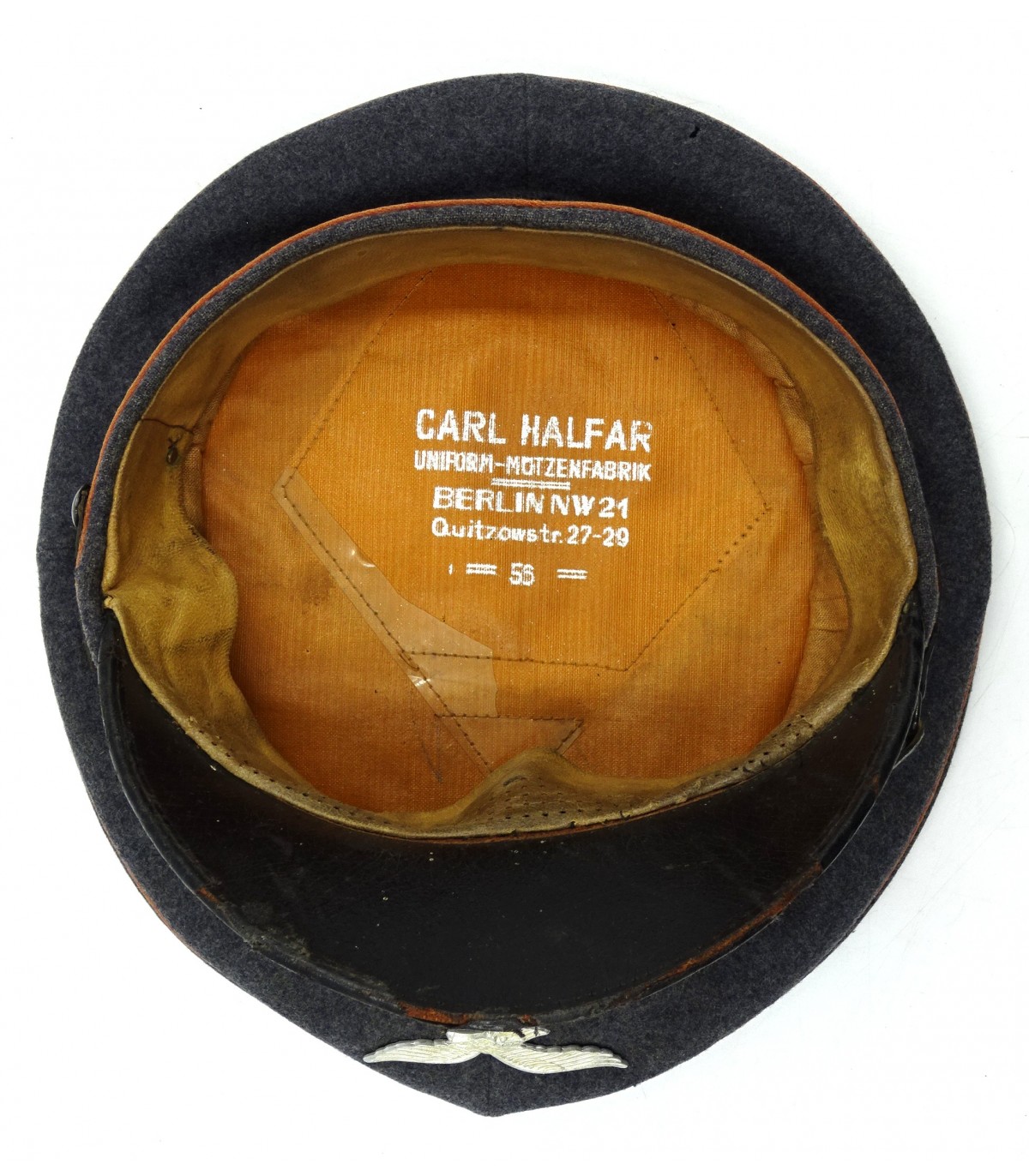 Completo. Distintivi in alluminio. Gambali in vernice nera. Fascia per capelli in mohair nero. Prodotto da Carl Halfar Berlin. ABE.