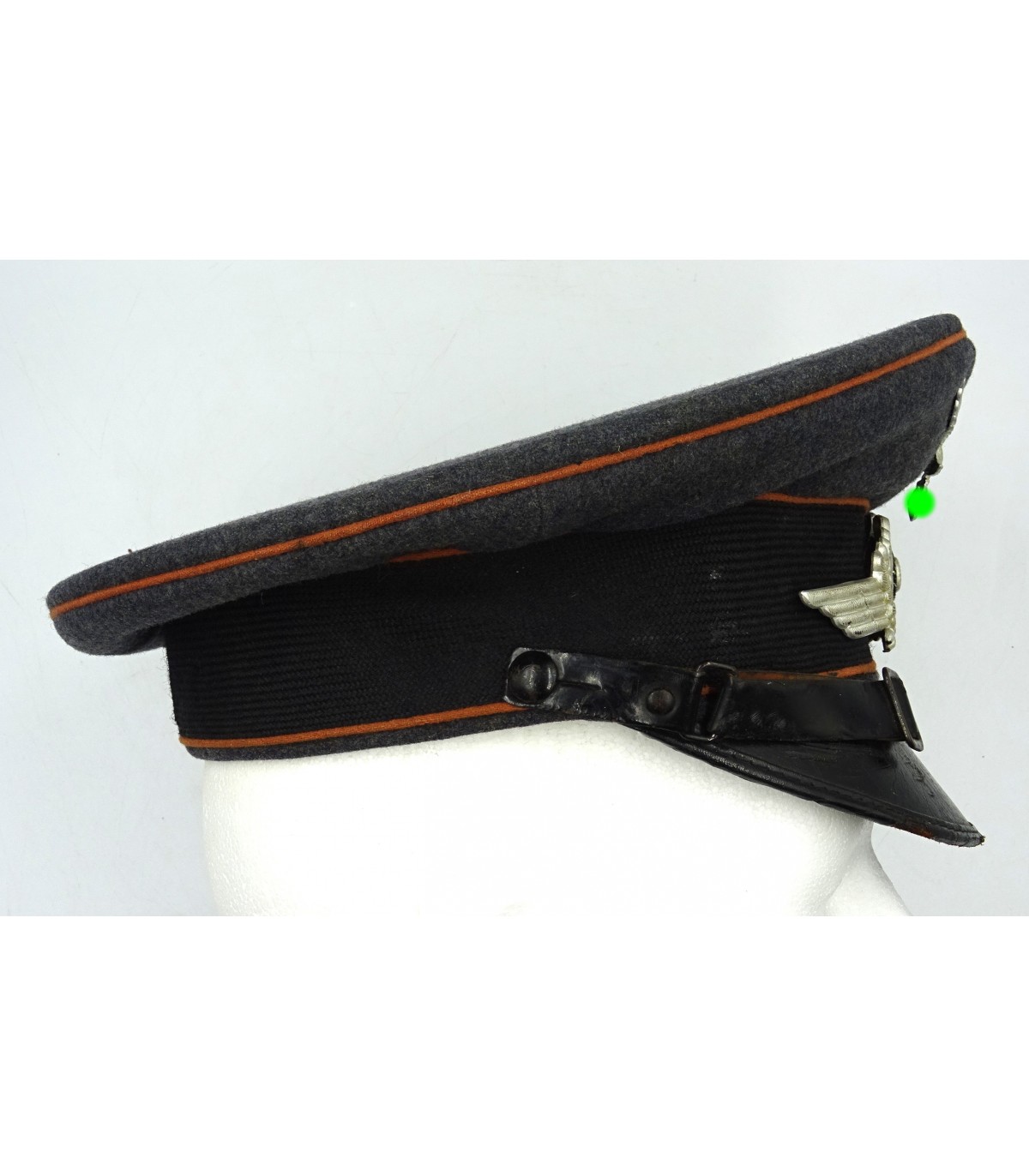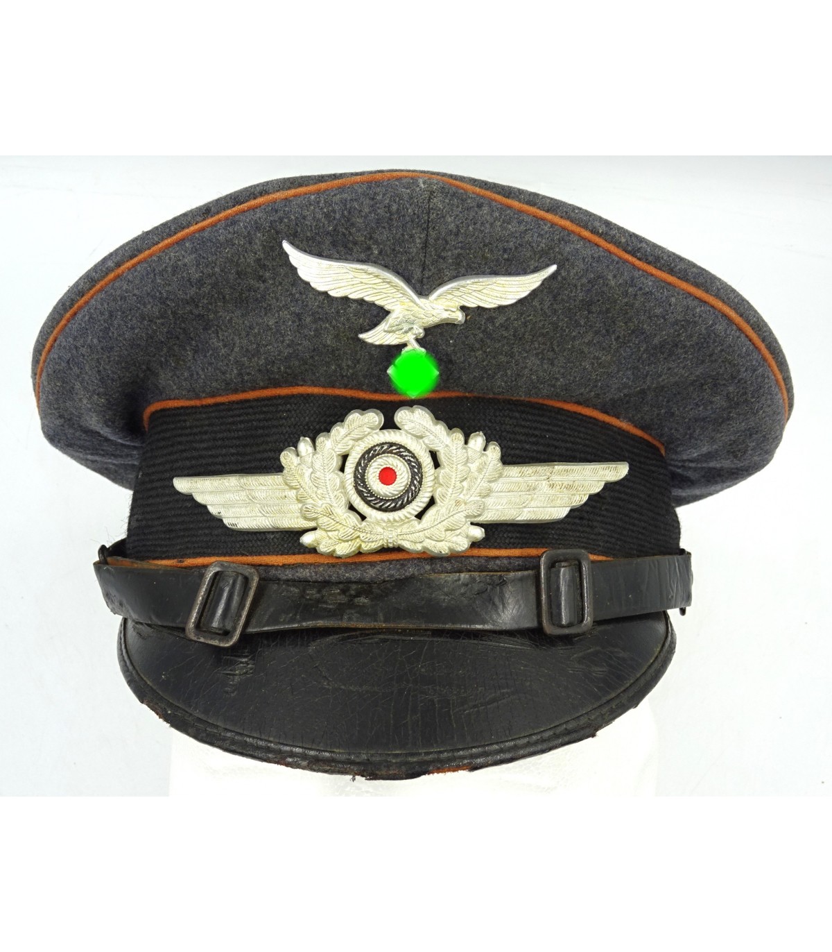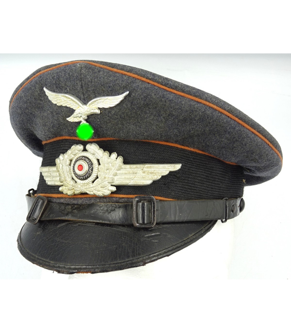 Completo. Distintivi in alluminio. Gambali in vernice nera. Fascia per capelli in mohair nero. Prodotto da Carl Halfar Berlin. ABE.