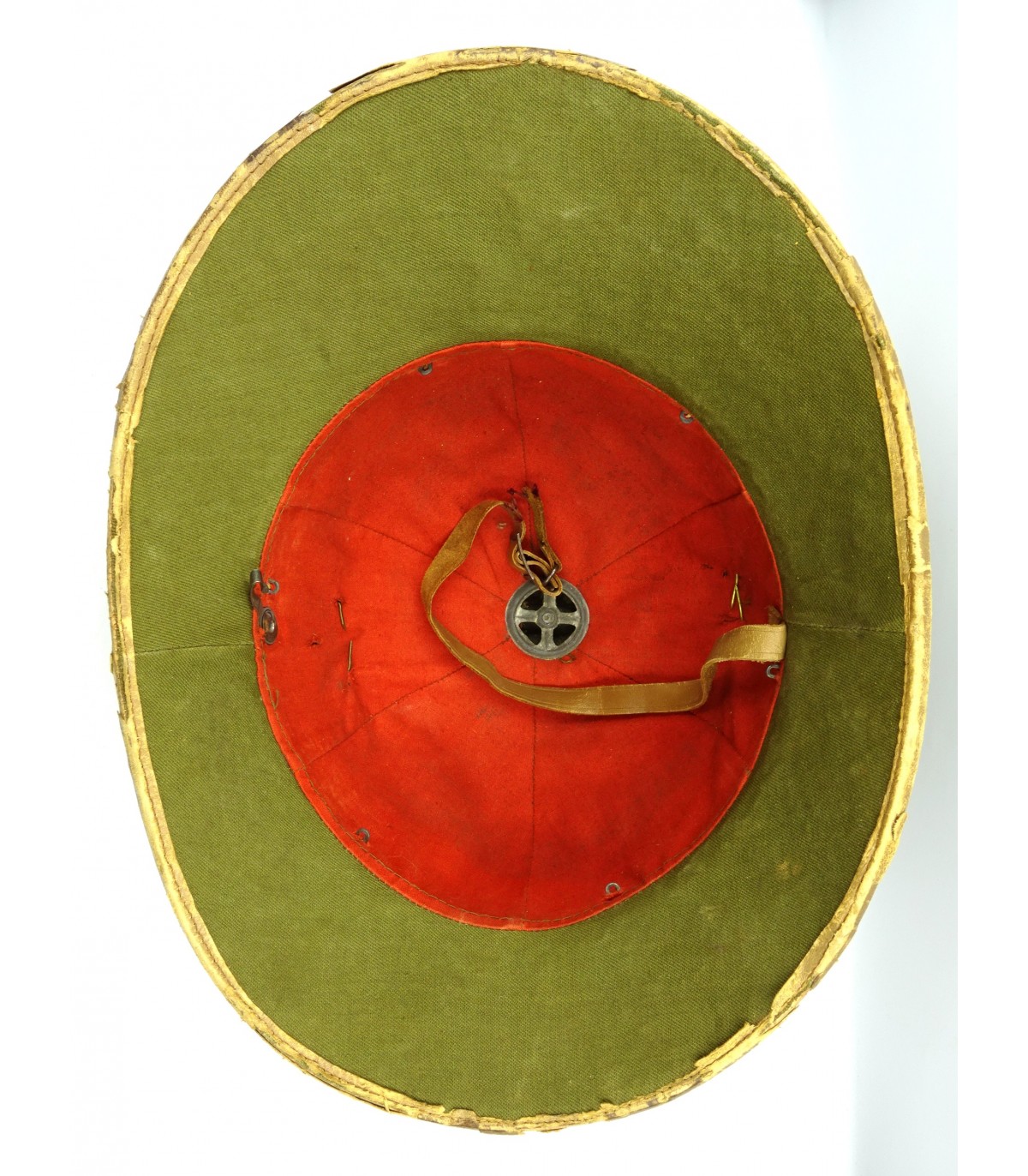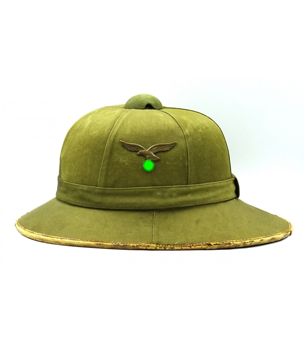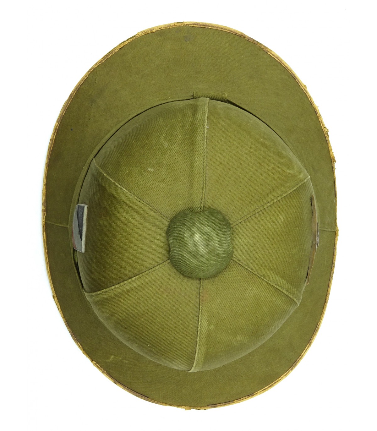Tela verde oliva, mostrine in metallo. Con sottogola rotto. Cappuccio in pelle mancante. BE/BE-.