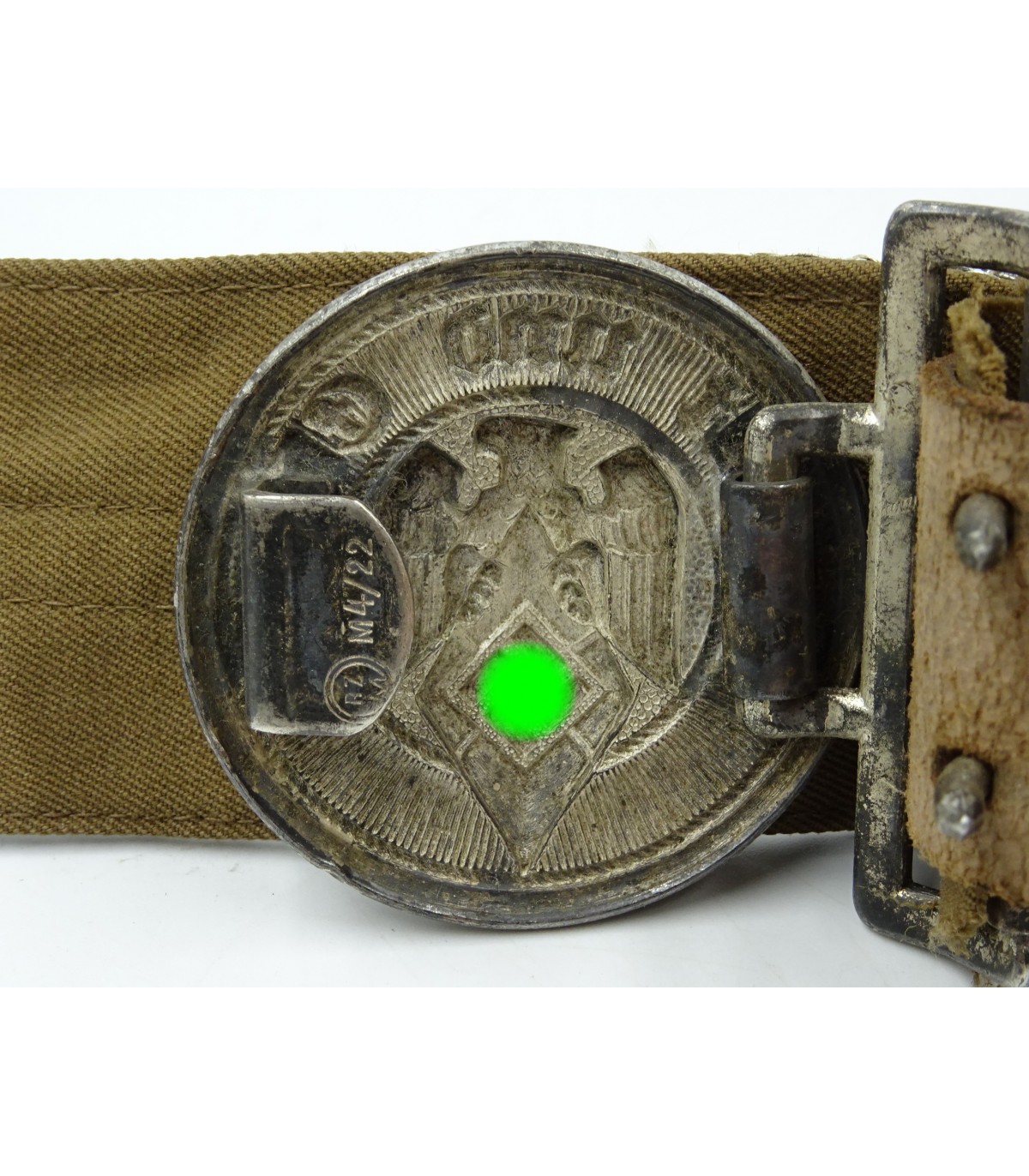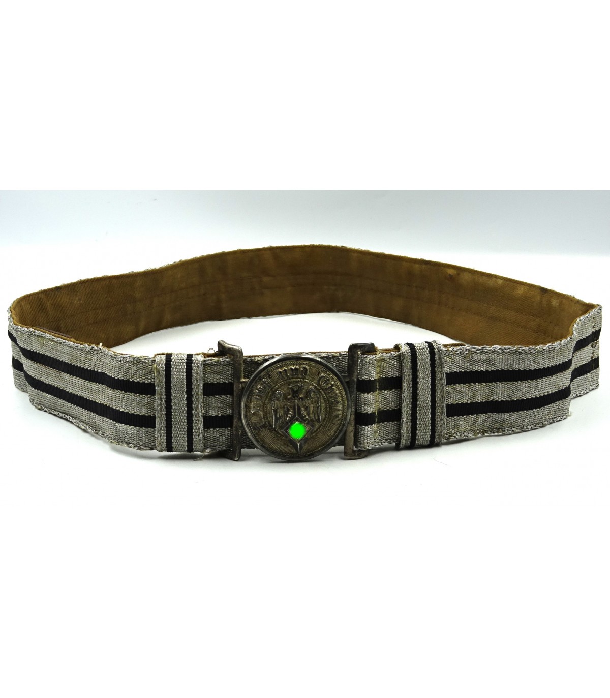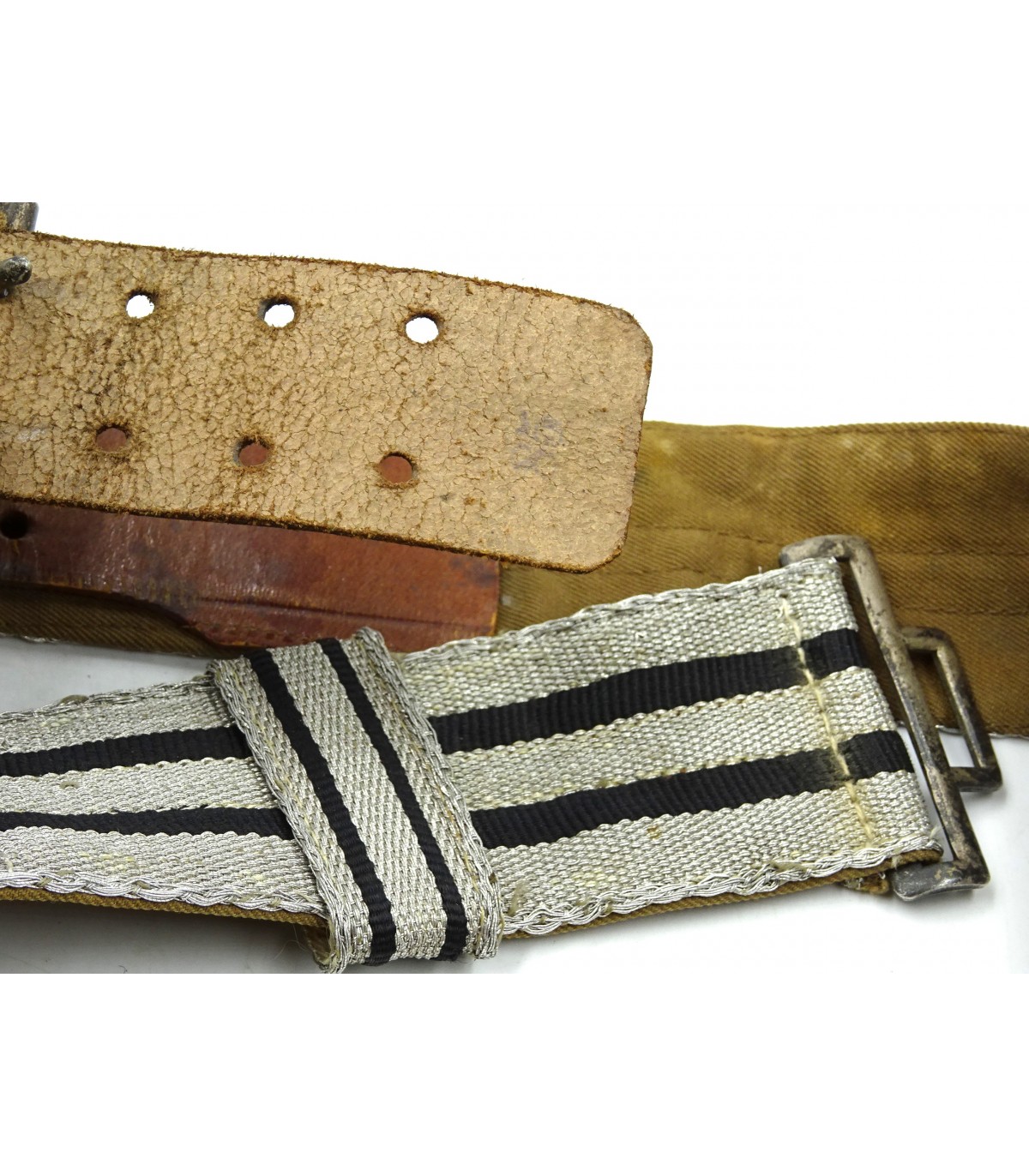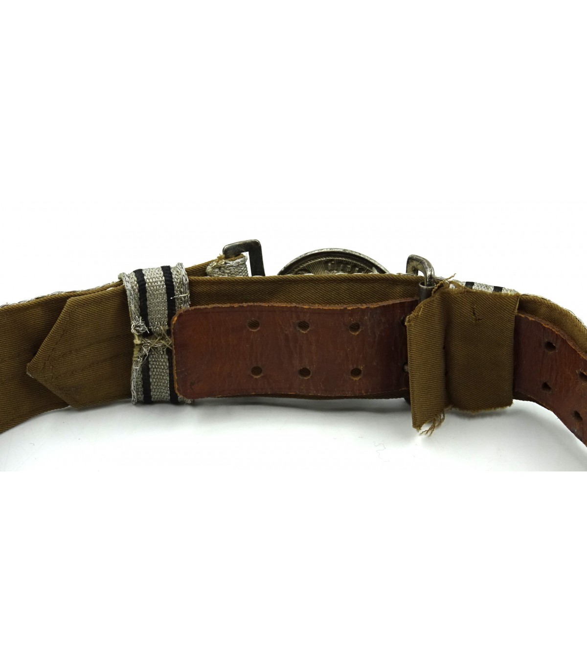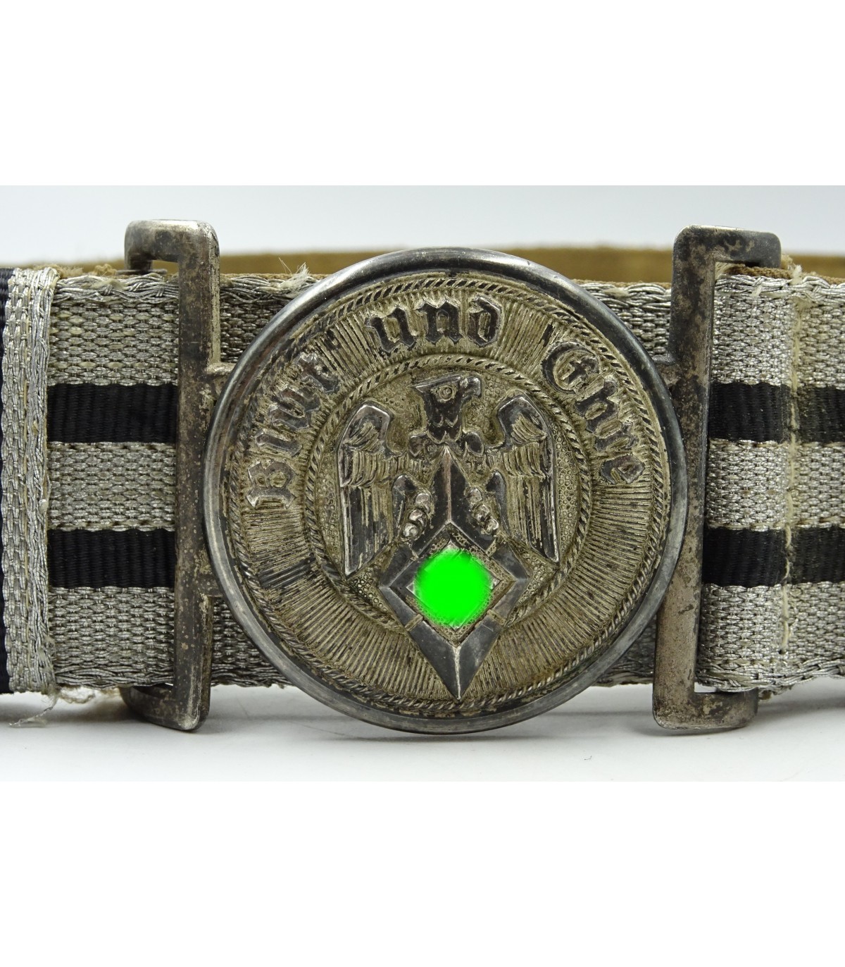 Feldbinde in broccato argento e nero, linguetta in pelle con 2 passanti. Fodera in tela marrone. Bella fibbia rotonda in alpacca, aquila HJ e motto Blut und Ehre. OTTIME CONDIZIONI.