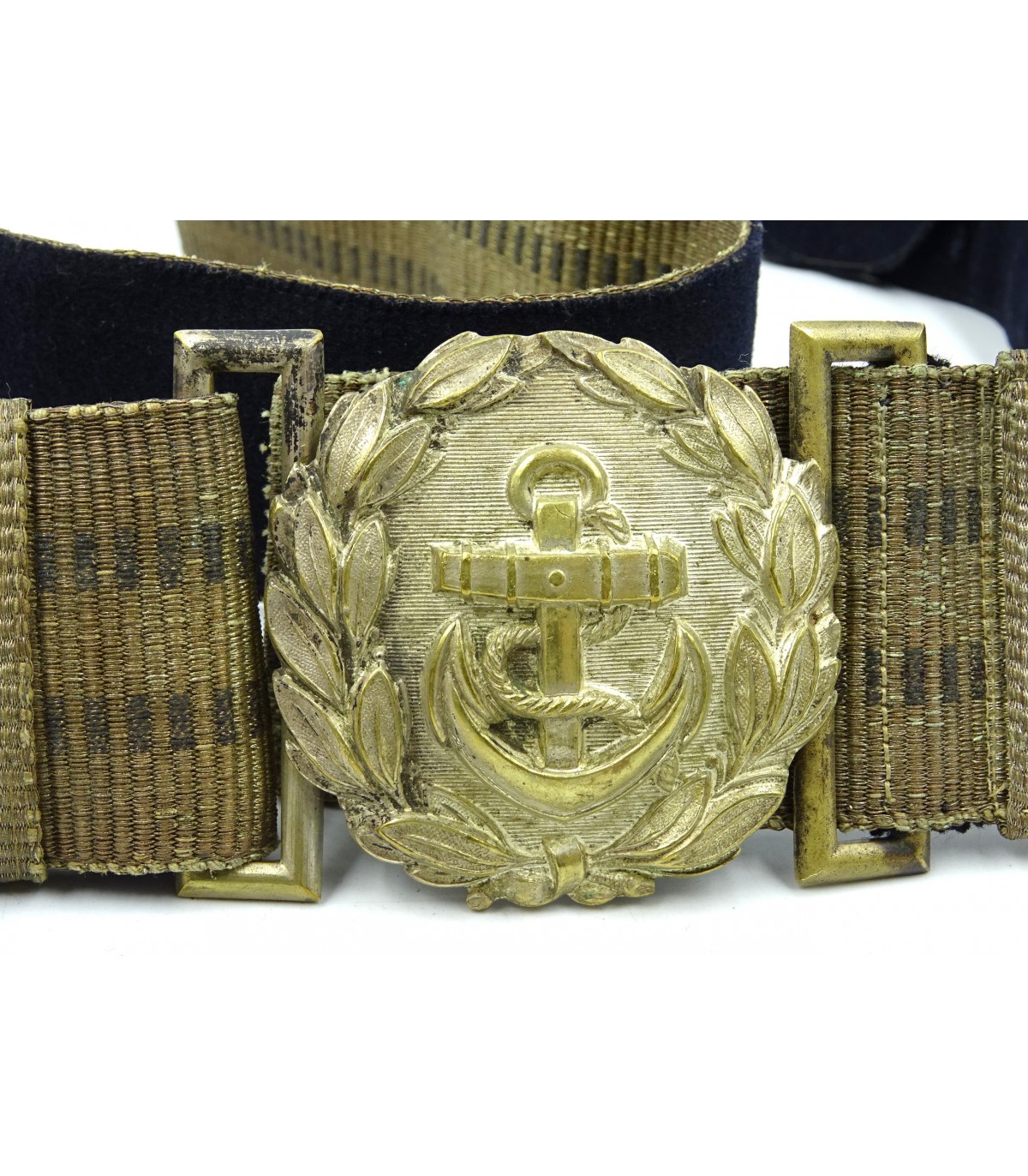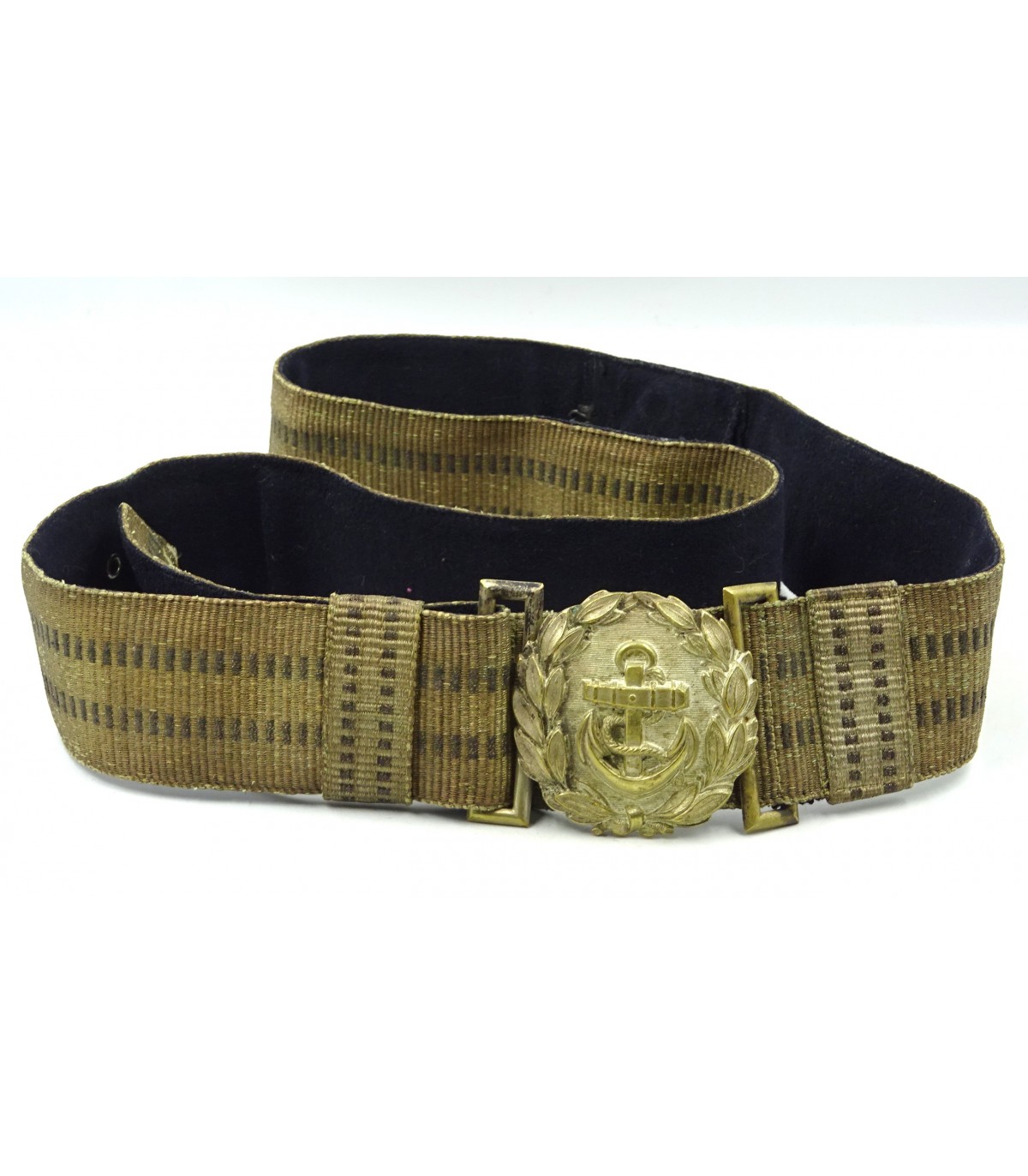 Fibbia in bronzo argentato. Broccato argento e blu navy. Con 2 passanti. Buona manifattura precoce. BE-TBE.