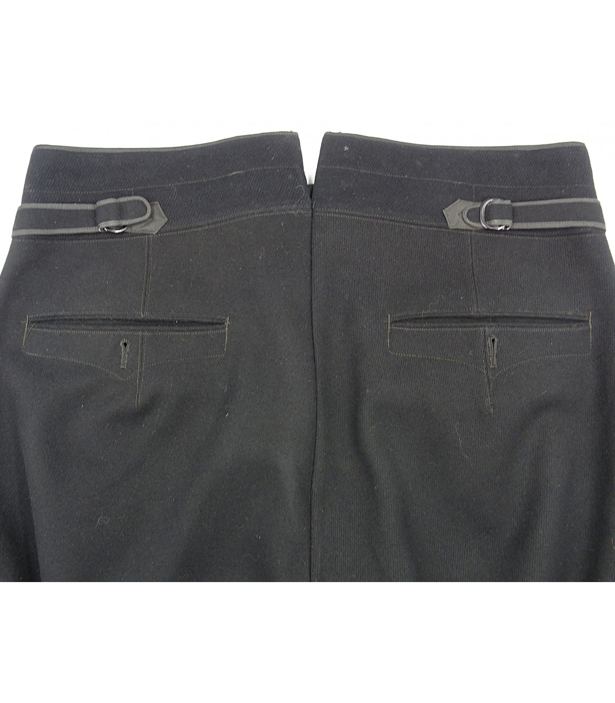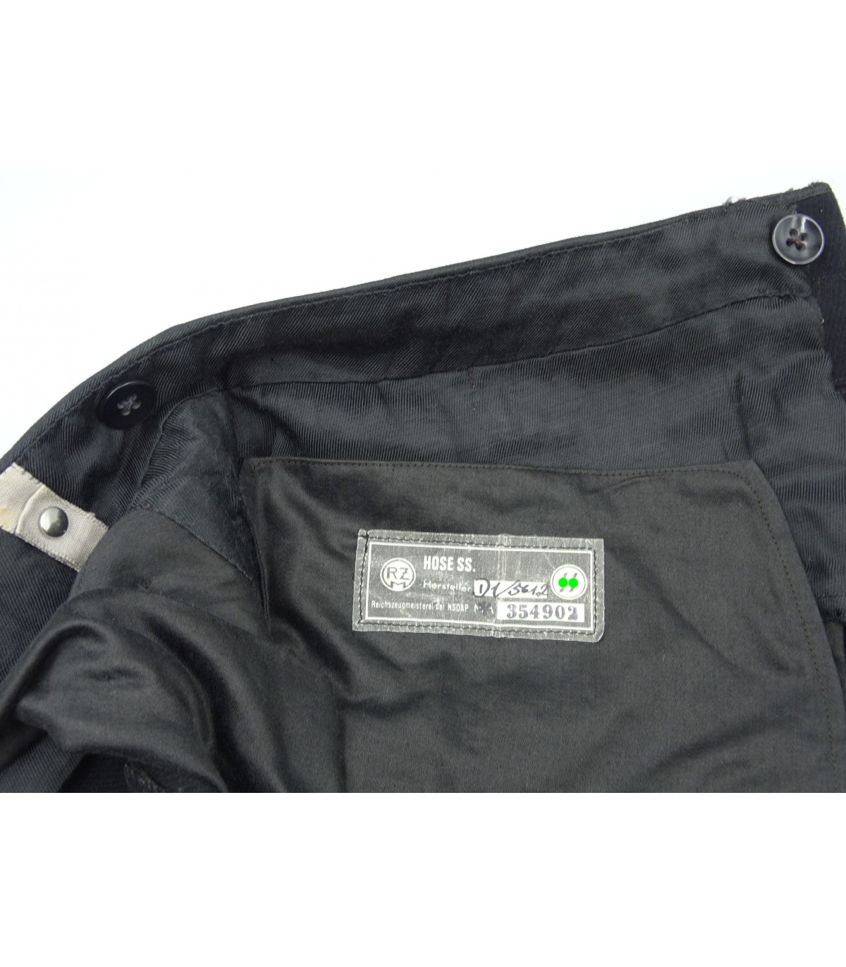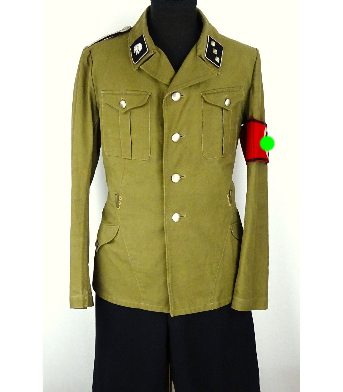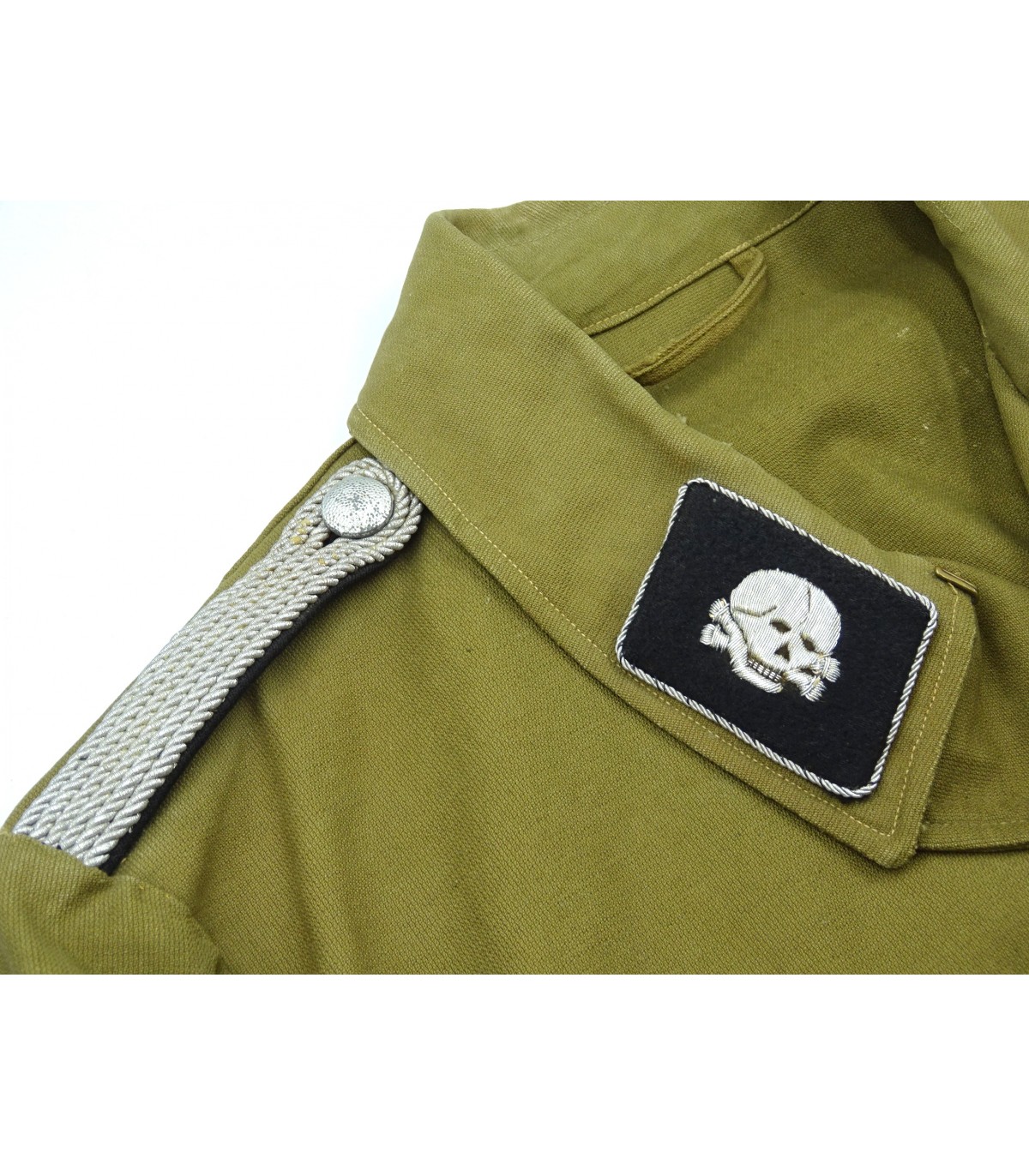 Uniforme Erdbraun, colletto aperto, 4 bottoni, tasche sul petto applicate, tasche oblique sui fianchi. Linguetta sulla spalla dell'ufficiale minore, linguetta del colletto sinistro dell'SS-Untersturmführer e linguetta del colletto destro con teschio orizzontale, entrambe fissate con 4 viti (per la pulizia). Ganci da cintura. Fascia da braccio in feltro SS, variante rara (fori di tarme) bottoni RZM M5/75. All'interno marcatura "52" e "SS-VA 1938" (SS-Versorgungsamt). Pantaloni da equitazione in maglia nera, etichetta RZM SS-Hose. Completo superbo ed estremamente raro. TBE.