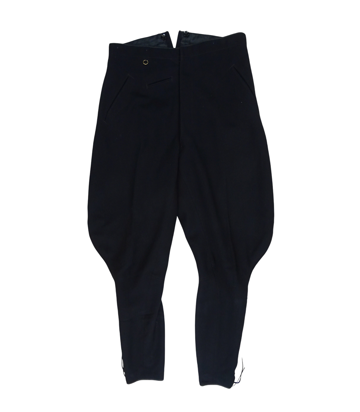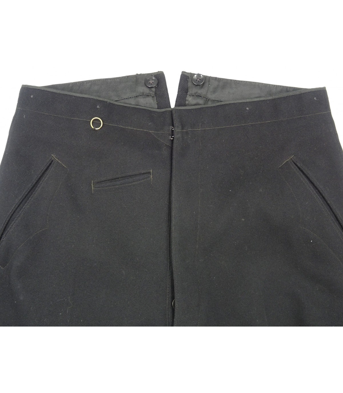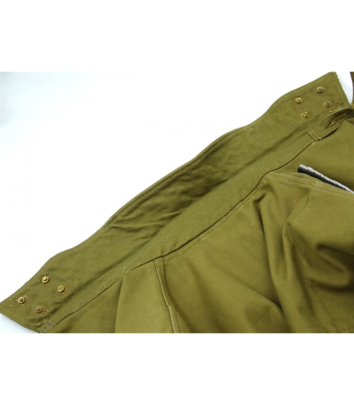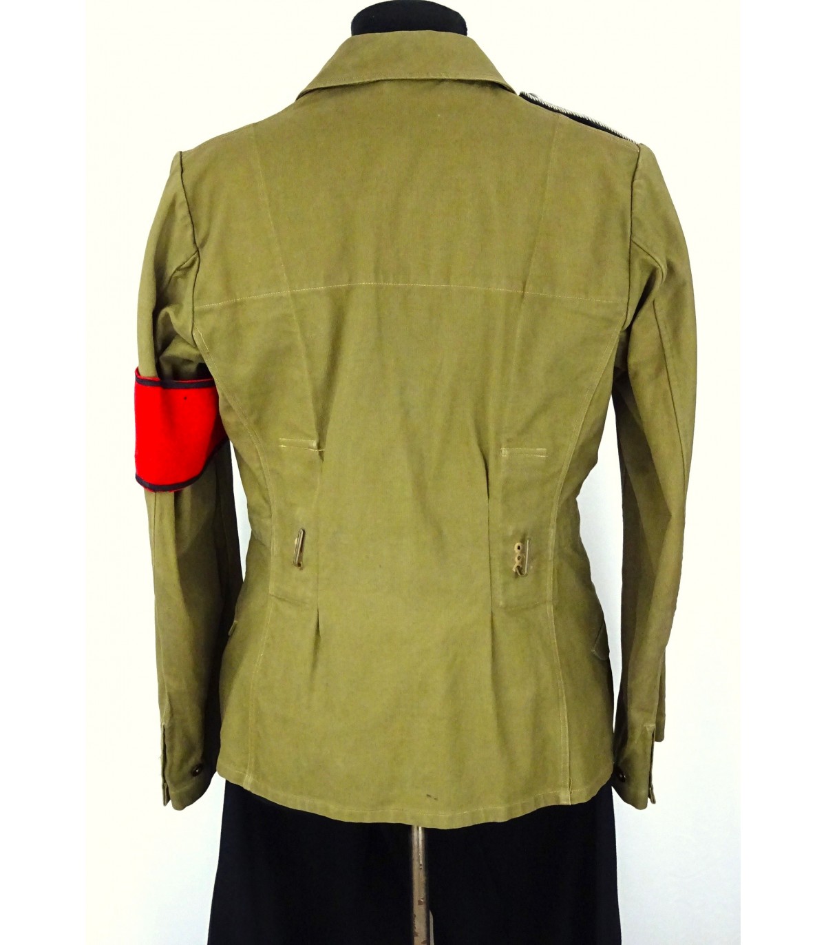 Uniforme Erdbraun, colletto aperto, 4 bottoni, tasche sul petto applicate, tasche oblique sui fianchi. Linguetta sulla spalla dell'ufficiale minore, linguetta del colletto sinistro dell'SS-Untersturmführer e linguetta del colletto destro con teschio orizzontale, entrambe fissate con 4 viti (per la pulizia). Ganci da cintura. Fascia da braccio in feltro SS, variante rara (fori di tarme) bottoni RZM M5/75. All'interno marcatura "52" e "SS-VA 1938" (SS-Versorgungsamt). Pantaloni da equitazione in maglia nera, etichetta RZM SS-Hose. Completo superbo ed estremamente raro. TBE.