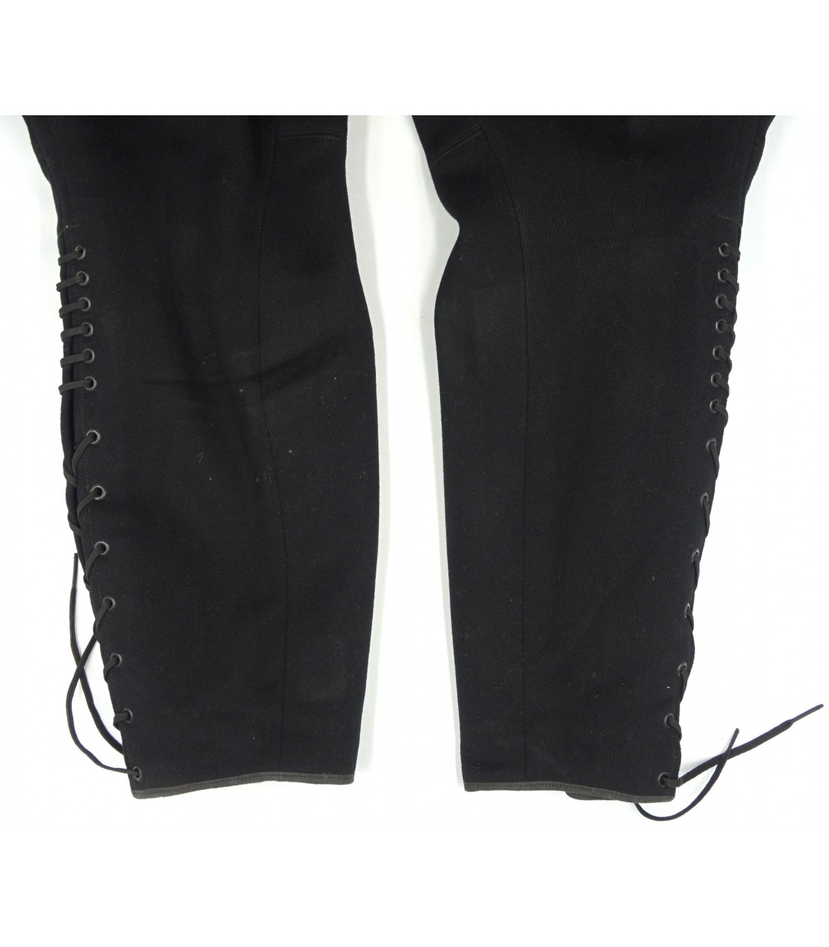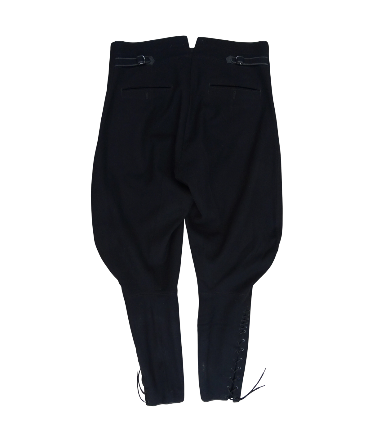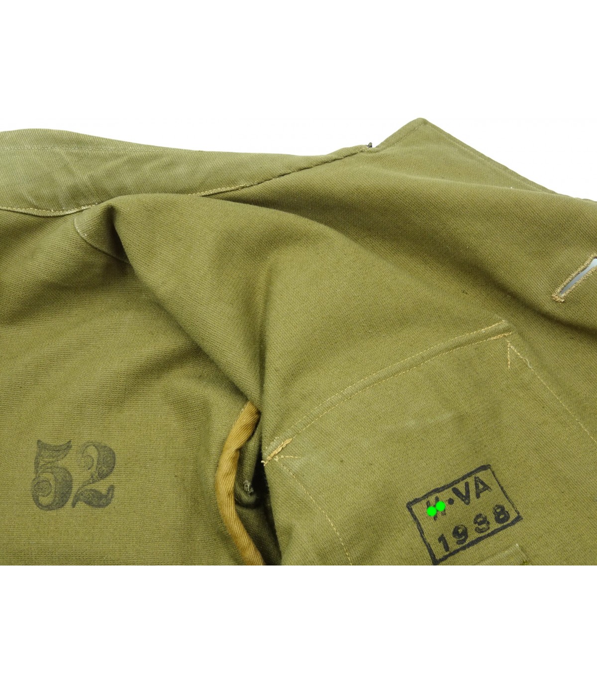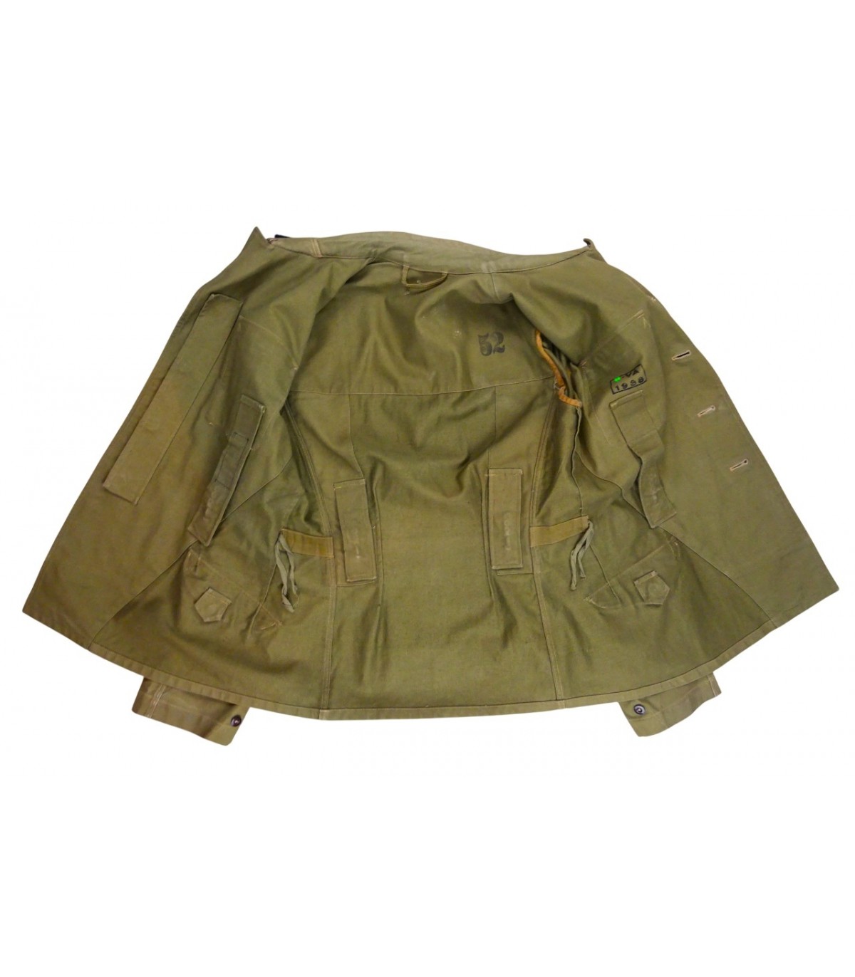 Uniforme Erdbraun, colletto aperto, 4 bottoni, tasche sul petto applicate, tasche oblique sui fianchi. Linguetta sulla spalla dell'ufficiale minore, linguetta del colletto sinistro dell'SS-Untersturmführer e linguetta del colletto destro con teschio orizzontale, entrambe fissate con 4 viti (per la pulizia). Ganci da cintura. Fascia da braccio in feltro SS, variante rara (fori di tarme) bottoni RZM M5/75. All'interno marcatura "52" e "SS-VA 1938" (SS-Versorgungsamt). Pantaloni da equitazione in maglia nera, etichetta RZM SS-Hose. Completo superbo ed estremamente raro. TBE.