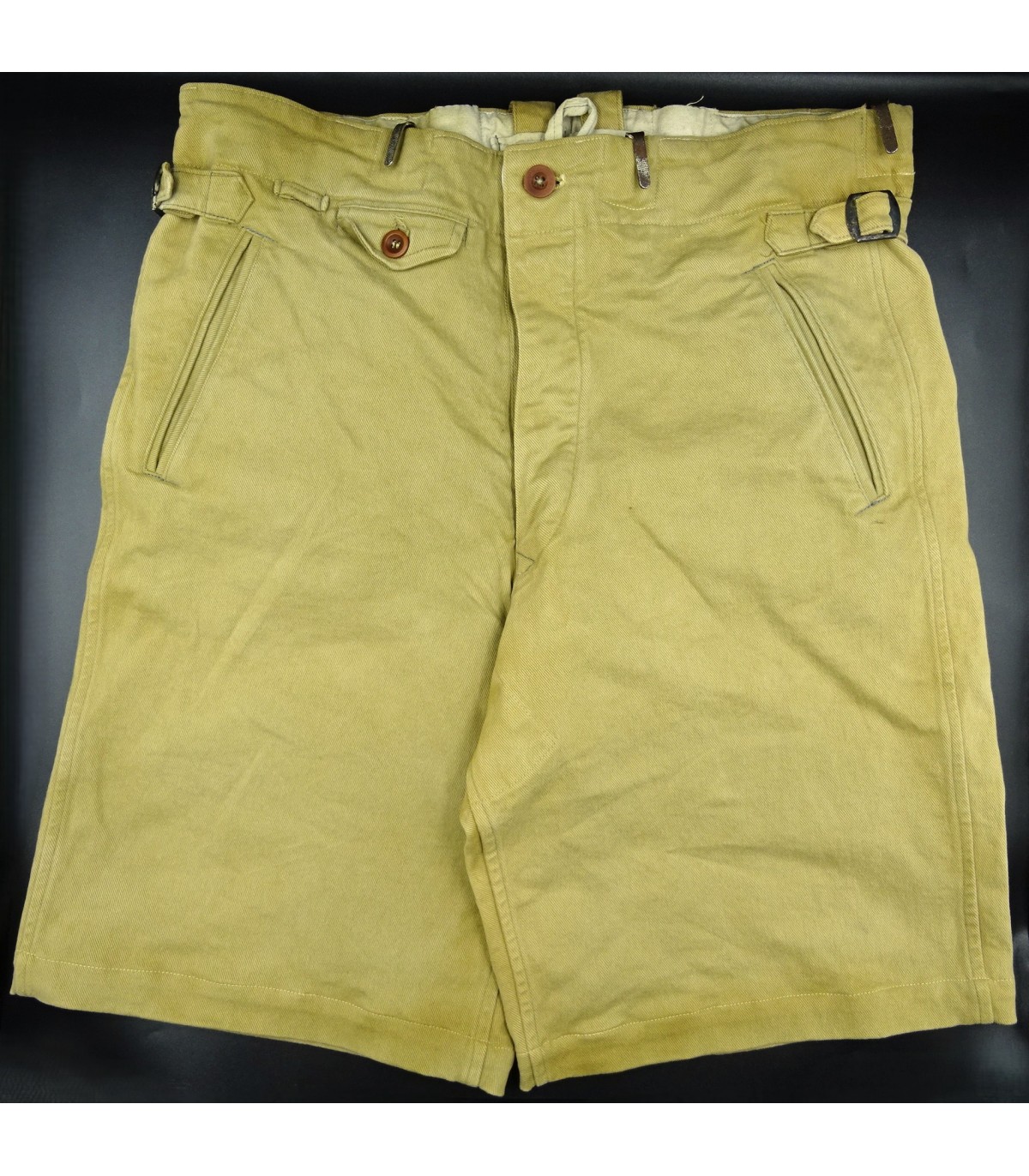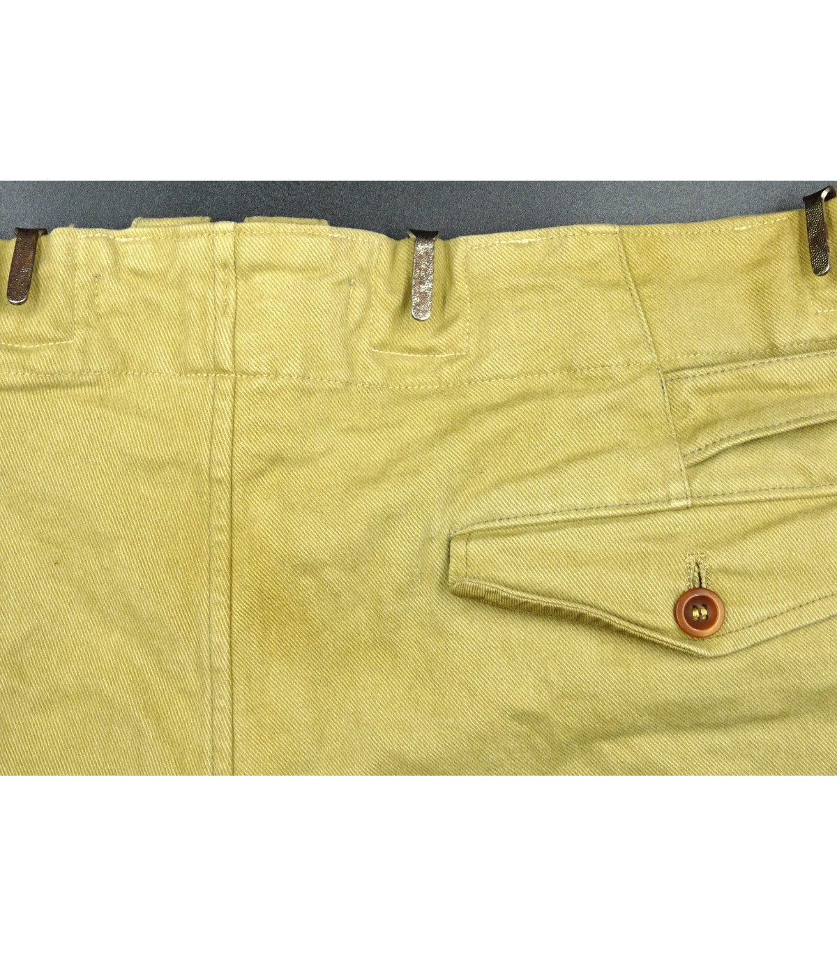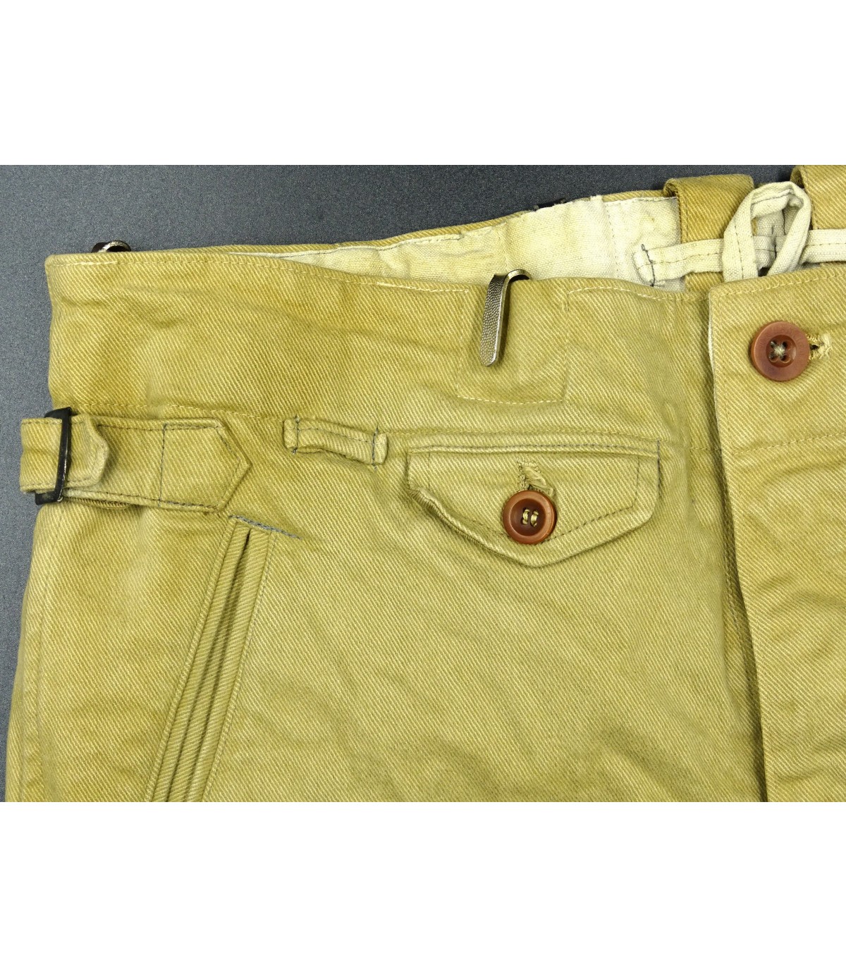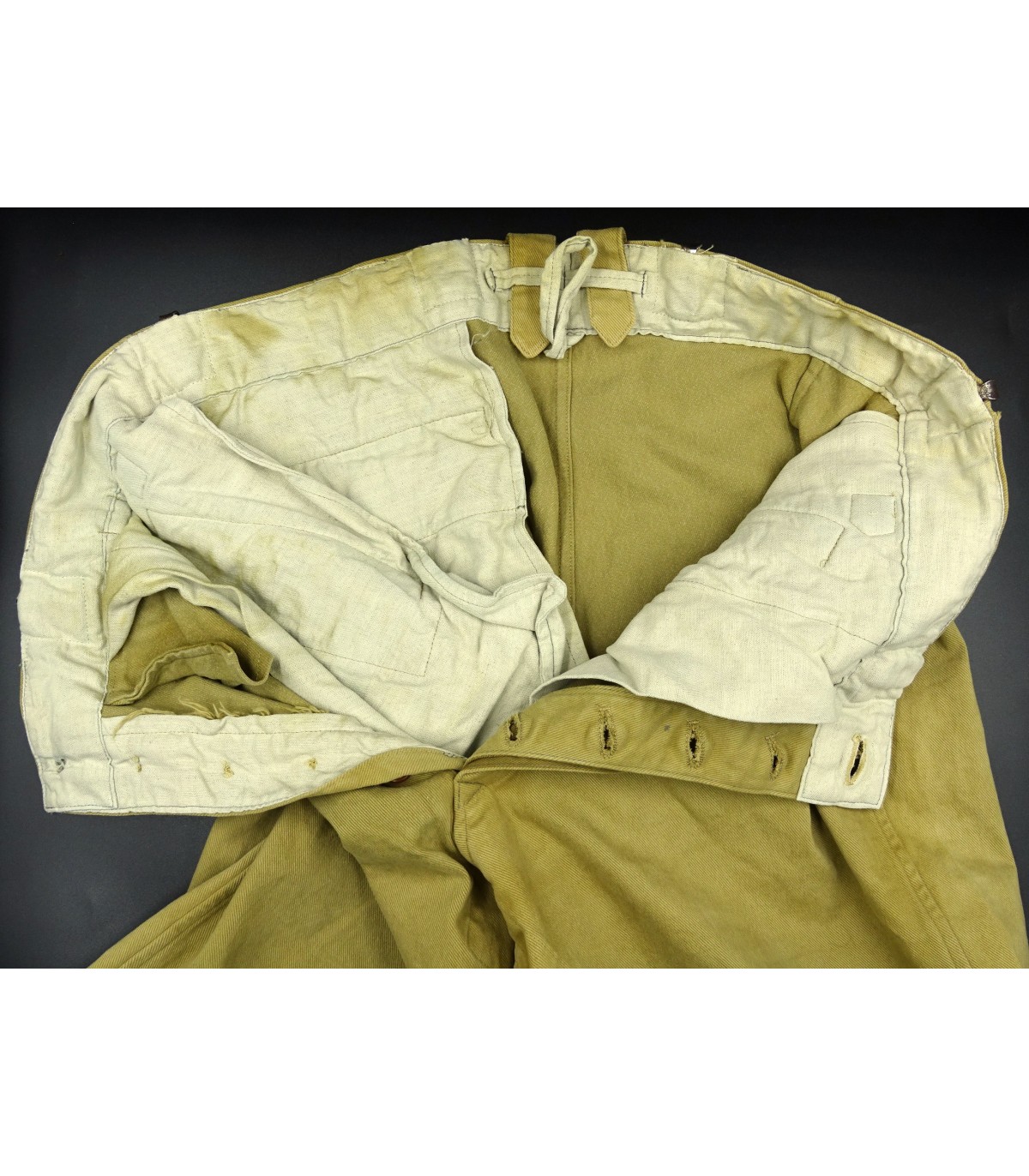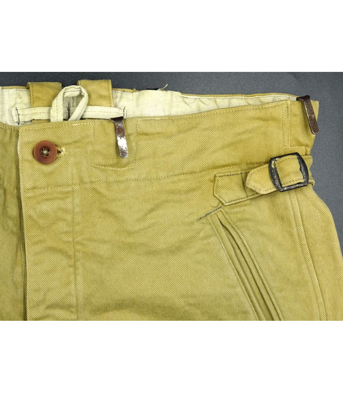Tela color sabbia, fodera bianca, ganci speciali per la cintura. Misura vita 90. BE-TBE.