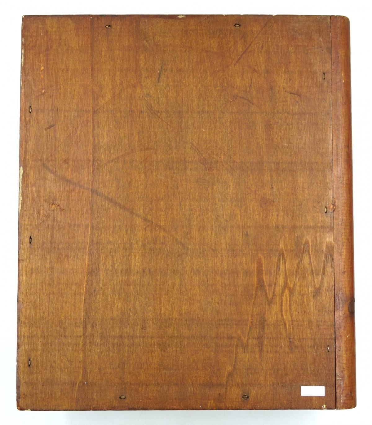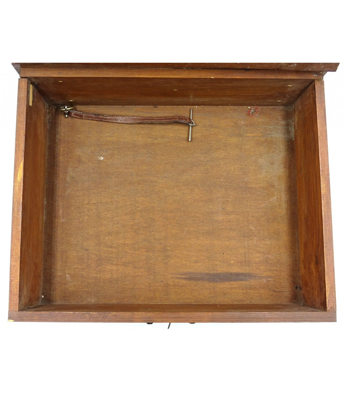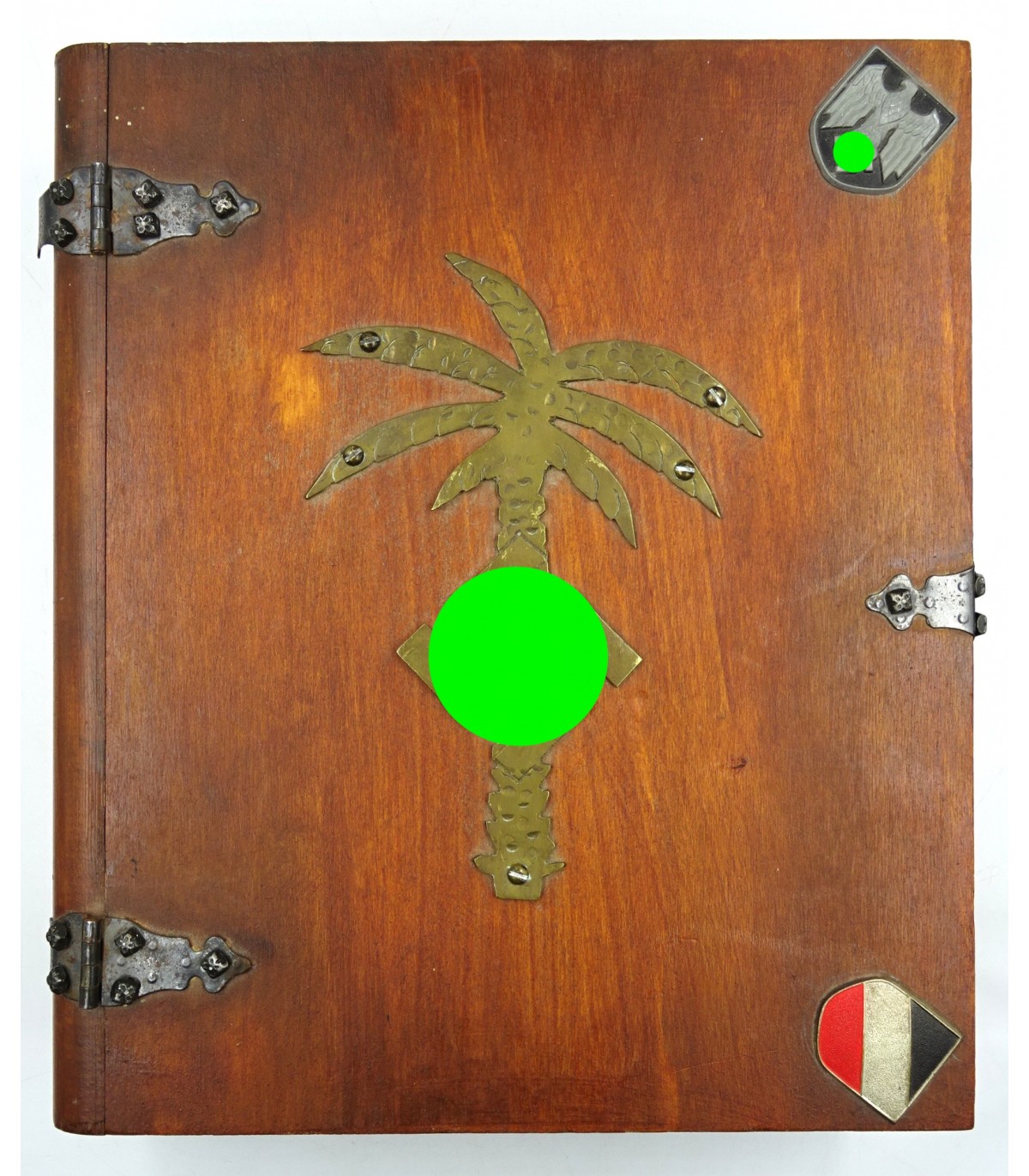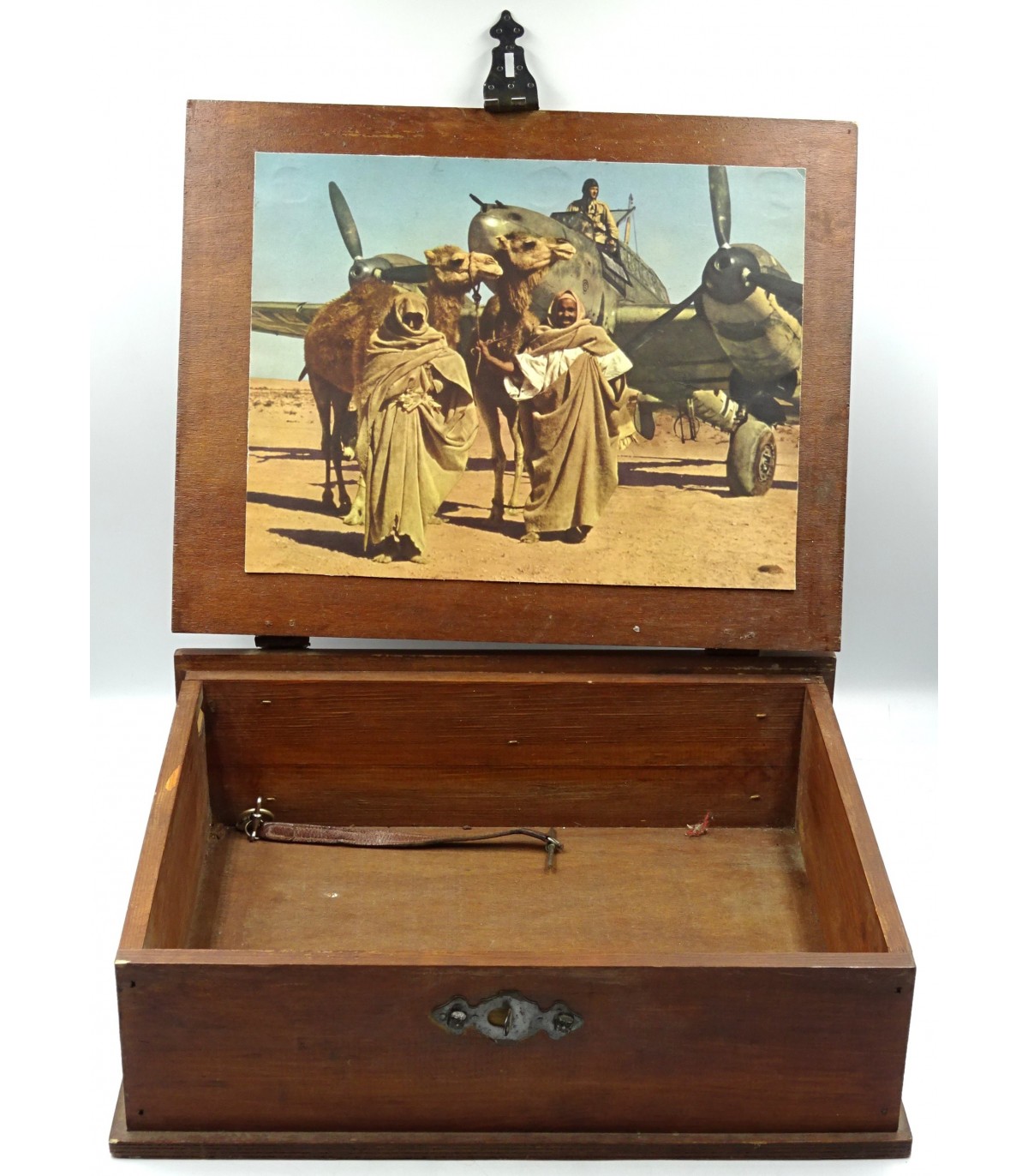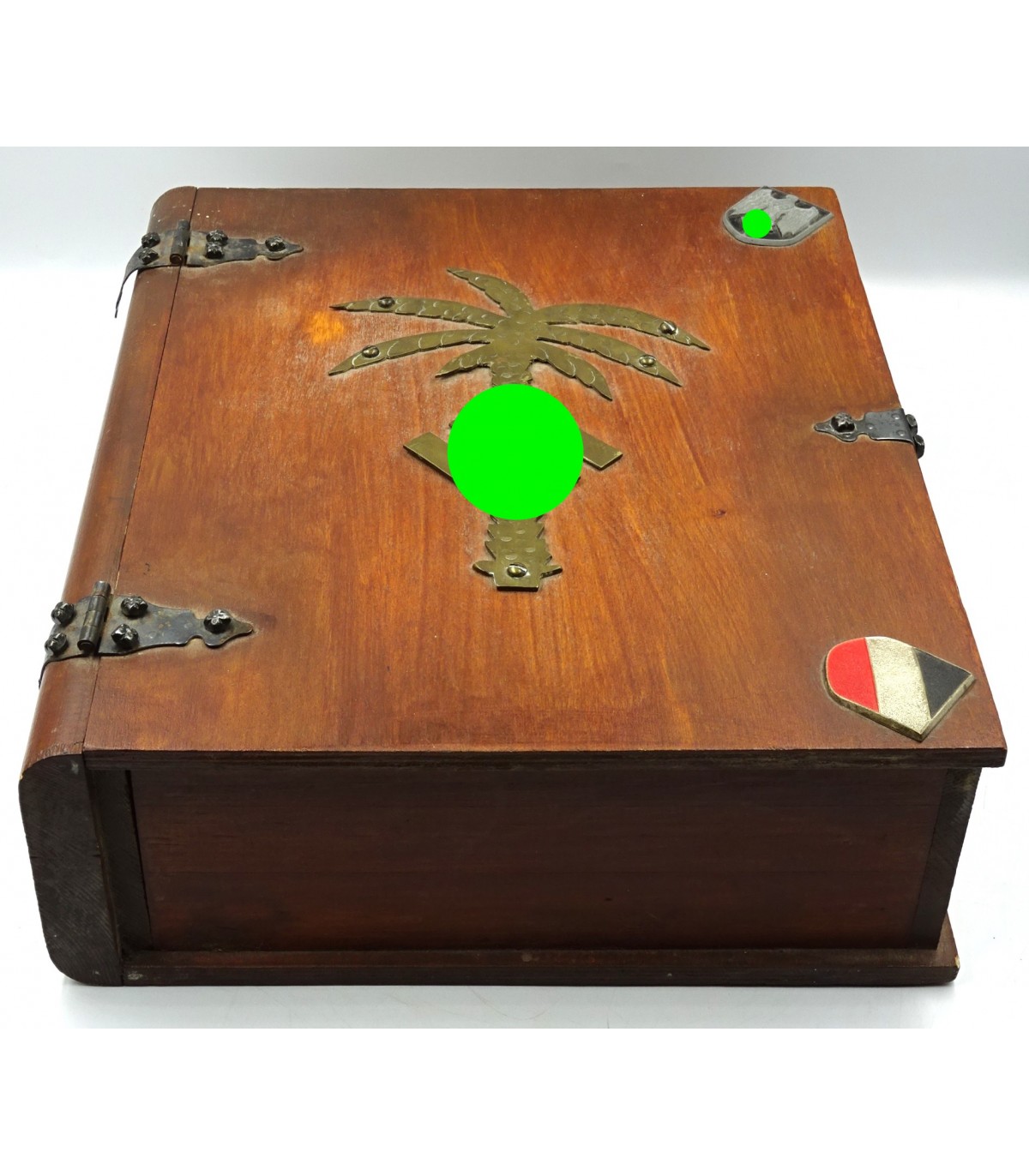 Legno decorato con l'emblema metallico dell'Afrikakorps (palma e svastica) e stemmi coloniali in 2 angoli. Accessori neri. Sotto il coperchio, foto a colori di un Me110 "scortato" da 2 beduini. Dimensioni 34x29x10,5 cm. Molto decorativo. BUONE CONDIZIONI.