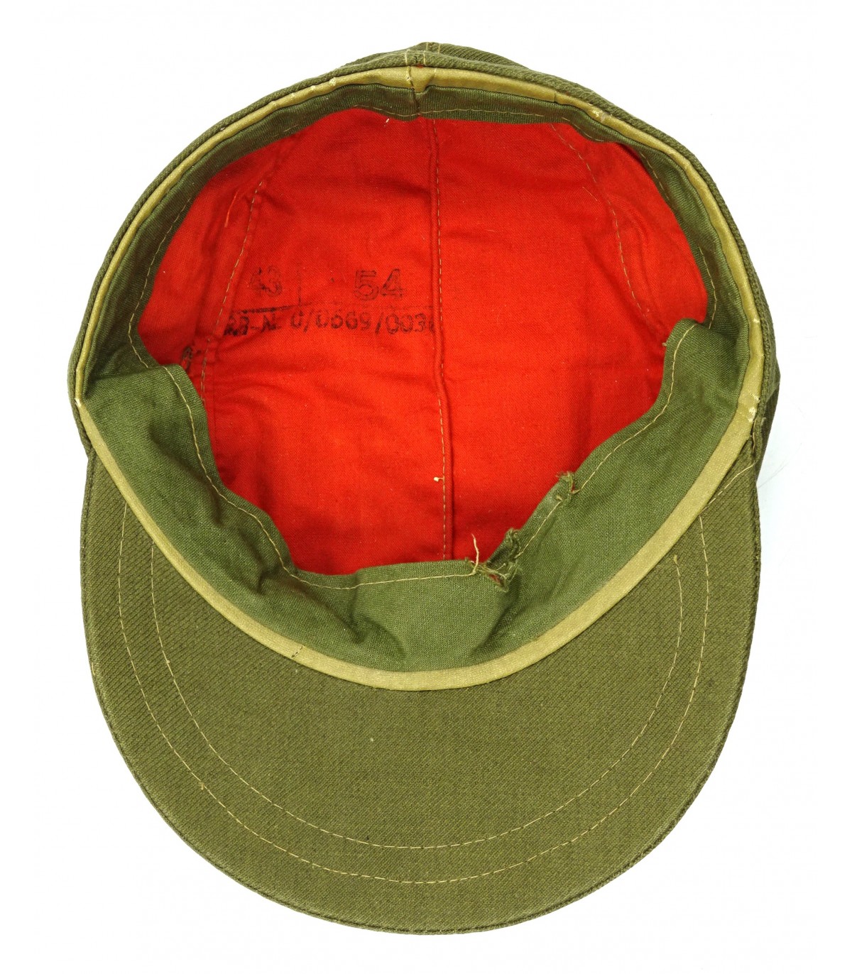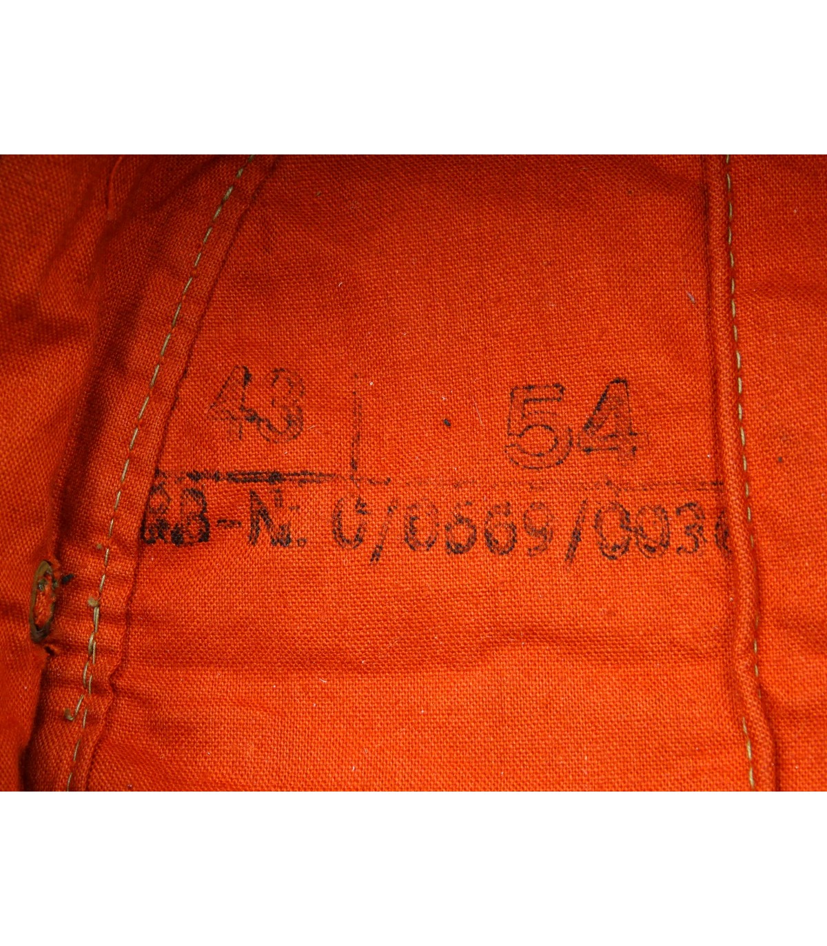 Completo. Tela verde oliva. Stemmi intrecciati Bevo. Profili rossi. Fascia tergisudore cerata. Taglia 54. Alette di ventilazione in zinco RBNr. 2. BUONE CONDIZIONI.