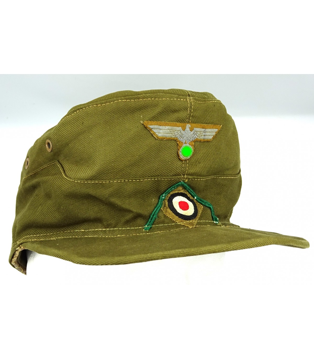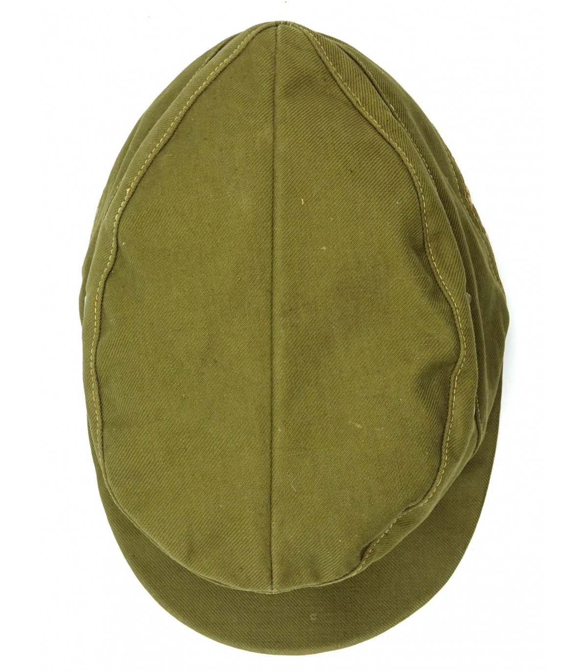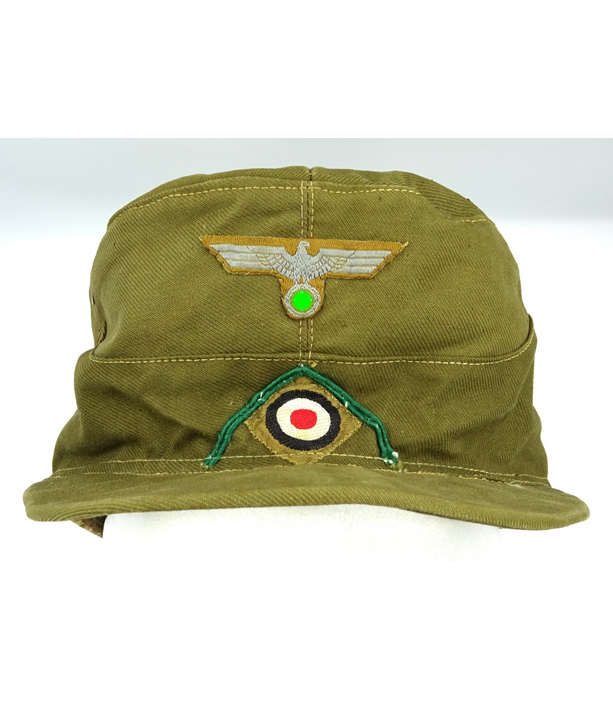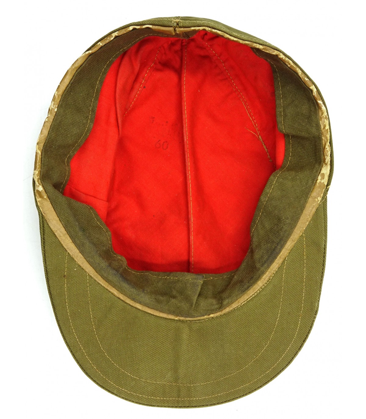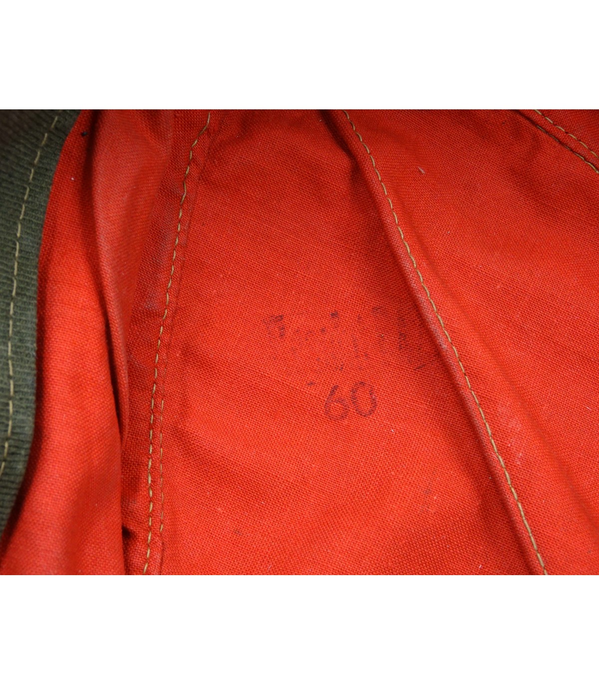Completo. Tela verde oliva, fodera rossa, misura 60. Parasudore in tela cerata, anse in zinco verniciato. Distintivi originali montati. Chevron in colore d'arma verde cacciatore. OTTIME CONDIZIONI.