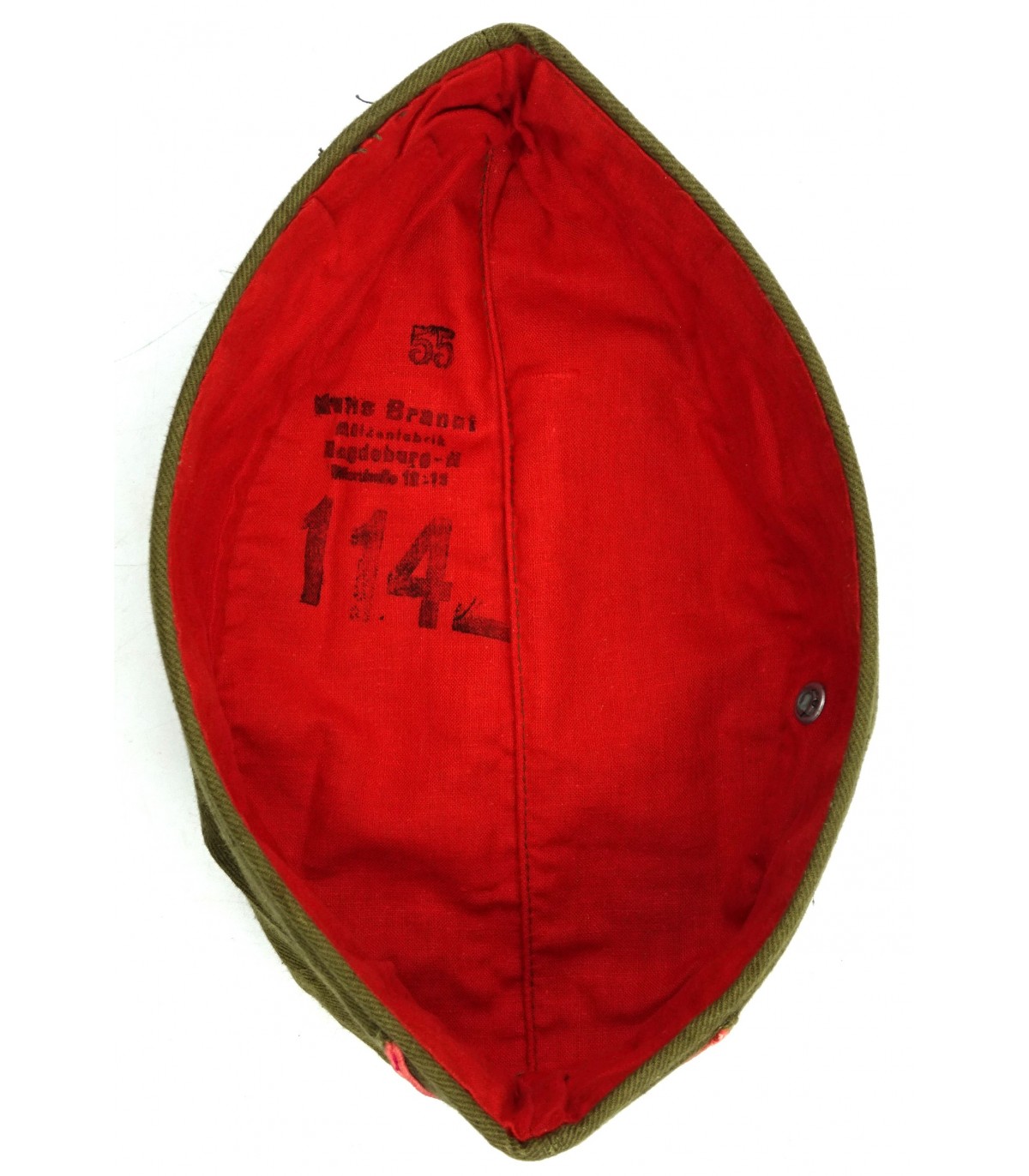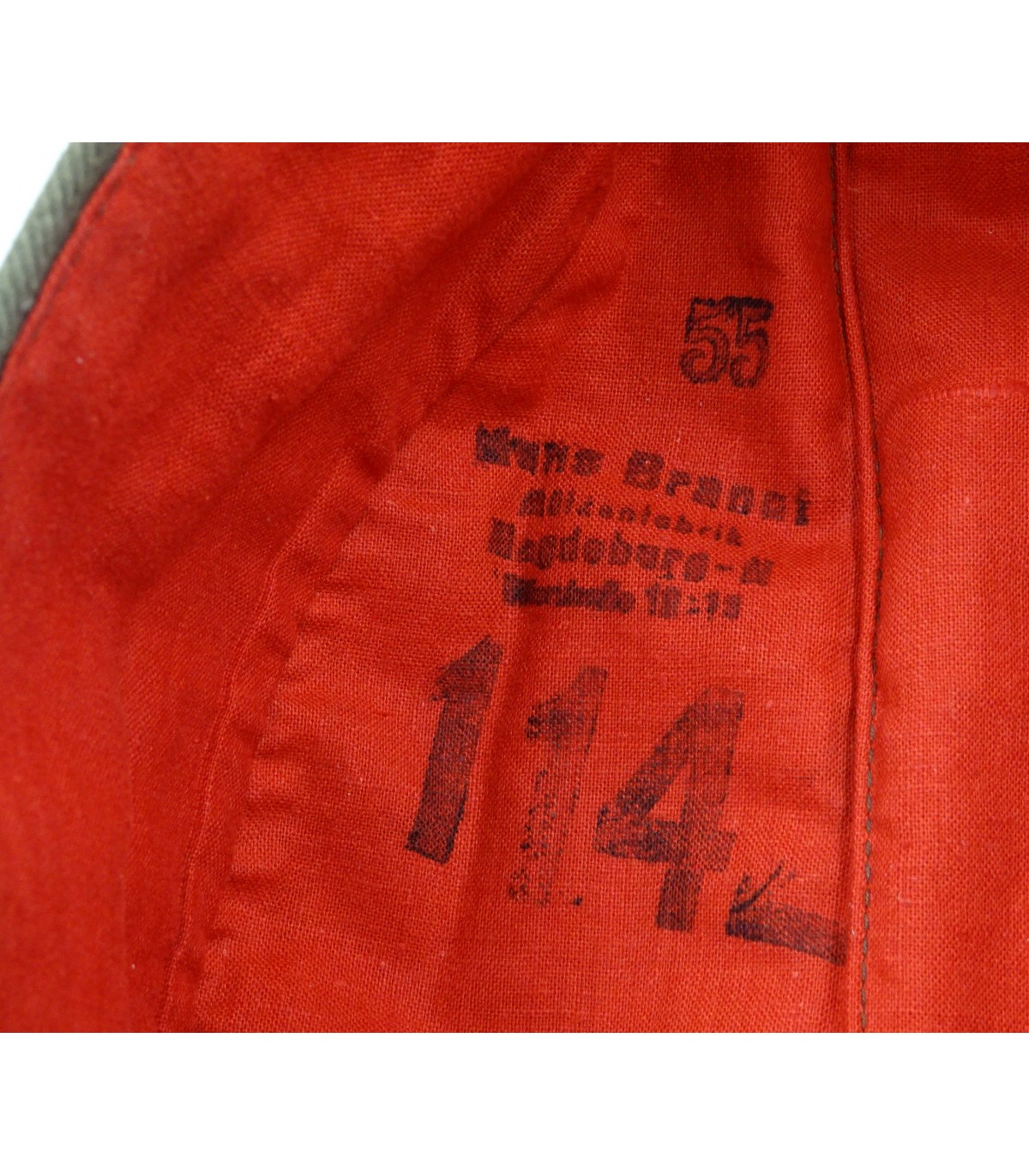 Verde oliva, fodera rossa, marchi del fabbricante, taglia 55. Alette di ventilazione in zinco verniciato. Aquila e tondo intrecciati Bevo, abbottonatura dell'armatura rosa. Insegne e soutache cucite a macchina. Condizioni di magazzino. Proveniente da un lotto rinvenuto in Austria negli anni 70-80. OTTIME CONDIZIONI.