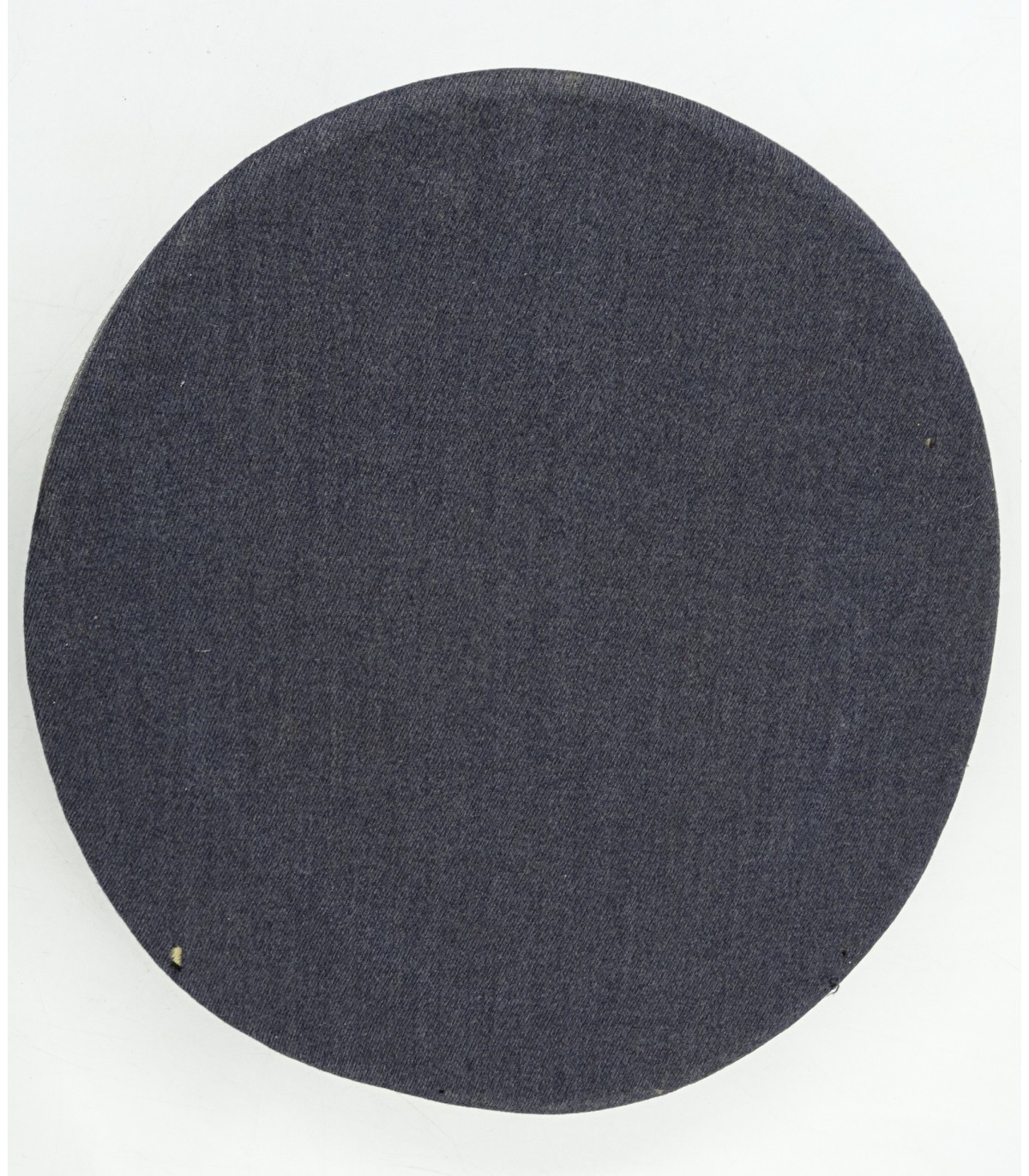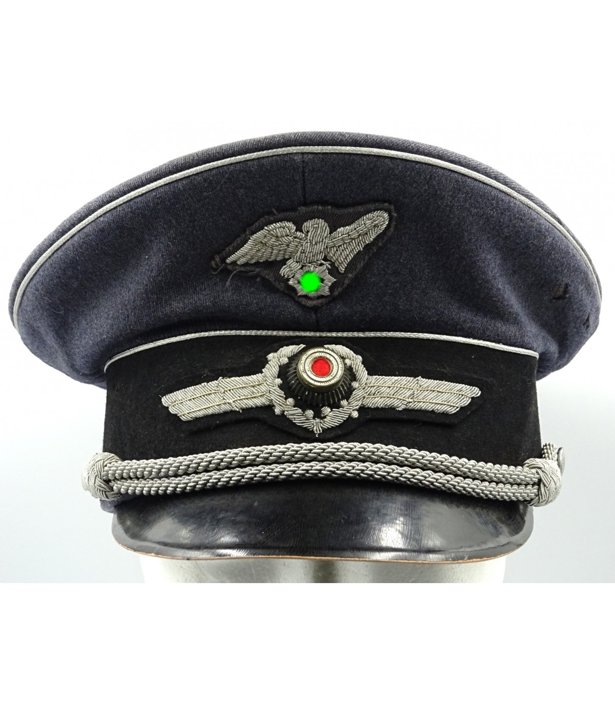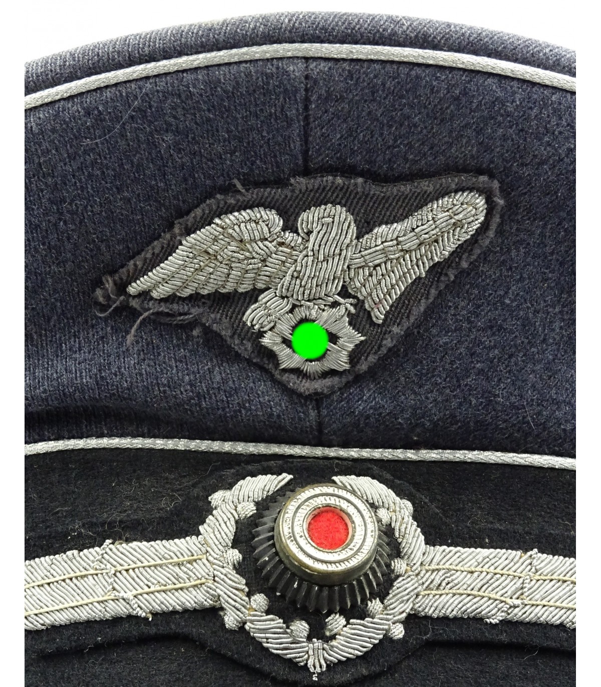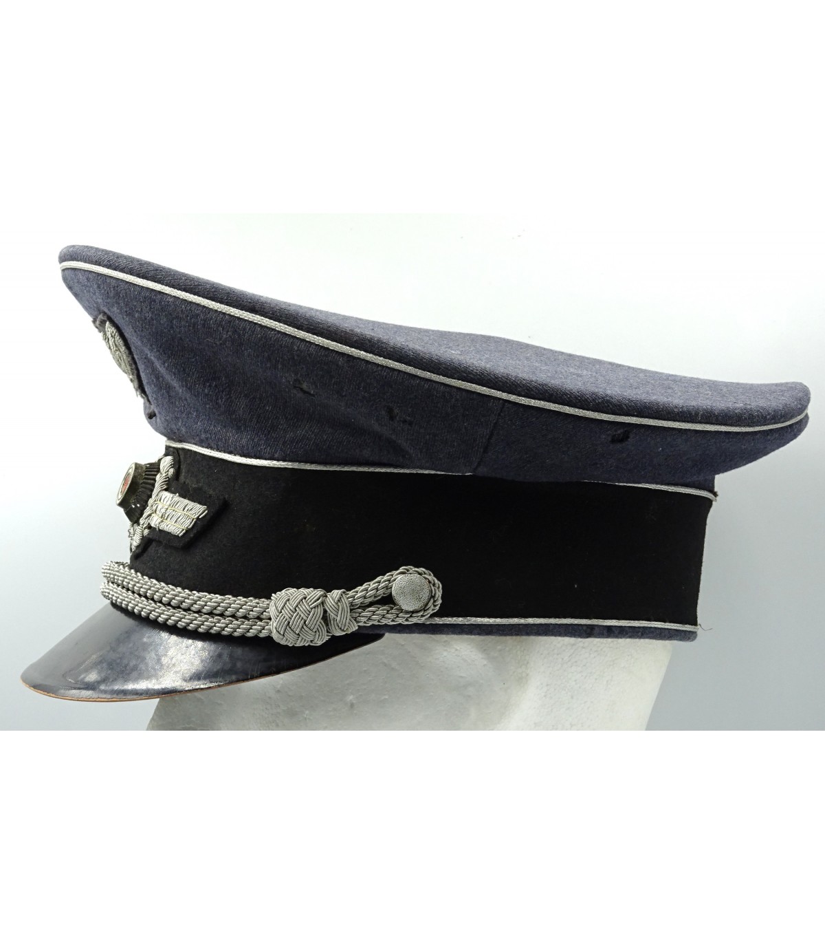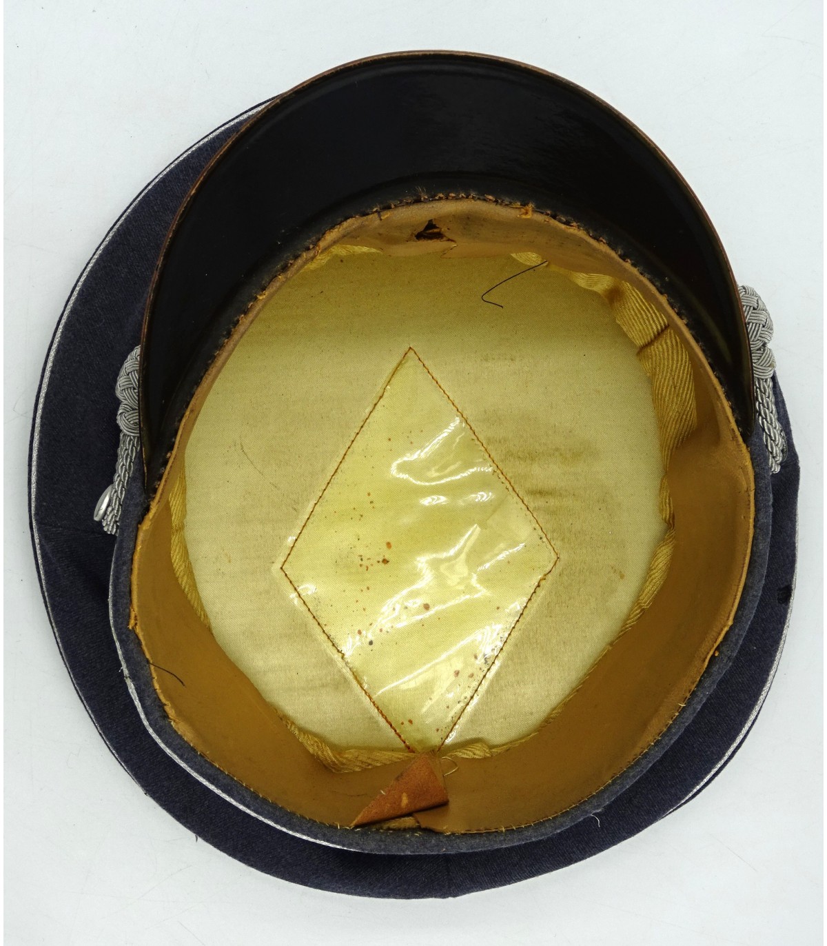 Completo. Stemmi ricamati a mano. Fascia nera, copricapo in maglia grigia, profili in alluminio. Fascia danneggiata sul davanti e 3 fori di tarme, per il resto BE-TBE.