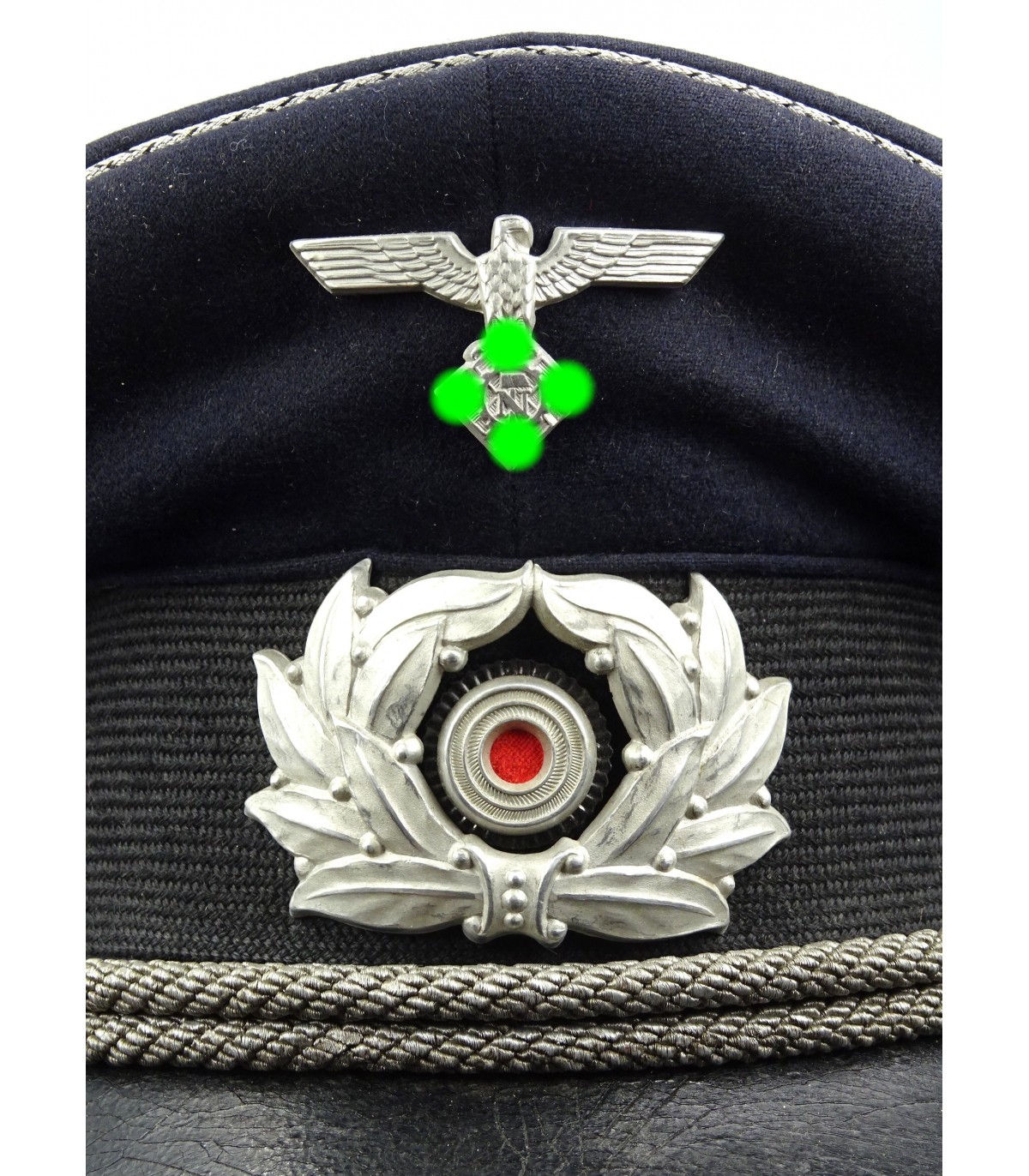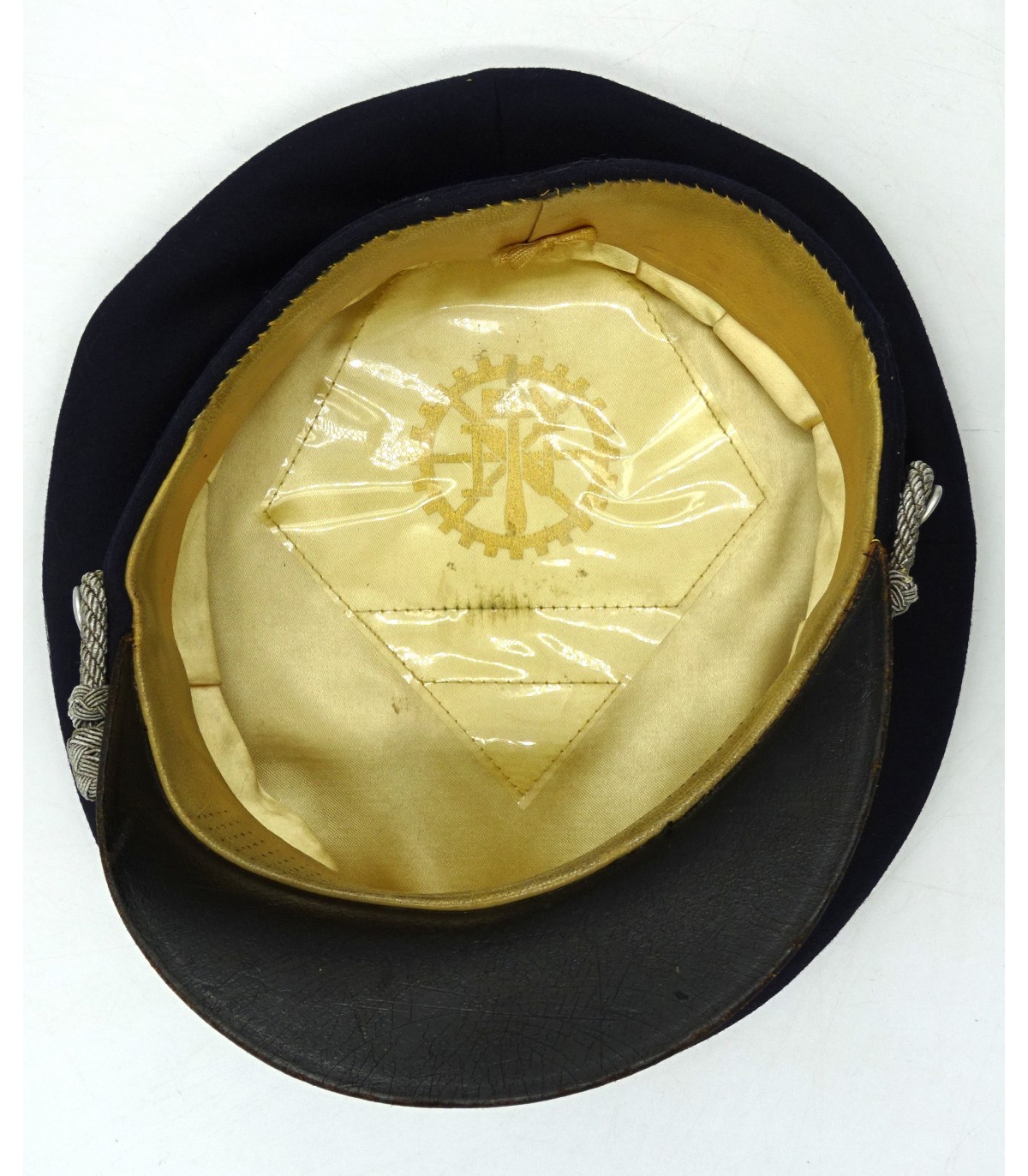 Completo. Fascia nera, berretto in tessuto di lana blu navy, profili in alluminio trapuntato nero. Insegne in alluminio, cordoncino d'argento, visiera in pelle. Emblema di Teno sotto il cappuccio. Un esempio superbo.