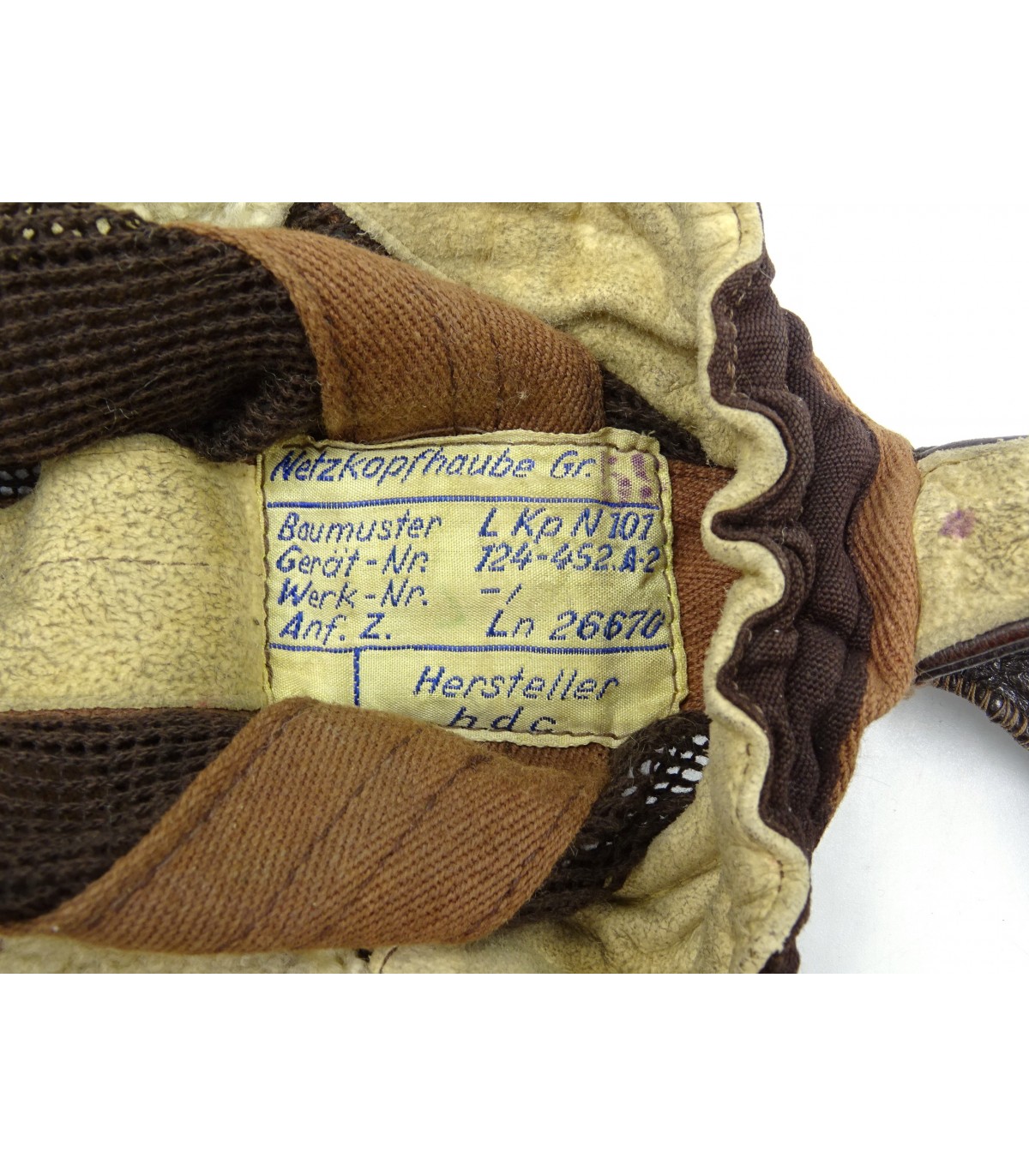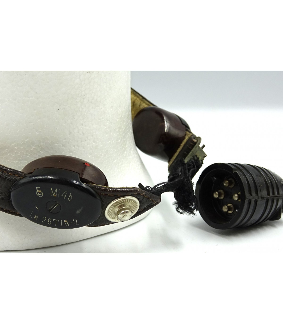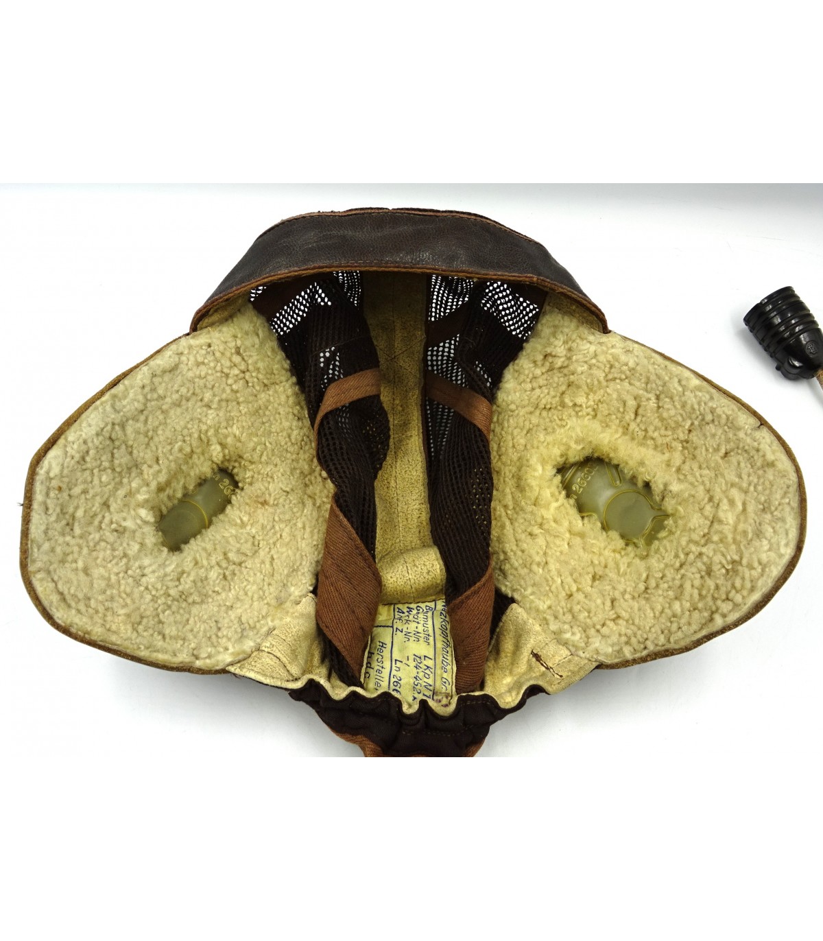 LKpN101. In pelle e rete. Con auricolari e microfono a gola. Etichetta in tessuto. T59. Per maschera ossigeno a 2 punti. Manca 1 bitono di fissaggio e l'estremità del fissaggio del laringofono sinistro. Riparazione d'epoca al cavo. Poco usurato. BUONE CONDIZIONI.
