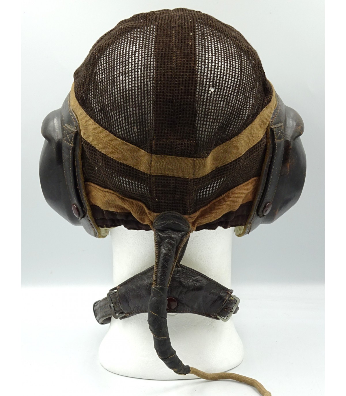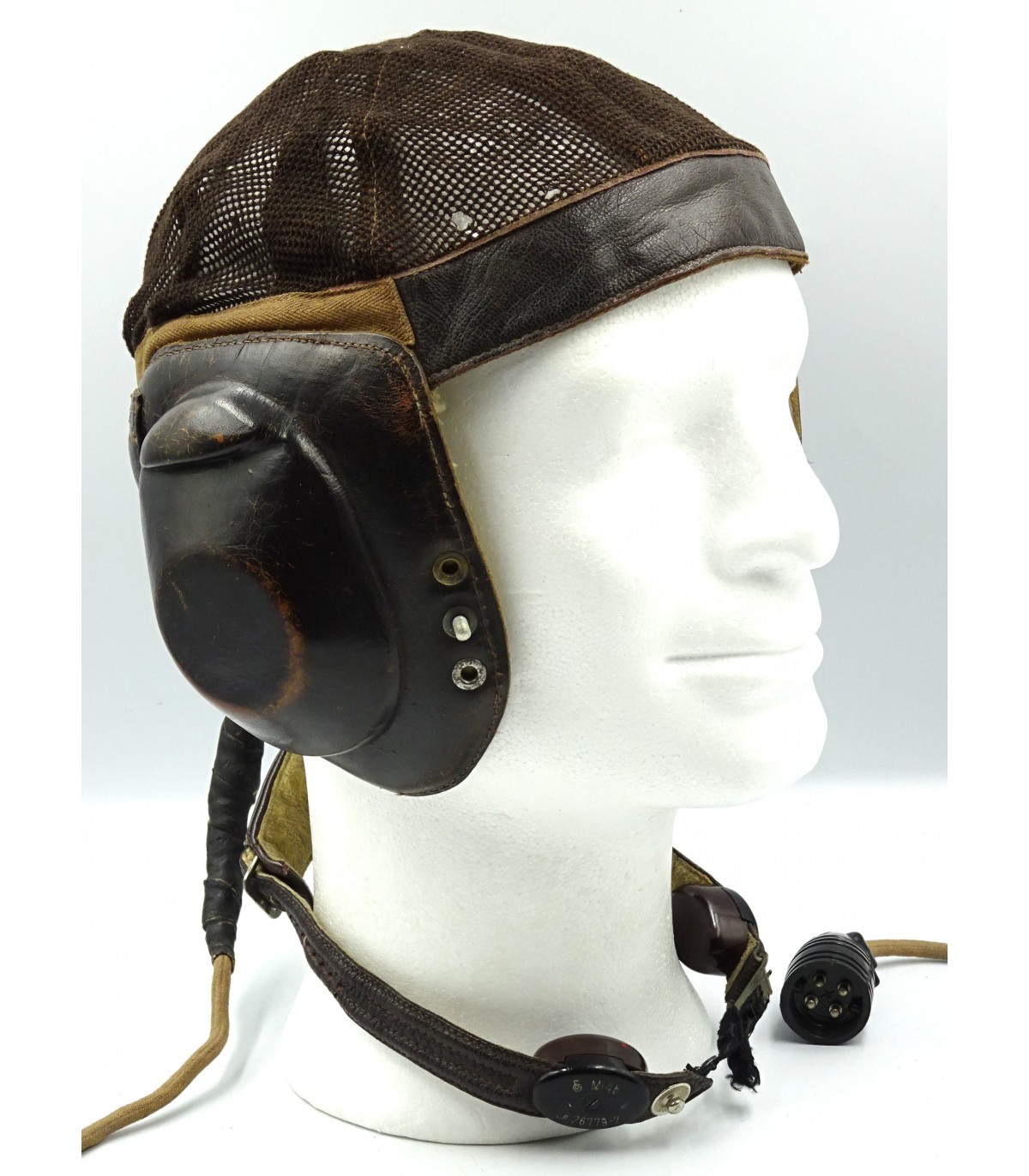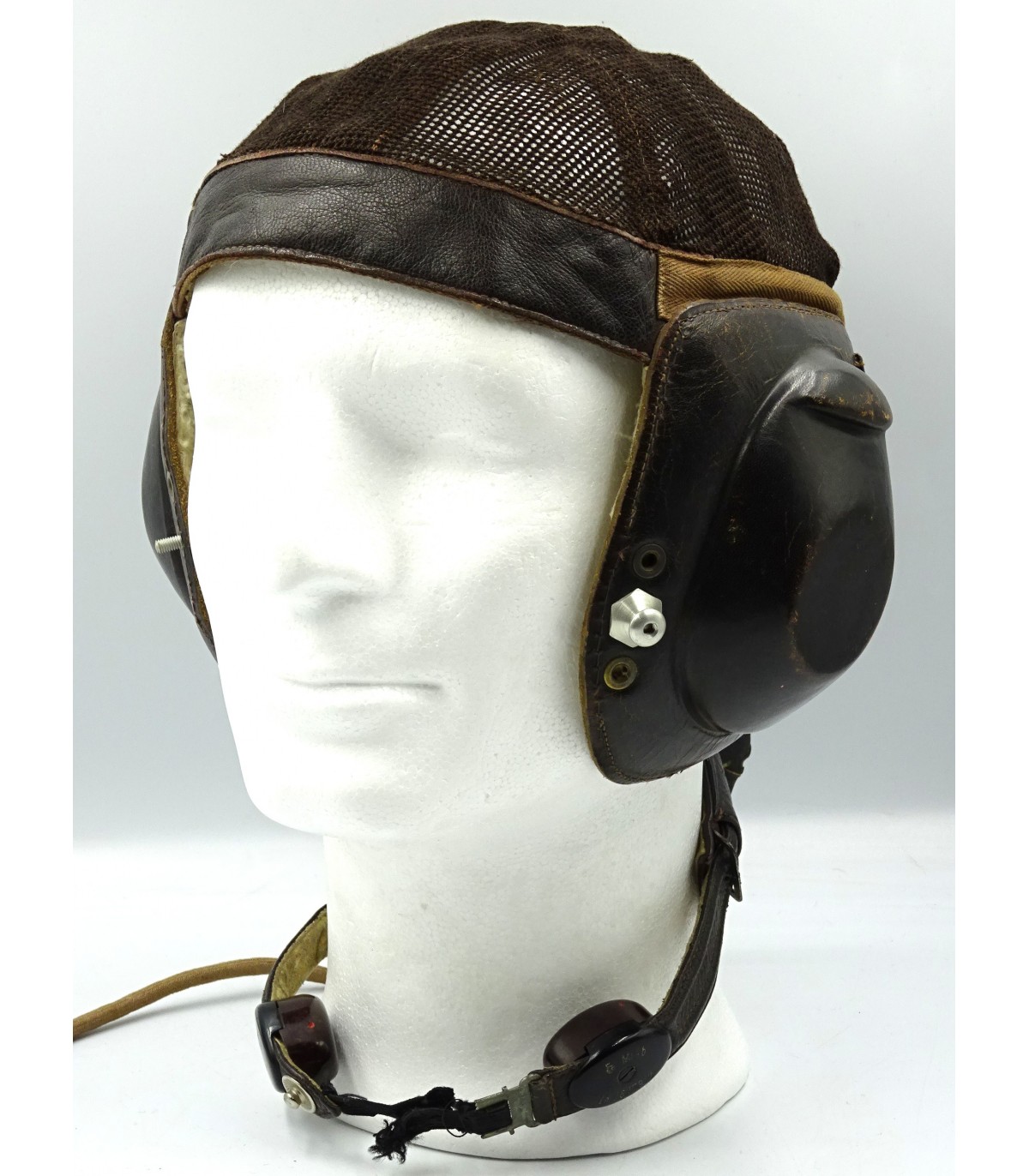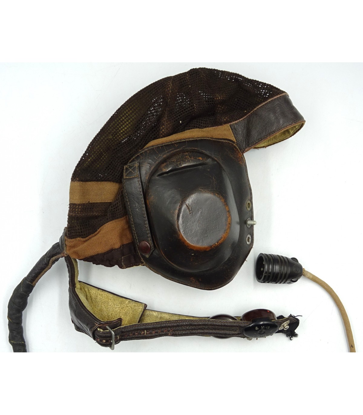 LKpN101. In pelle e rete. Con auricolari e microfono a gola. Etichetta in tessuto. T59. Per maschera ossigeno a 2 punti. Manca 1 bitono di fissaggio e l'estremità del fissaggio del laringofono sinistro. Riparazione d'epoca al cavo. Poco usurato. BUONE CONDIZIONI.