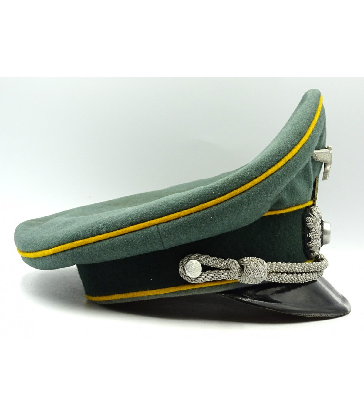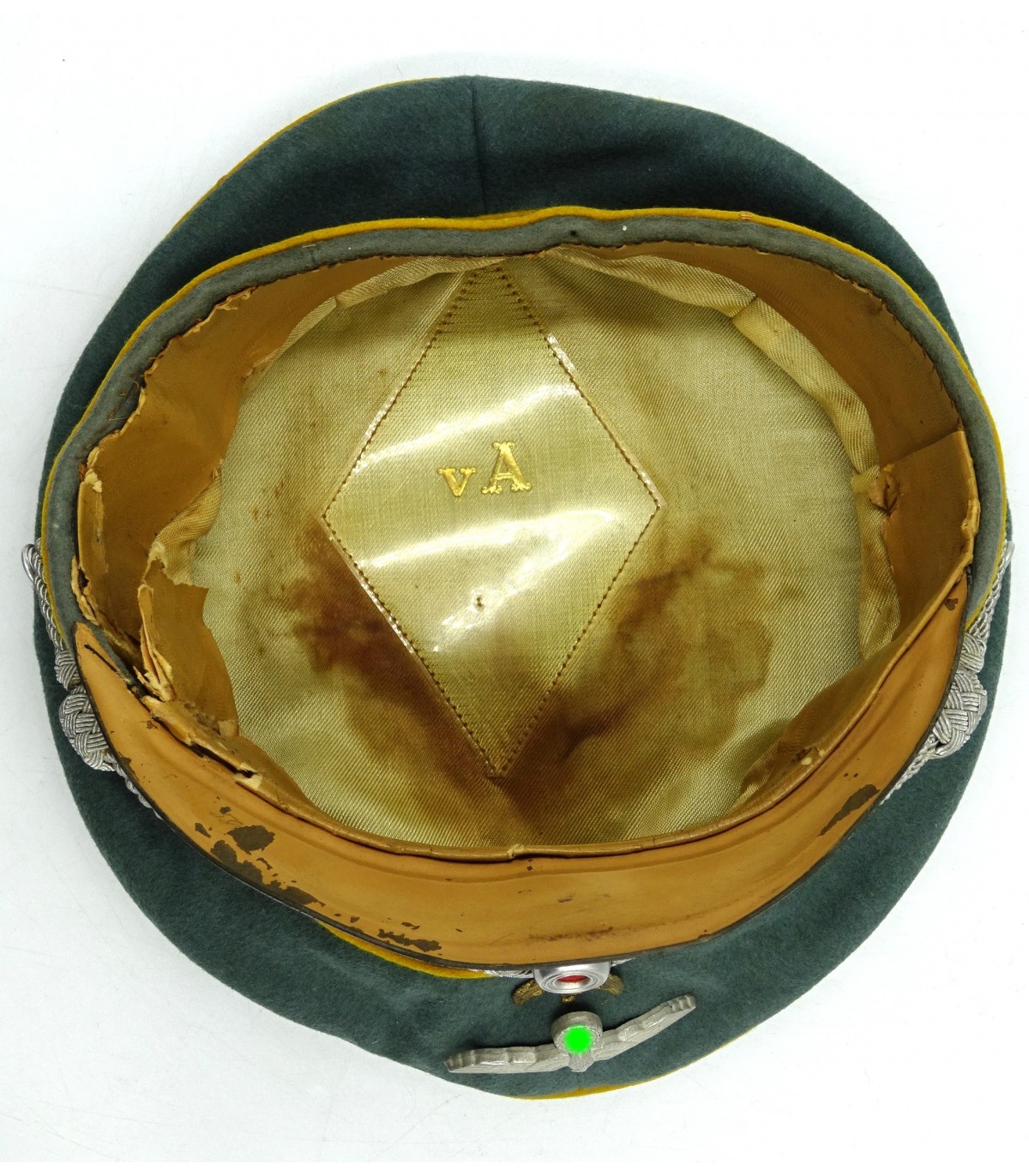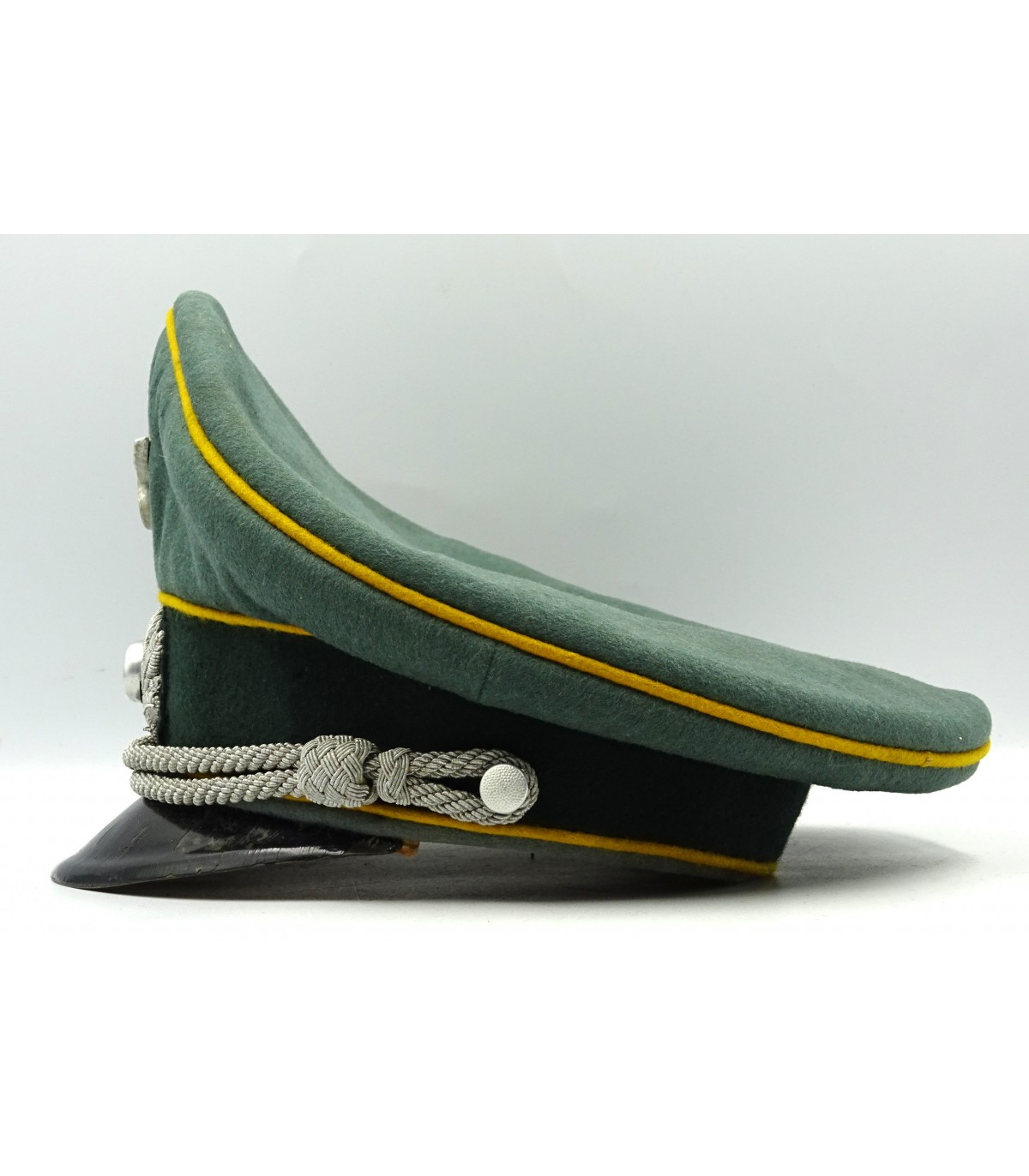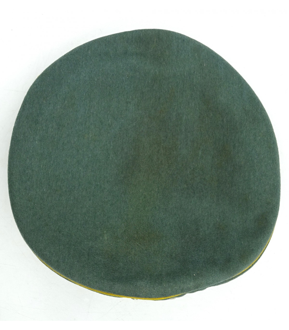Questa unità portava tradizionalmente l'aquila dei dragoni della Schewdt (rilevata nel 1944 dalla 3a brigata di cavalleria WH). Foglie di quercia ricamate a mano, aquila e tondo in alluminio, aquila di Schwedt in ottone. Copricapo in pelle di cervo feldgrau. Fascia antisudore in finta pelle. Bella forma alta. BUONO STATO.