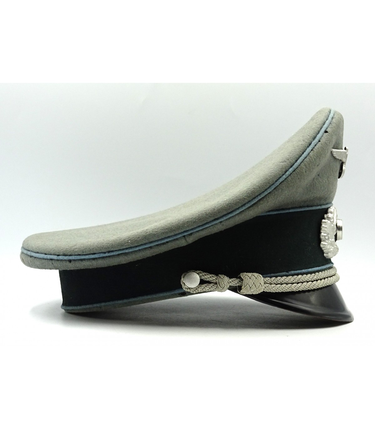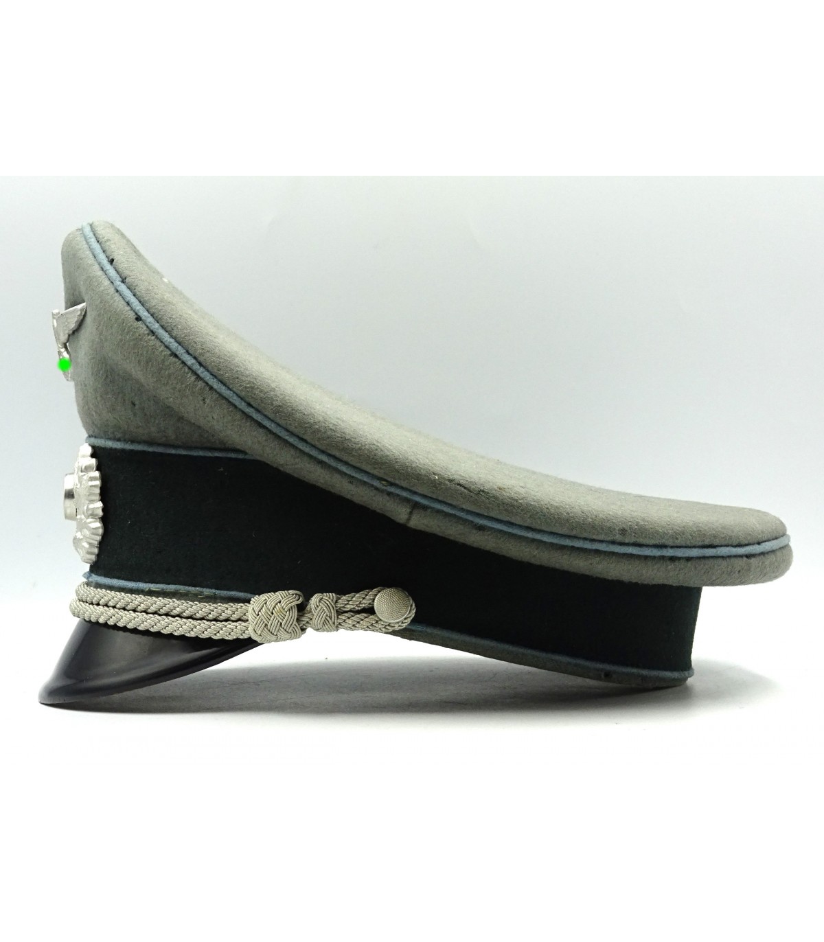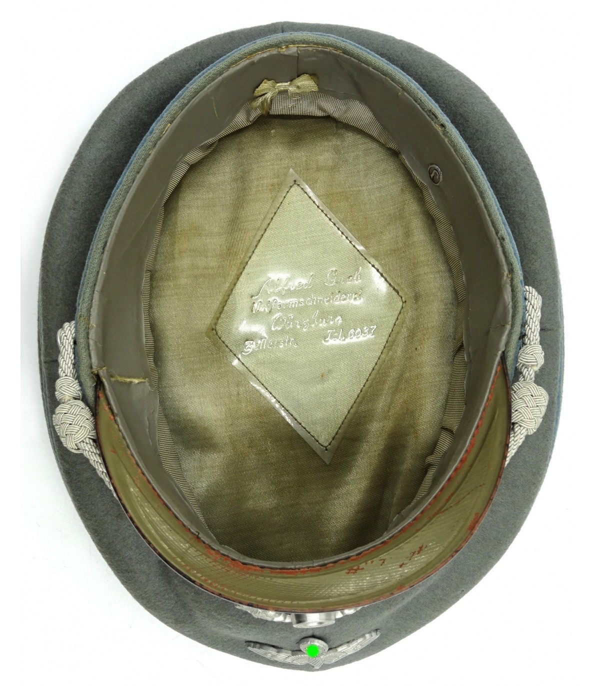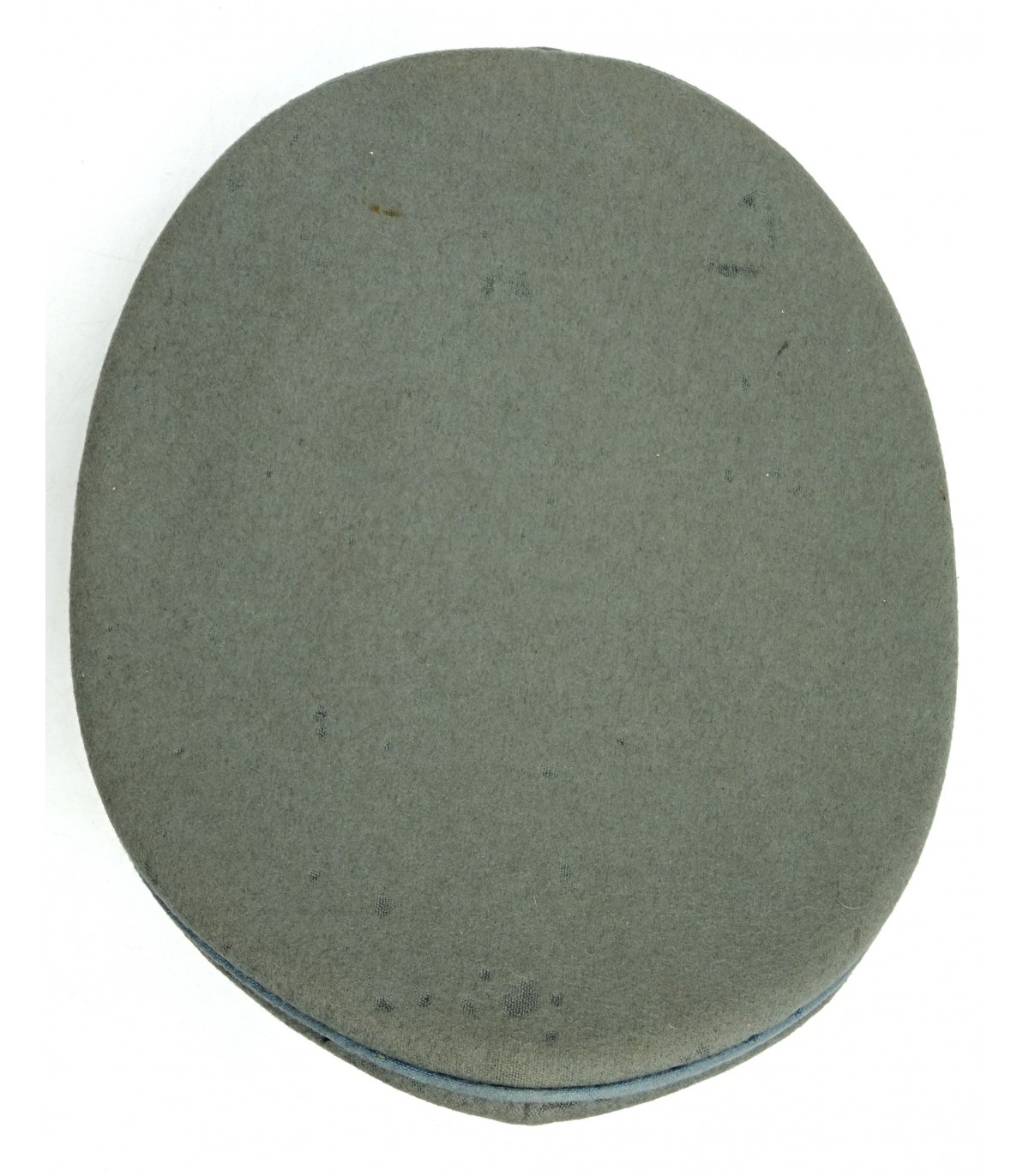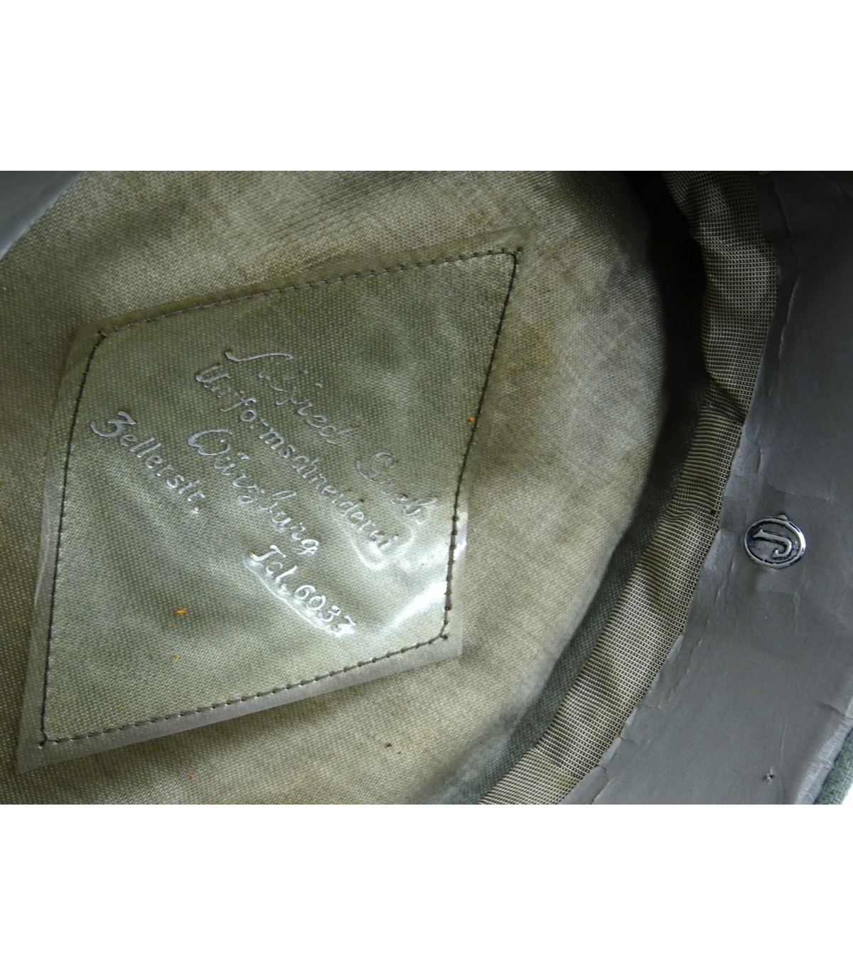 Completo. Forma sattelica, cappuccio in pelle di daino, mostrine in alluminio. Fori di tarme ma buona presentazione.