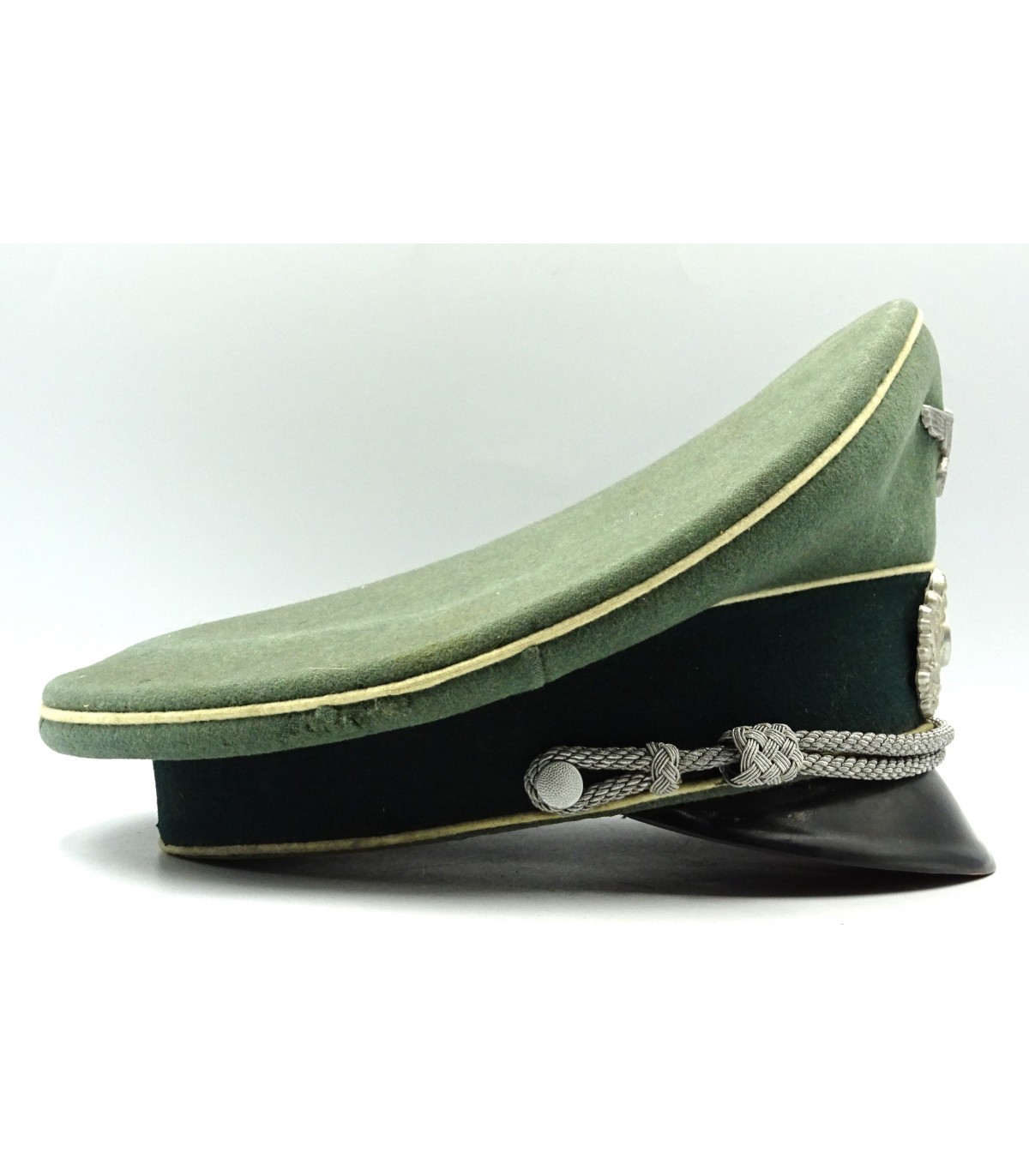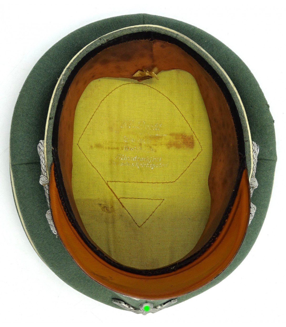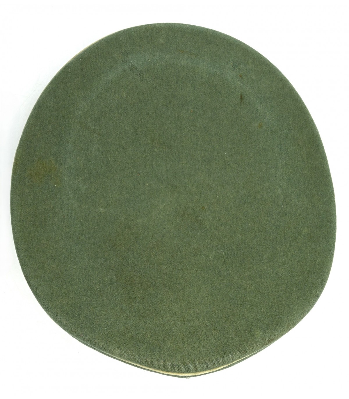 Completo. Cappuccio in pelle di cervo feldgrau. Stemmi in alluminio (all'aquila è rimasta una sola staffa). Alcuni fori di tarme nella fascia verde scuro. Bella presentazione. ABE.