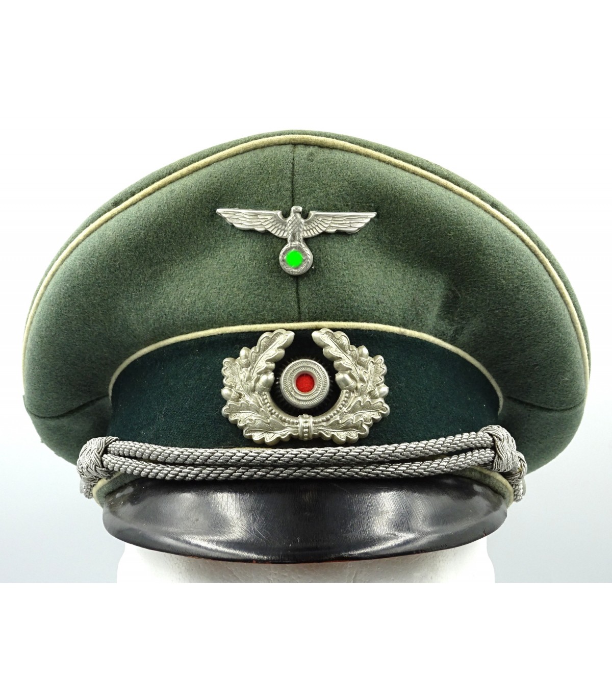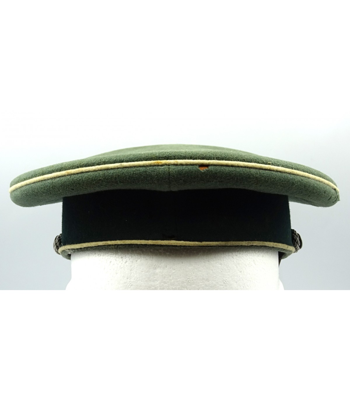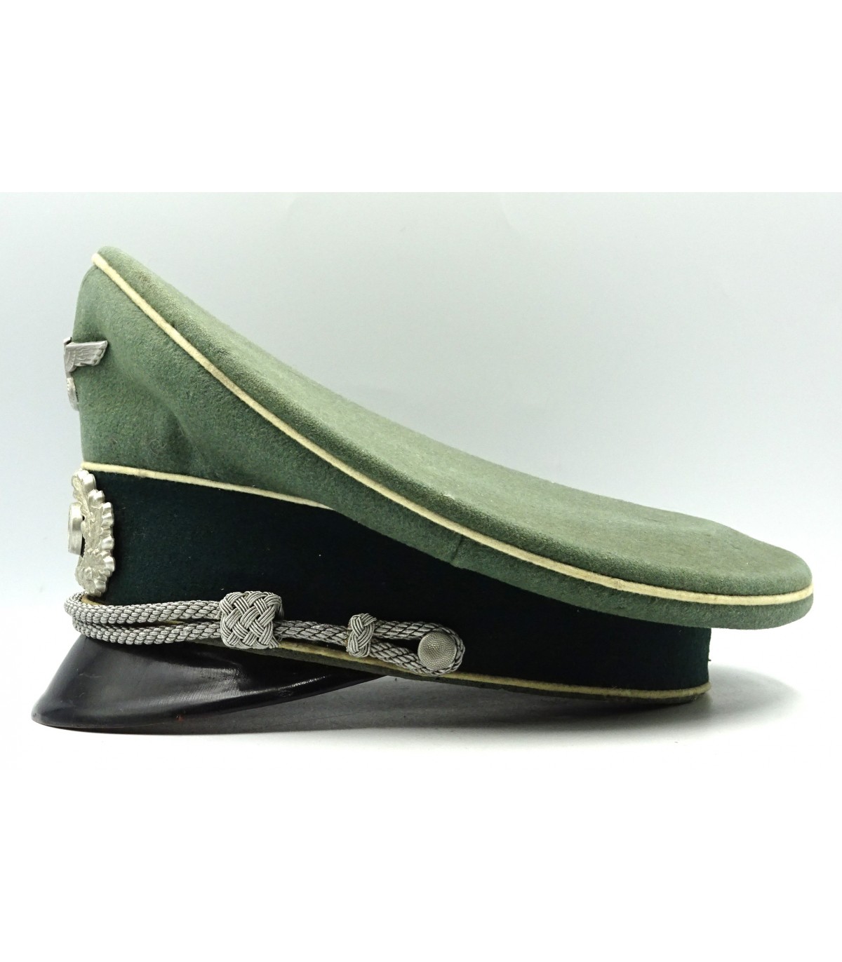 Completo. Cappuccio in pelle di cervo feldgrau. Stemmi in alluminio (all'aquila è rimasta una sola staffa). Alcuni fori di tarme nella fascia verde scuro. Bella presentazione. ABE.