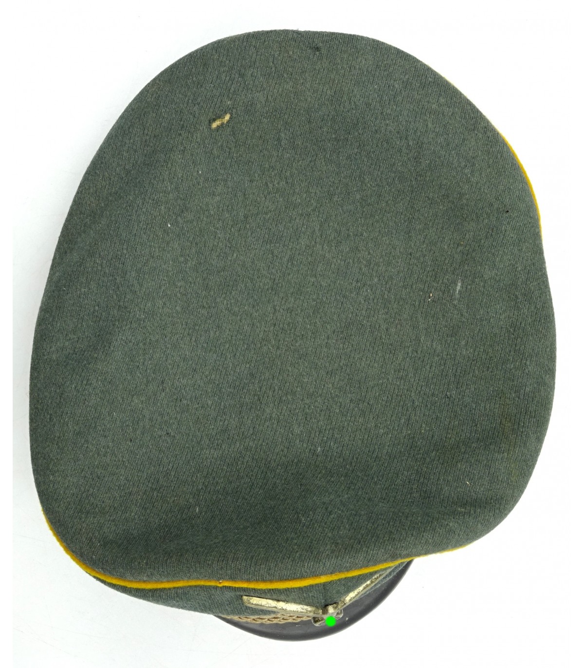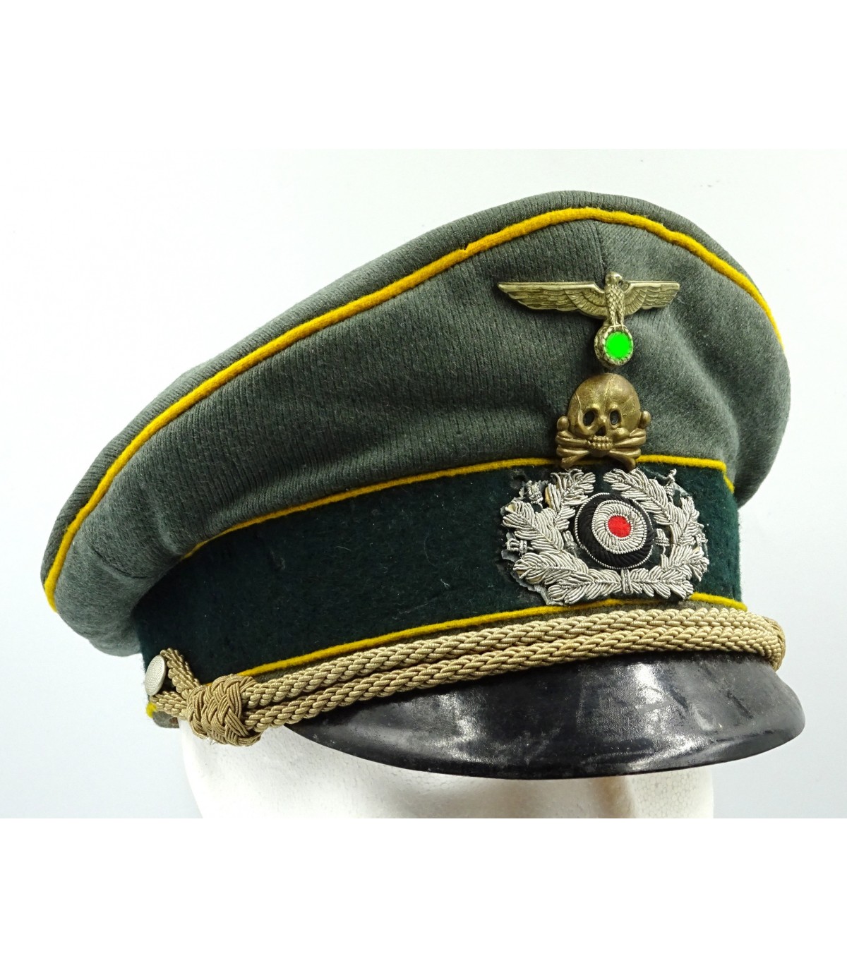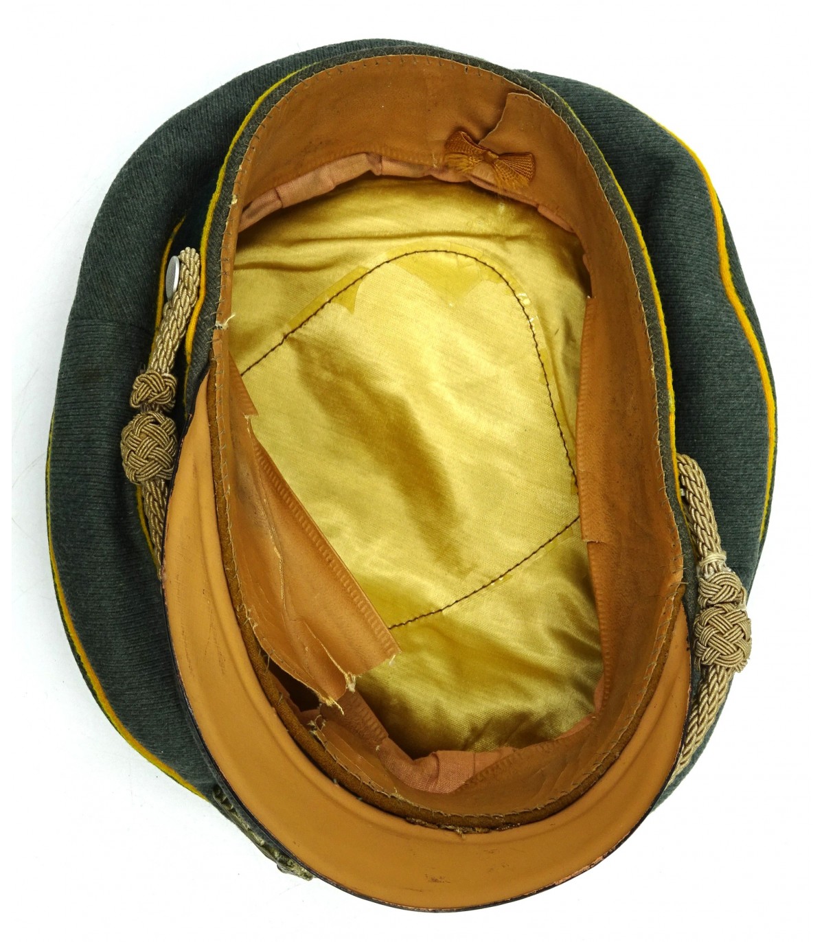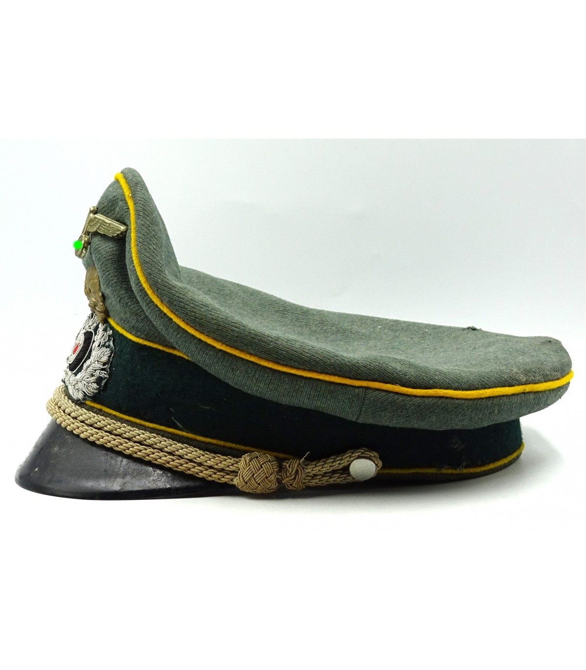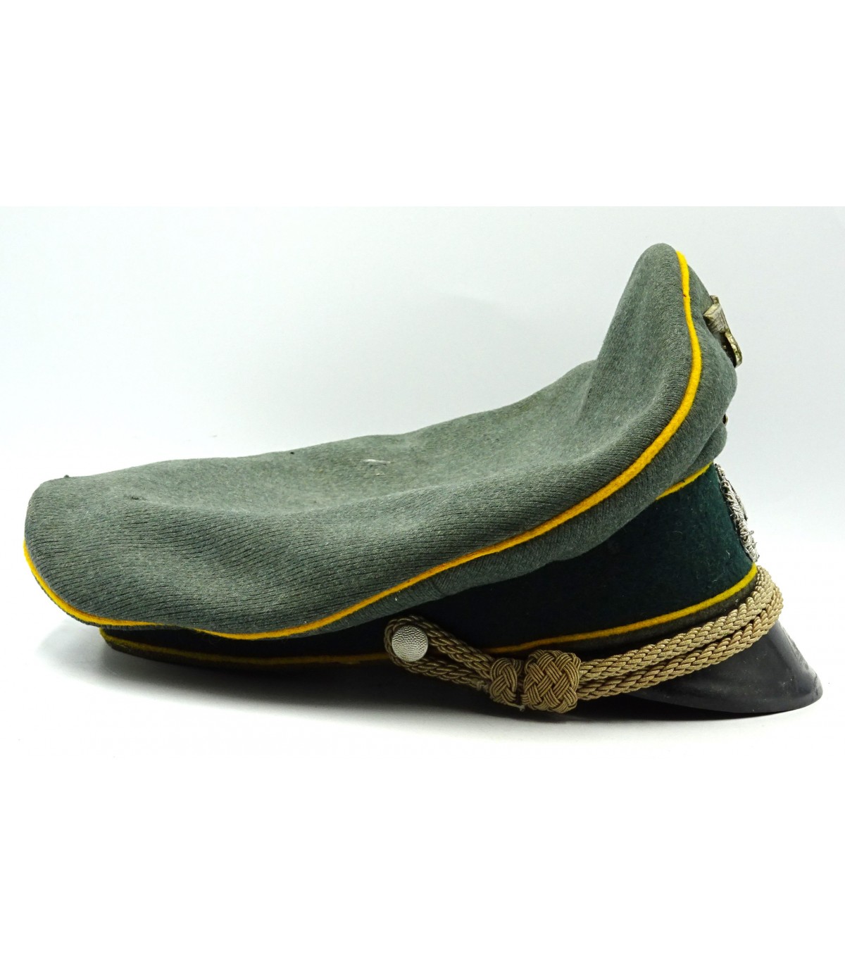 Bellissima forma alta, copricapo in tessuto a maglia feldgrau, profili giallo oro. Foglie di quercia ricamate a mano e coccarda in canetille di alluminio, aquila in alpacca. Fori di tarme, soprattutto nella fascia di sudore verde scuro. fascia per il sudore non sostituita. ABE.