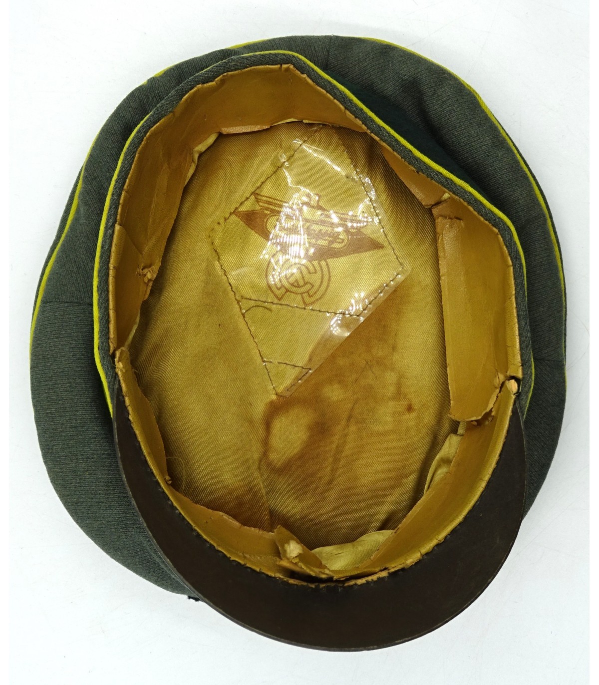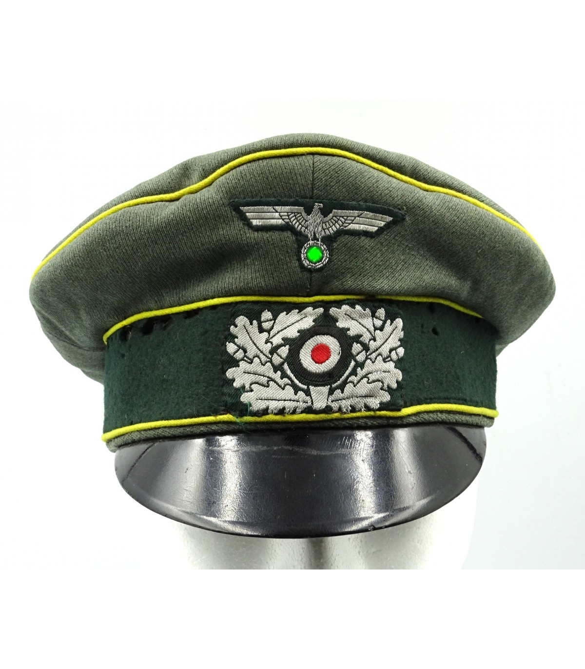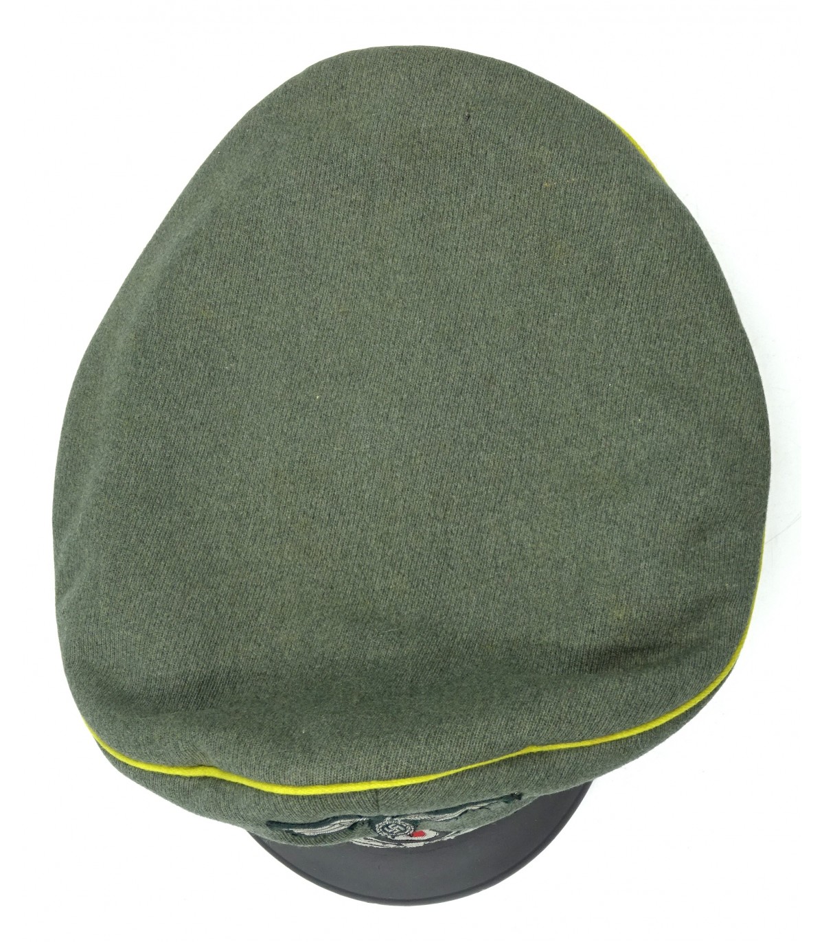 Berretto morbido vecchio stile con insegne tessute, indossato senza cordino. Visiera in fibra vulcanizzata. Fori di tarme nella fascia verde scuro. Berretto in maglia feldgrau. Fascia antisudore in pelle, rodhoïd Erstklassig. ABE.