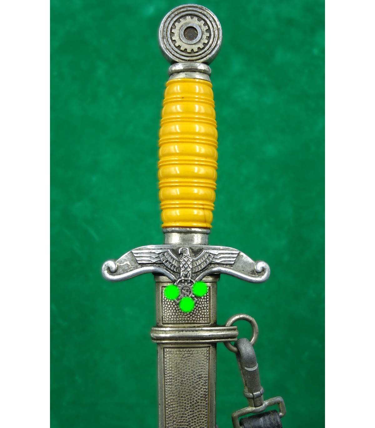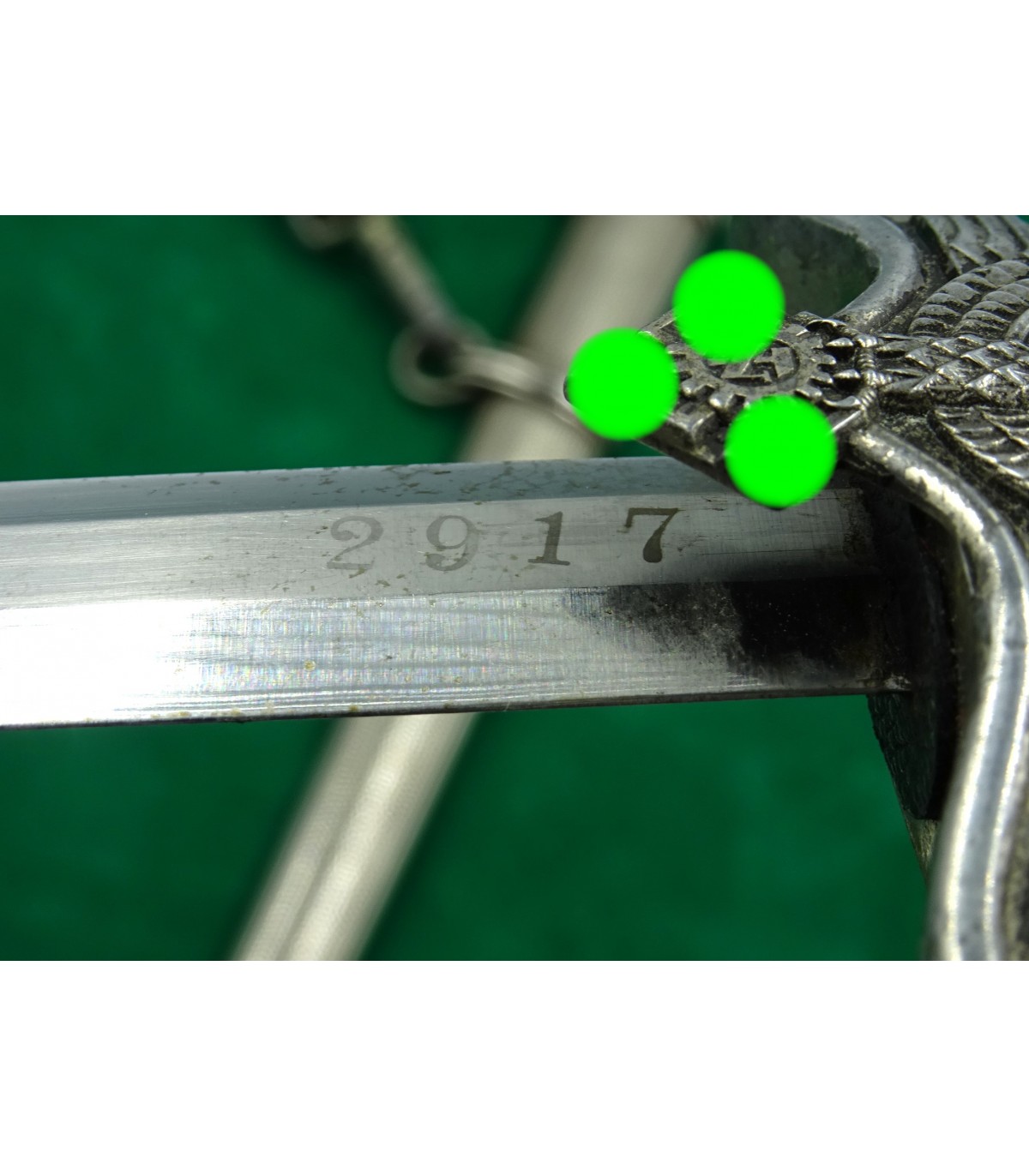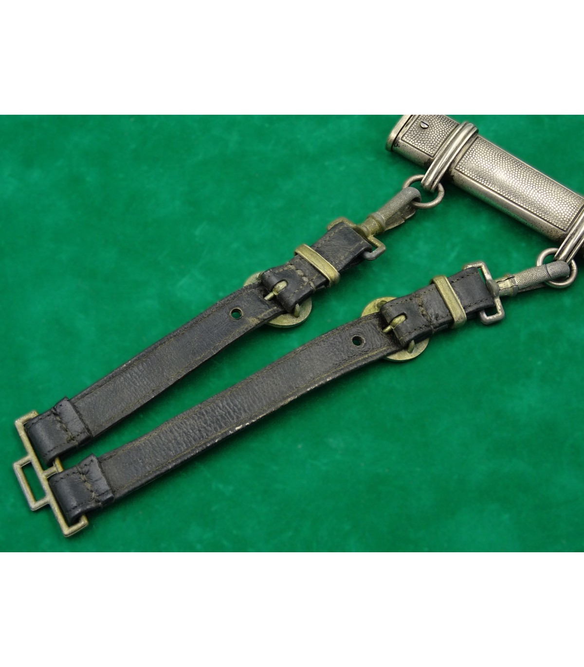 Mooie en zeldzame Teno officiersdolk van Eickhorn Solingen. Gele kling met kleine haartjes aan de achterkant onderaan. N° 2917 op de kling en bij de ingang van de schede. Mooie kling. Met lederen sluiting, Assmann ringen. BE-TBE.