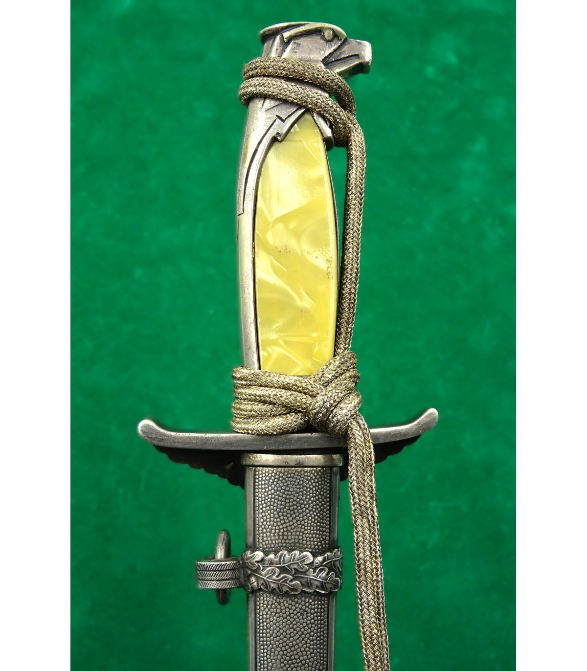 Een mooi vroeg werk van Siegfried Waffen, die heel weinig van deze dolk maakte in tegenstelling tot Alcoso en Eickhorn, met een meer esthetisch handvat dan zijn concurrenten. Het gebruik van nikkel zilver duidt op vooroorlogse productie. Geen schade aan de schede. 4' markering op de meeste onderdelen (zie foto's). Speciaal koord van zilverdraad. BE-TBE.