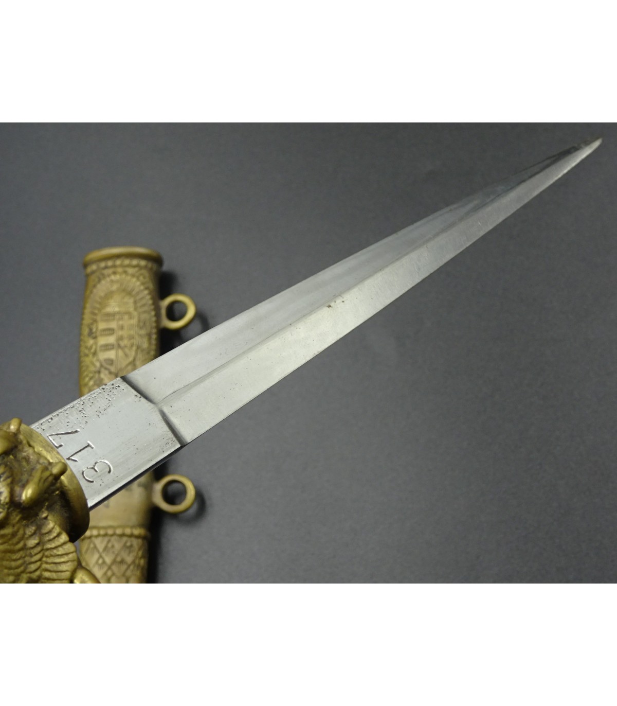 Brons, ebbenhouten spindel. Genummerd 317. Een paar vlekjes op het ricasso van de kling, verder BE-TBE.