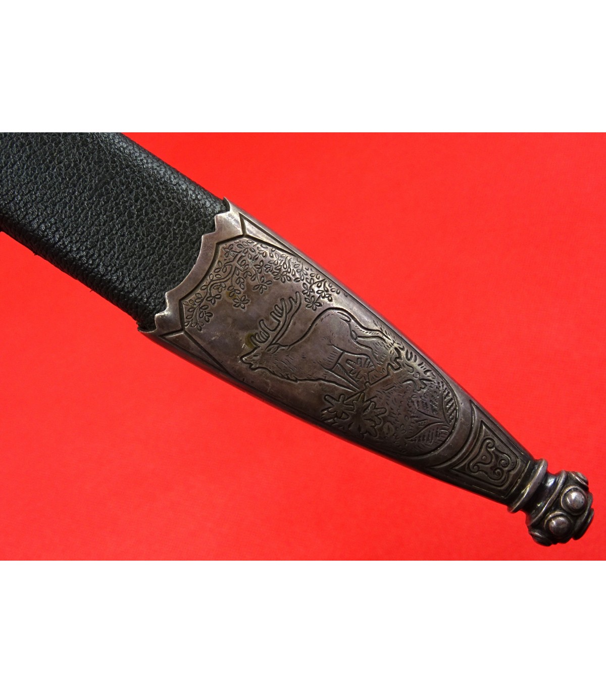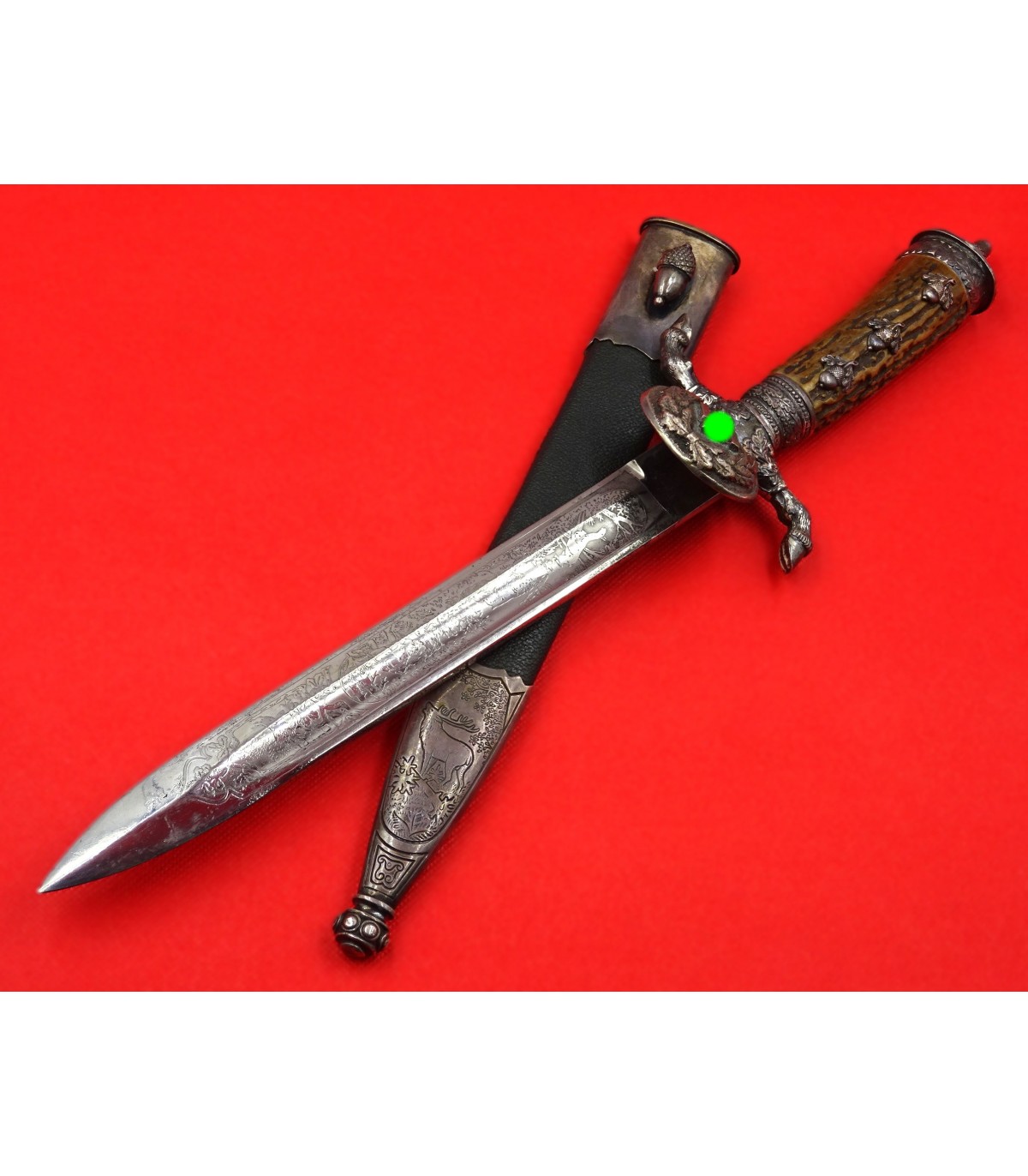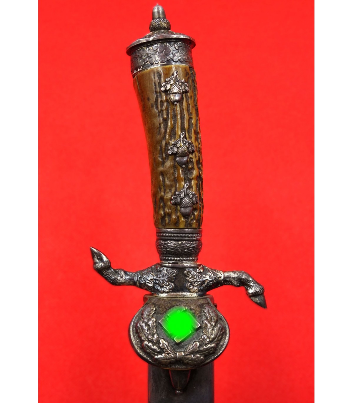 Handvat van hoorn, zilverbeslag, mooie kling met jachtversiering aan beide zijden. Groen lederen schede. Lengte 44 cm. Schitterend!