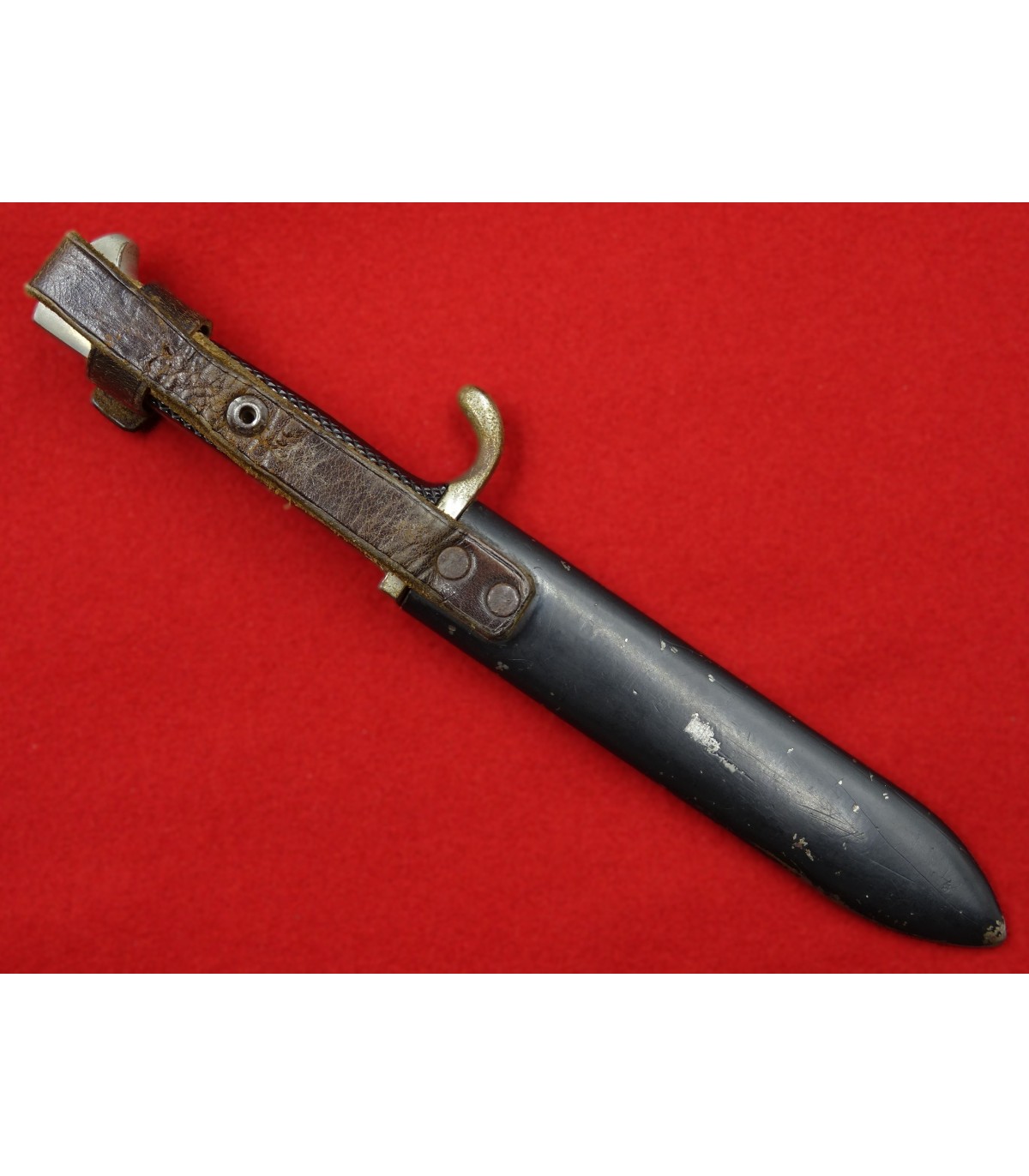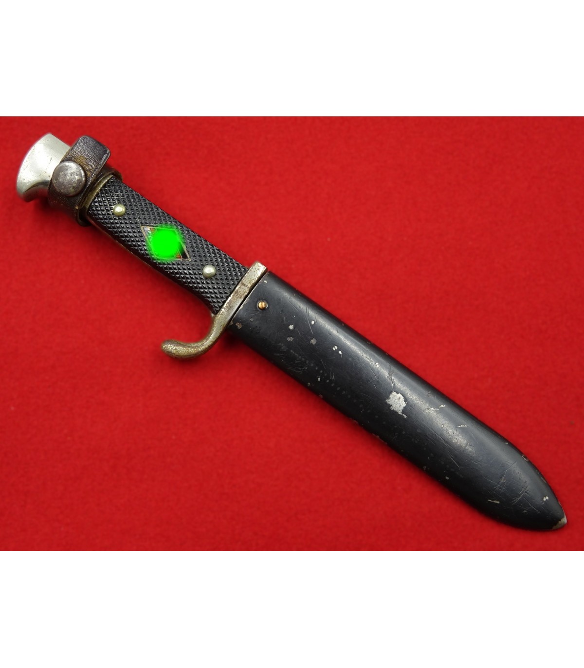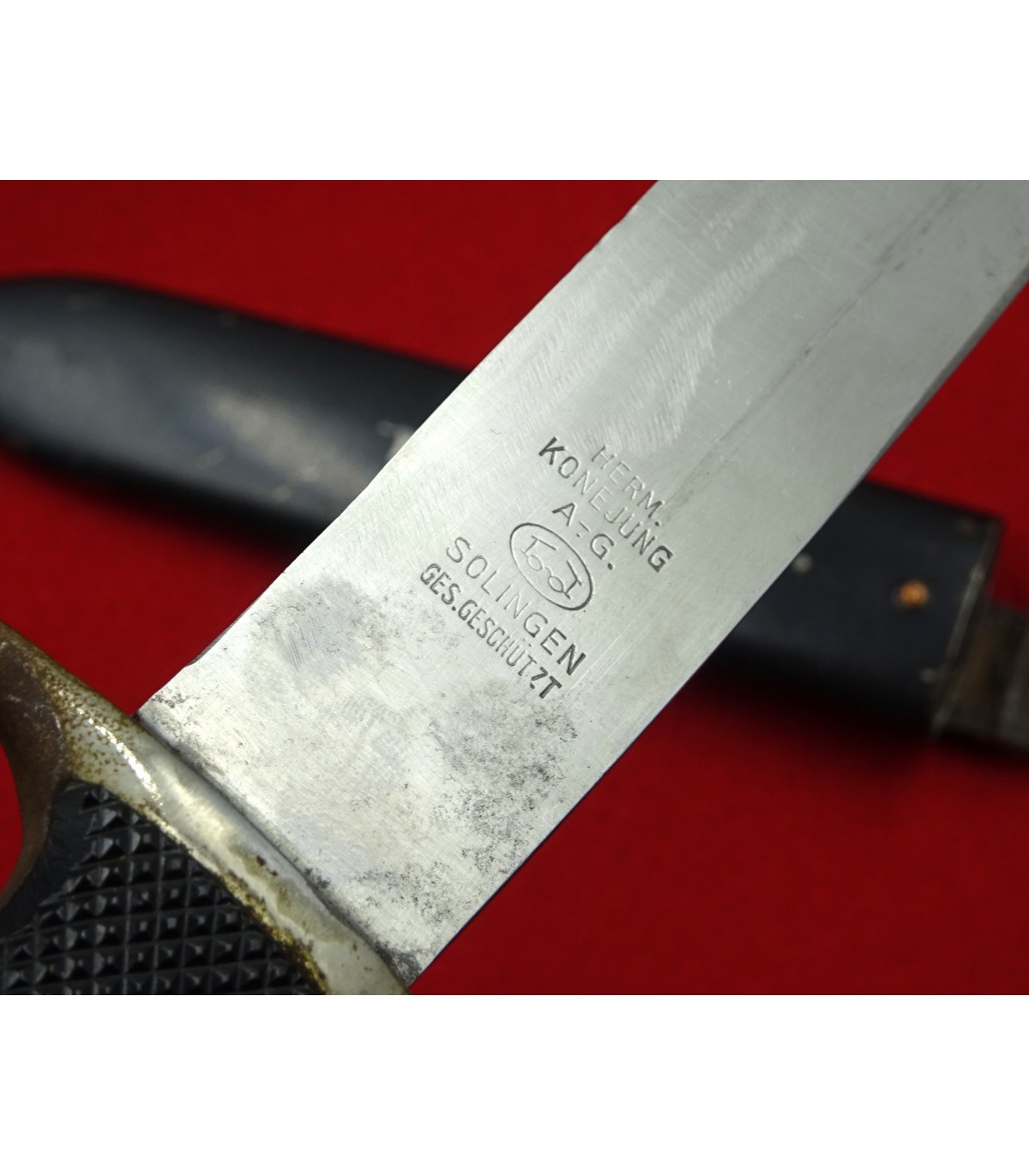 Vervaardigd door Herm.Konejung Solingen ges.geschütz. 1e model, kling zonder ricasso met motto 'Blut und Ehre!' (geen motto na 1938). Een klein chipje in het zwarte email van het handvat embleem verder BE-TBE. De schede is voor 95% gelakt. Een zeldzaam item.
