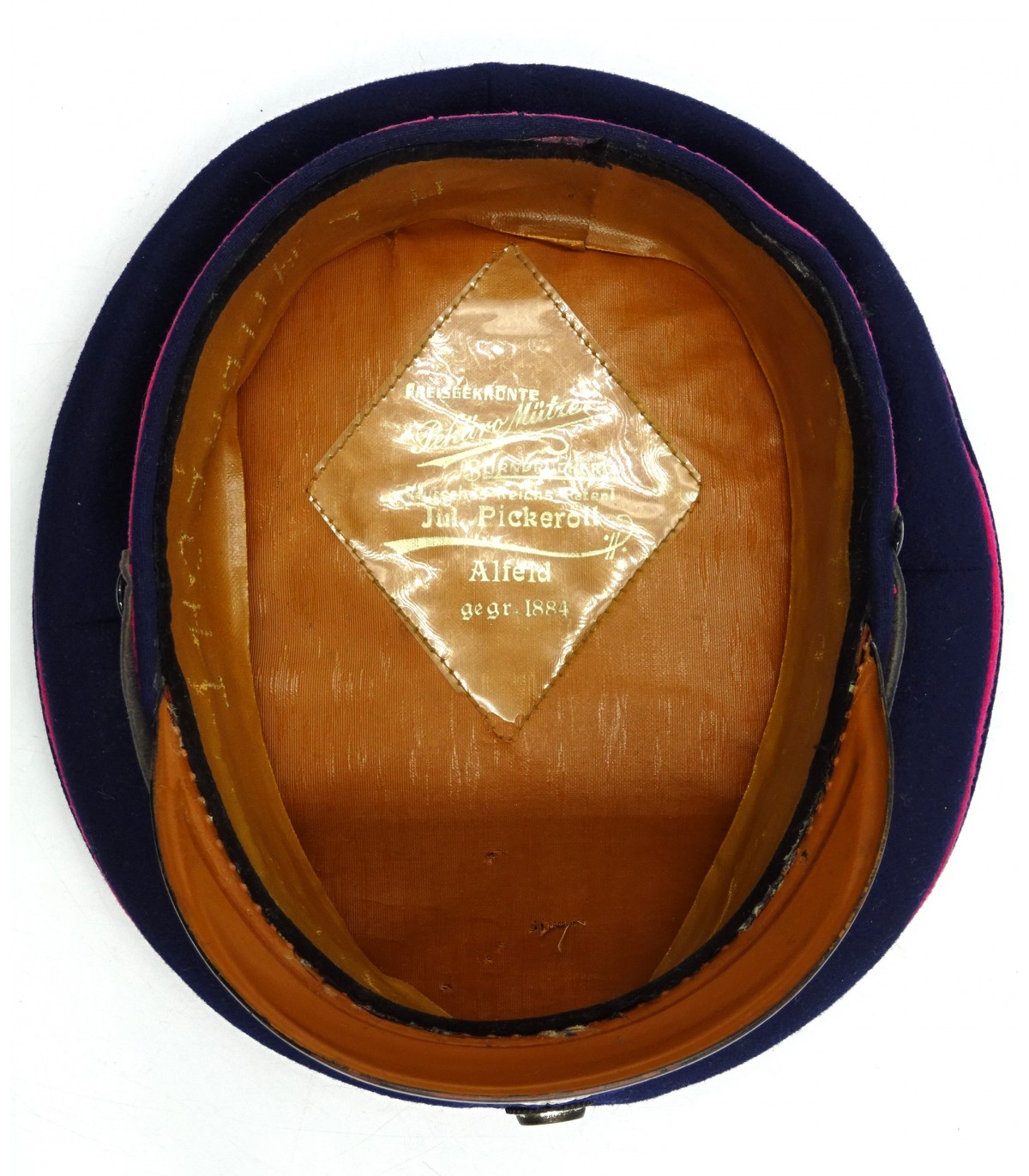 Compleet. Alu politie adelaar. Mooie hoge vorm. Vervaardigd door Peküro. Eigenaarsnaam in zweetband van gewaxt canvas. Een paar motgaten. ABE.
